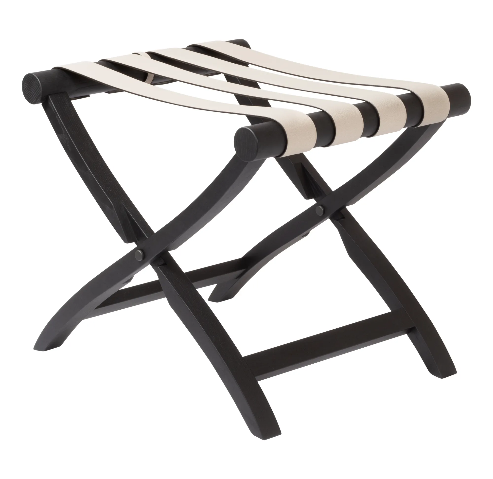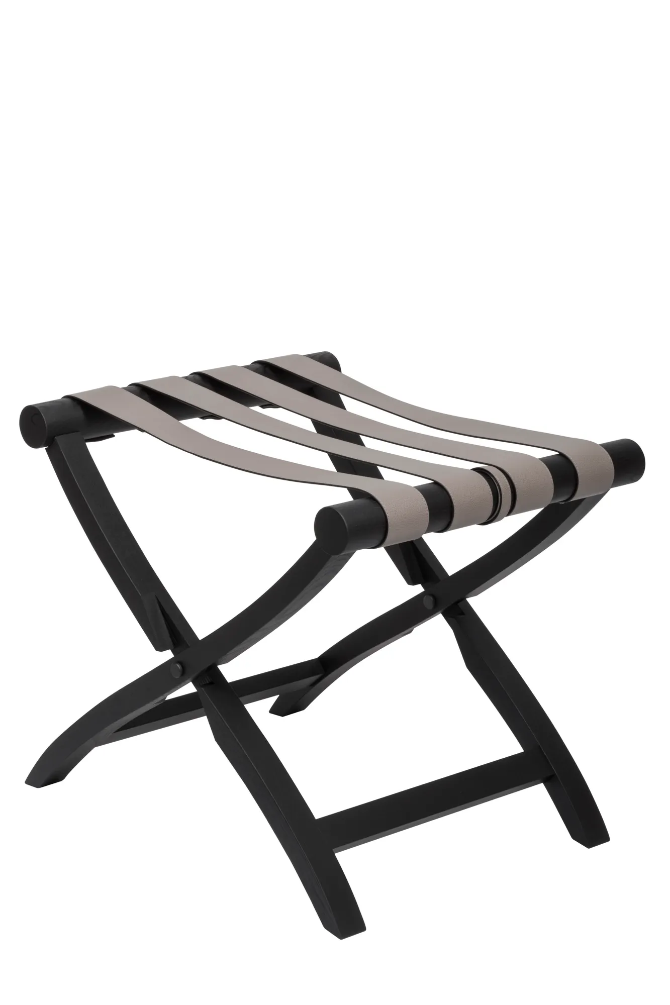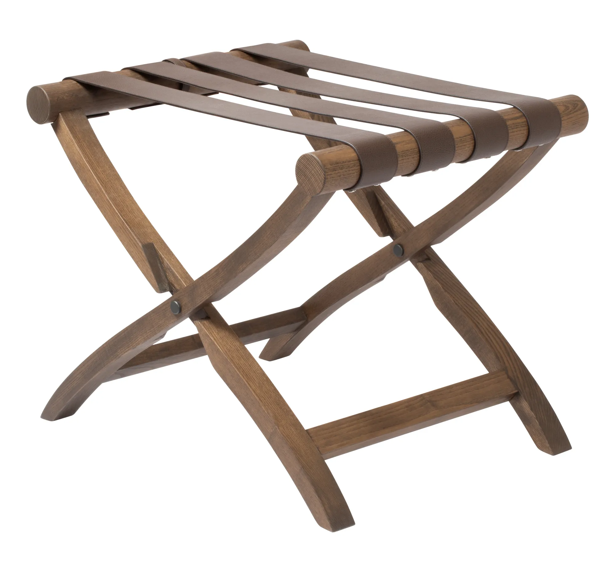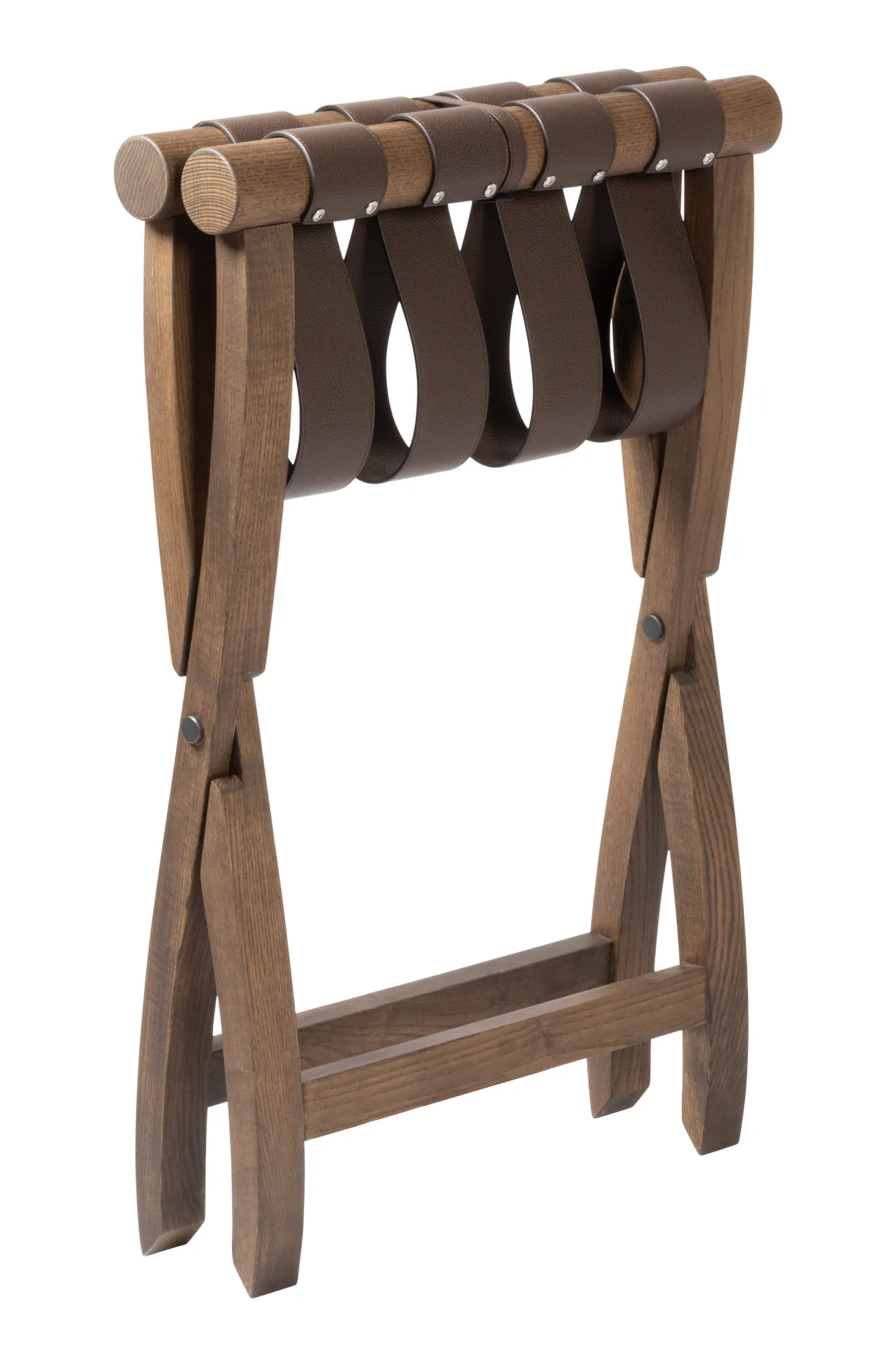 Sturdy oak folding structure in oak with leather stripes as seat. Provided with brass joints.