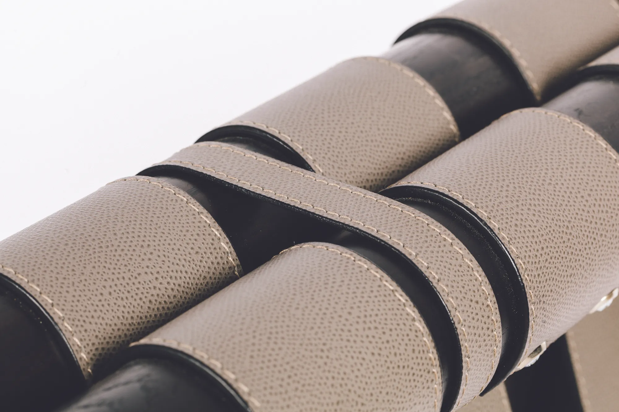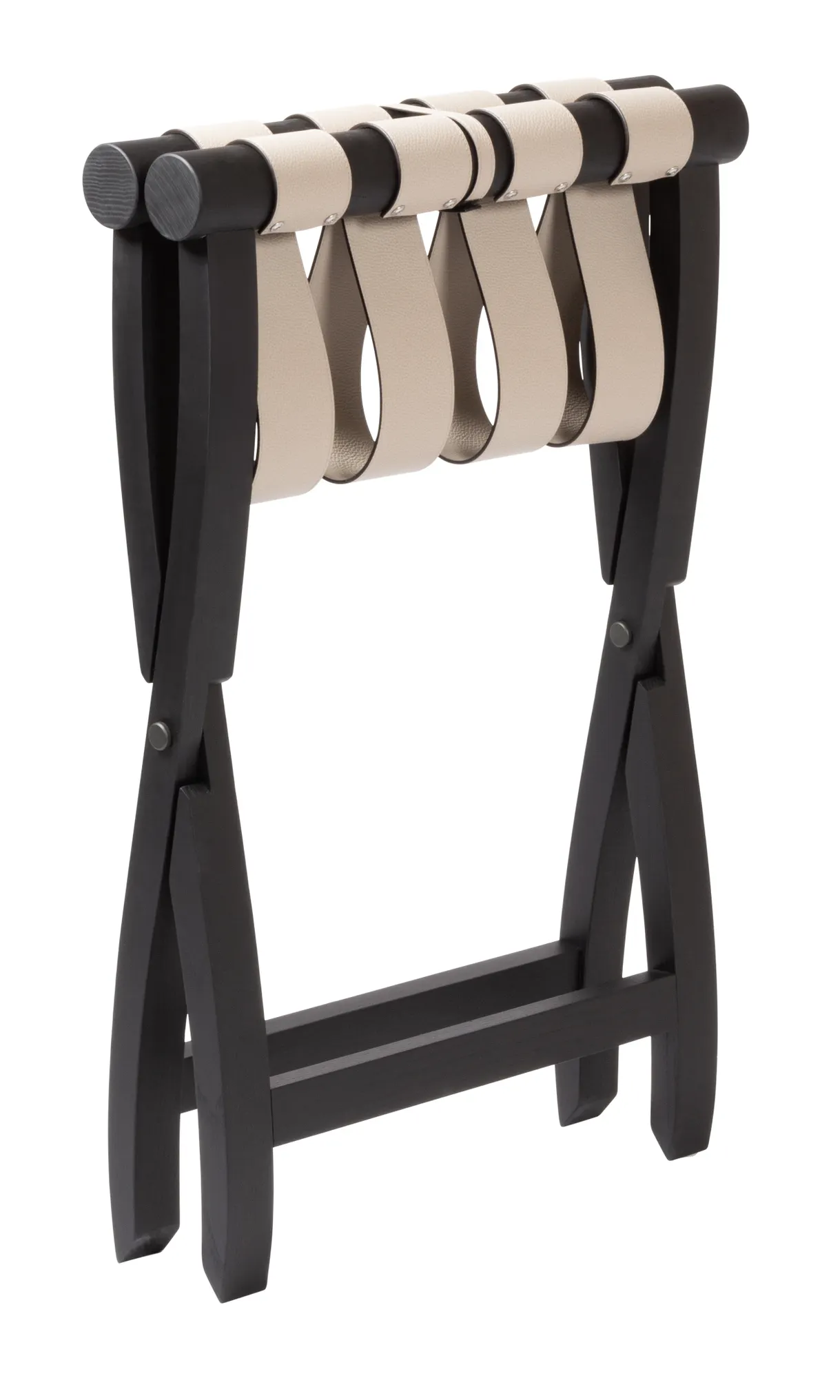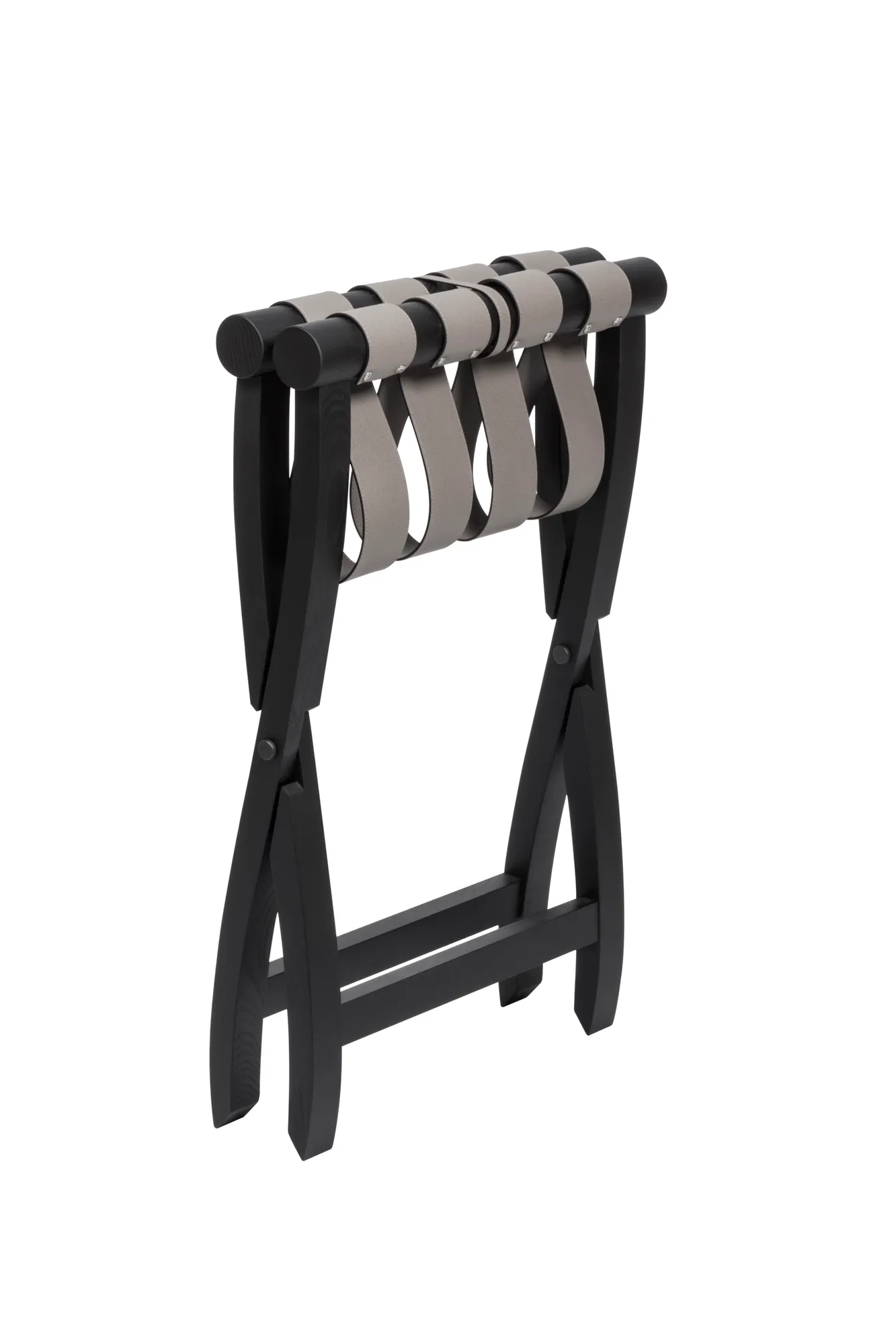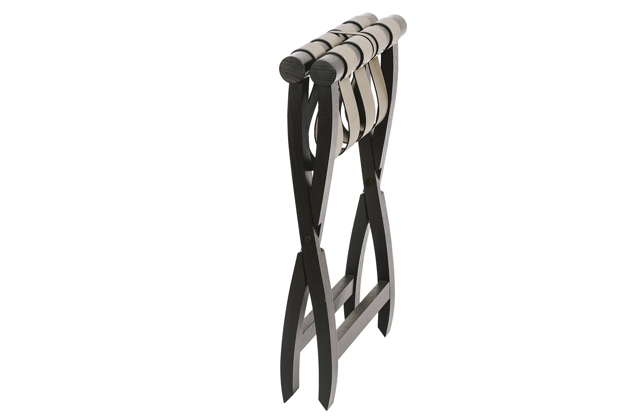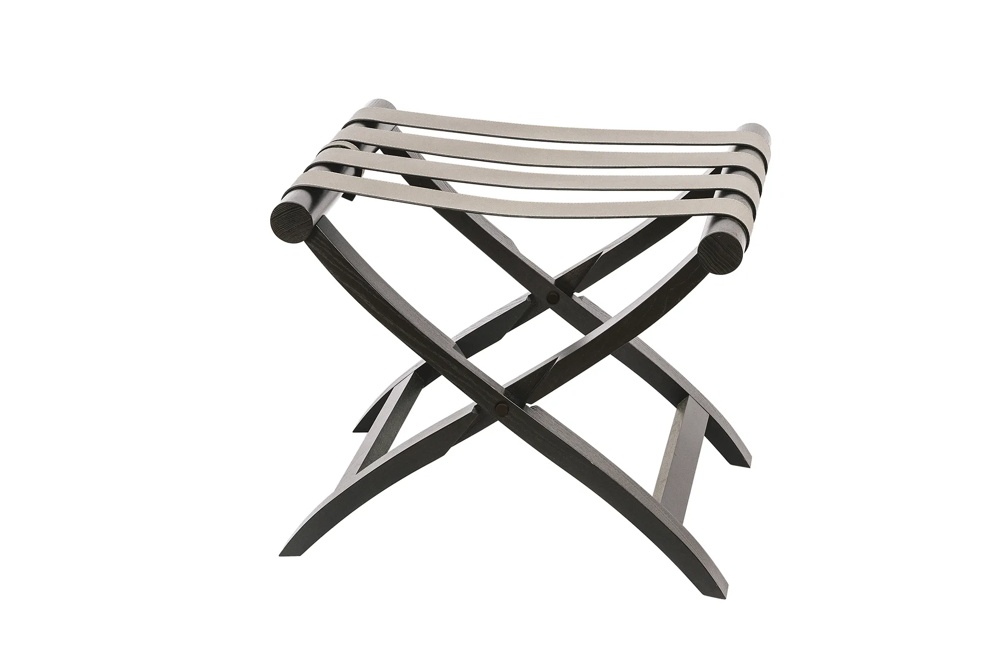 Sturdy oak folding structure in oak with leather stripes as seat. Provided with brass joints.