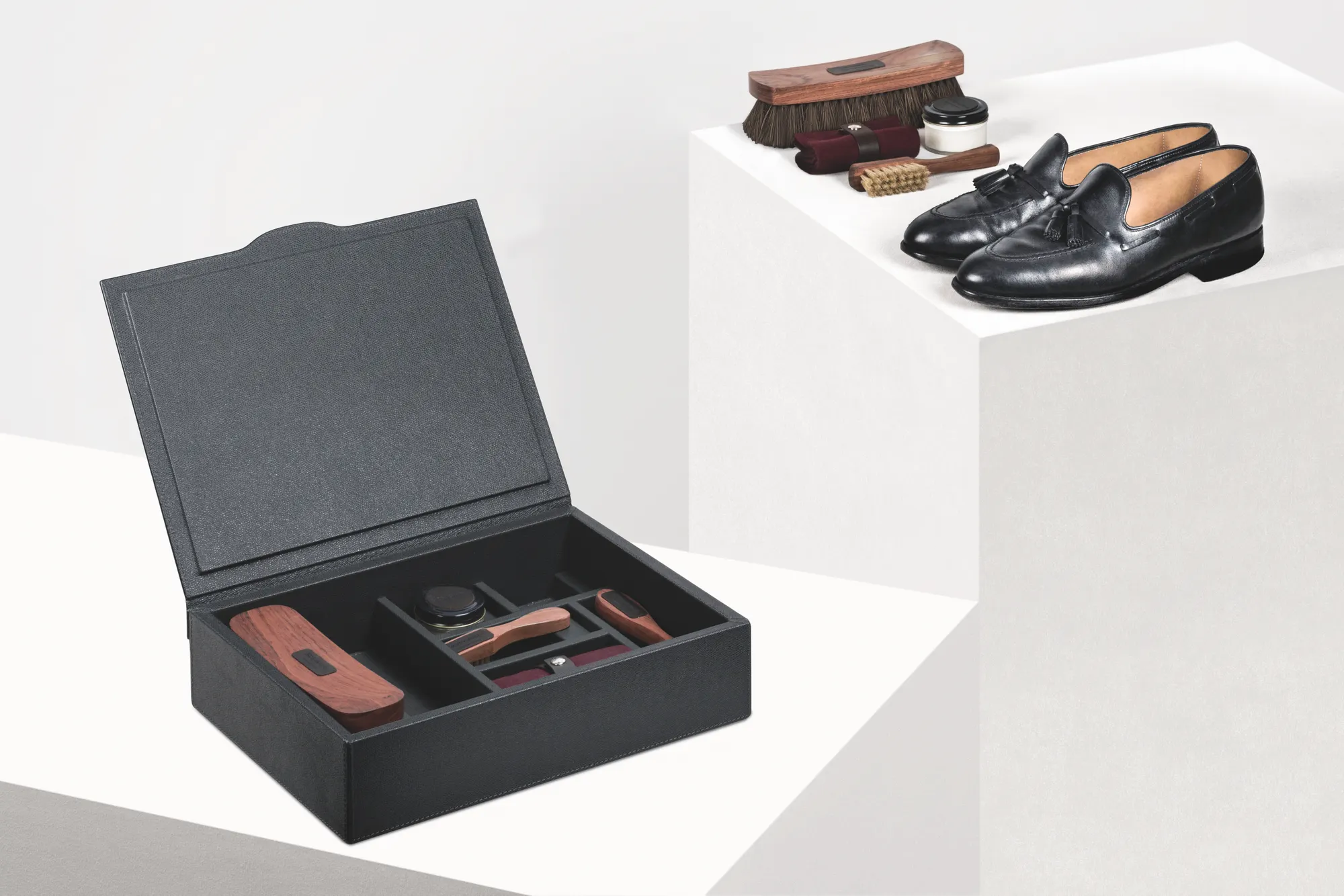 Box with leather covered wood structure and partitions, provided with hinged lid. Set equipped with the following tools: 2 shine brushes with horsehair bristles, 2 polish application brushes with horsehair bristles, 1 mini brush with synthetic and brass bristles for suede, 2 soft shine cloths, 2 shoe polish pastes. All brushes have bubinga wood structure.