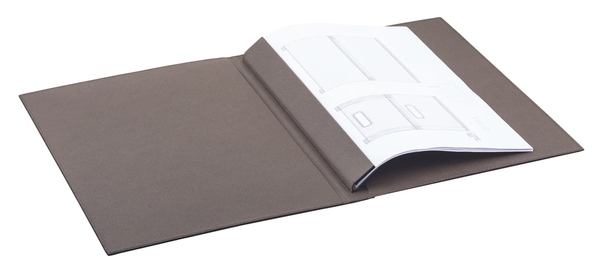 Leather covered heavy magnetic flaps able to keep together up to 6mm thick sheets. All-leather structure with soft padding. Ideal for project presentations and home-printed newspapers used during cruises. Leather covered inner heavy magnetic flaps able to keep together up to 6mm thick sheets.