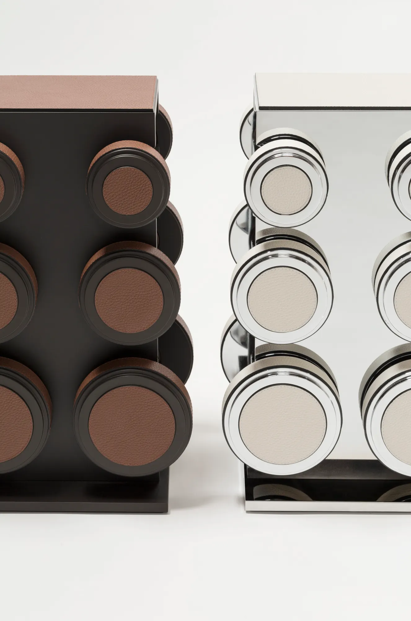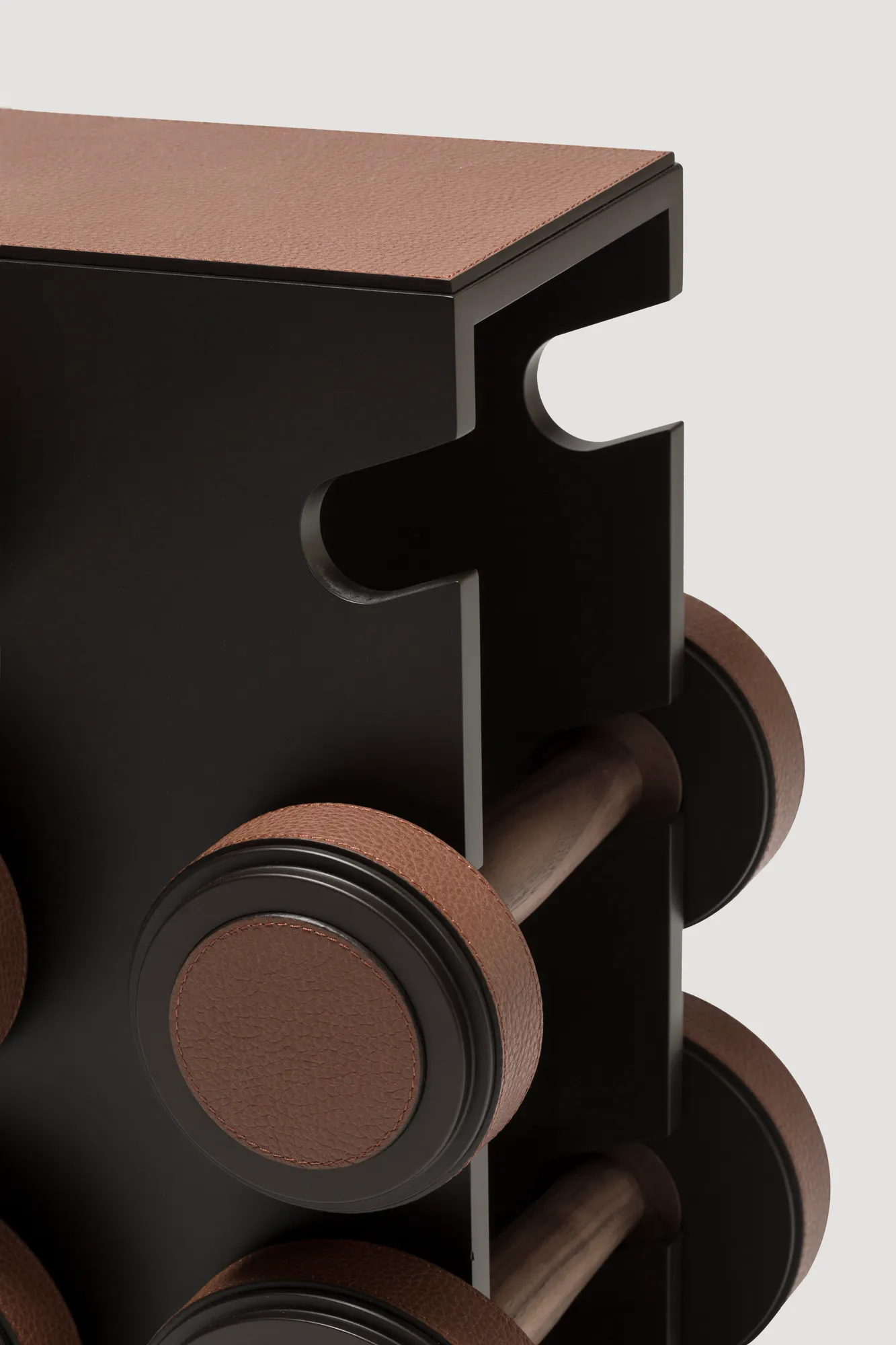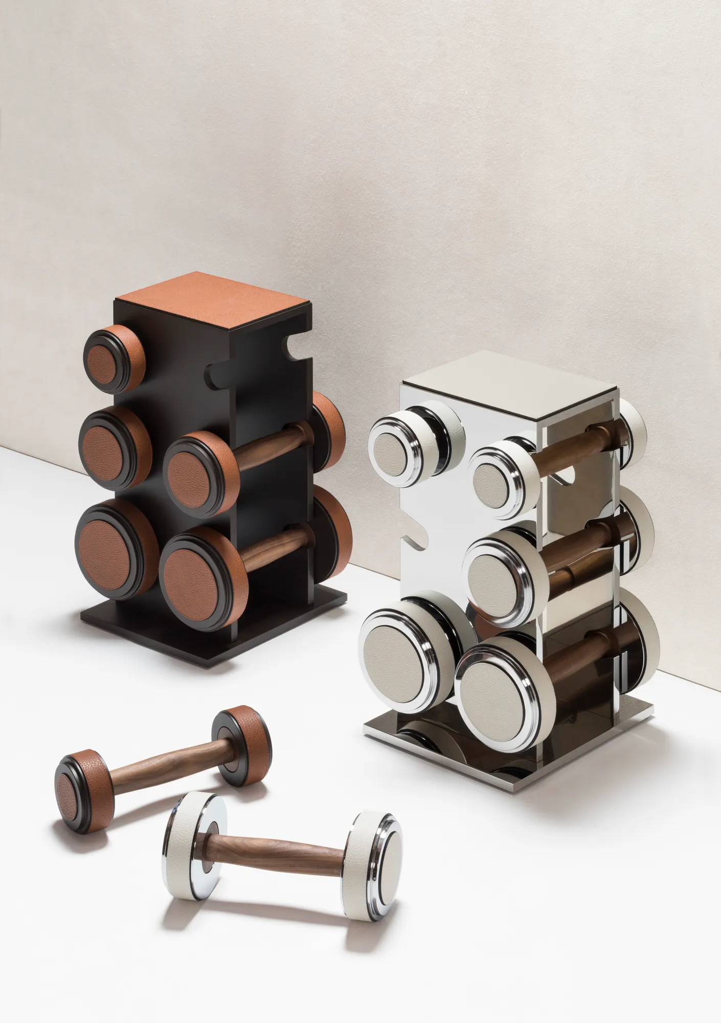 Metal structure available in different finishes and provided with leather inserts and walnut wood grip. Custom sizes available on request.