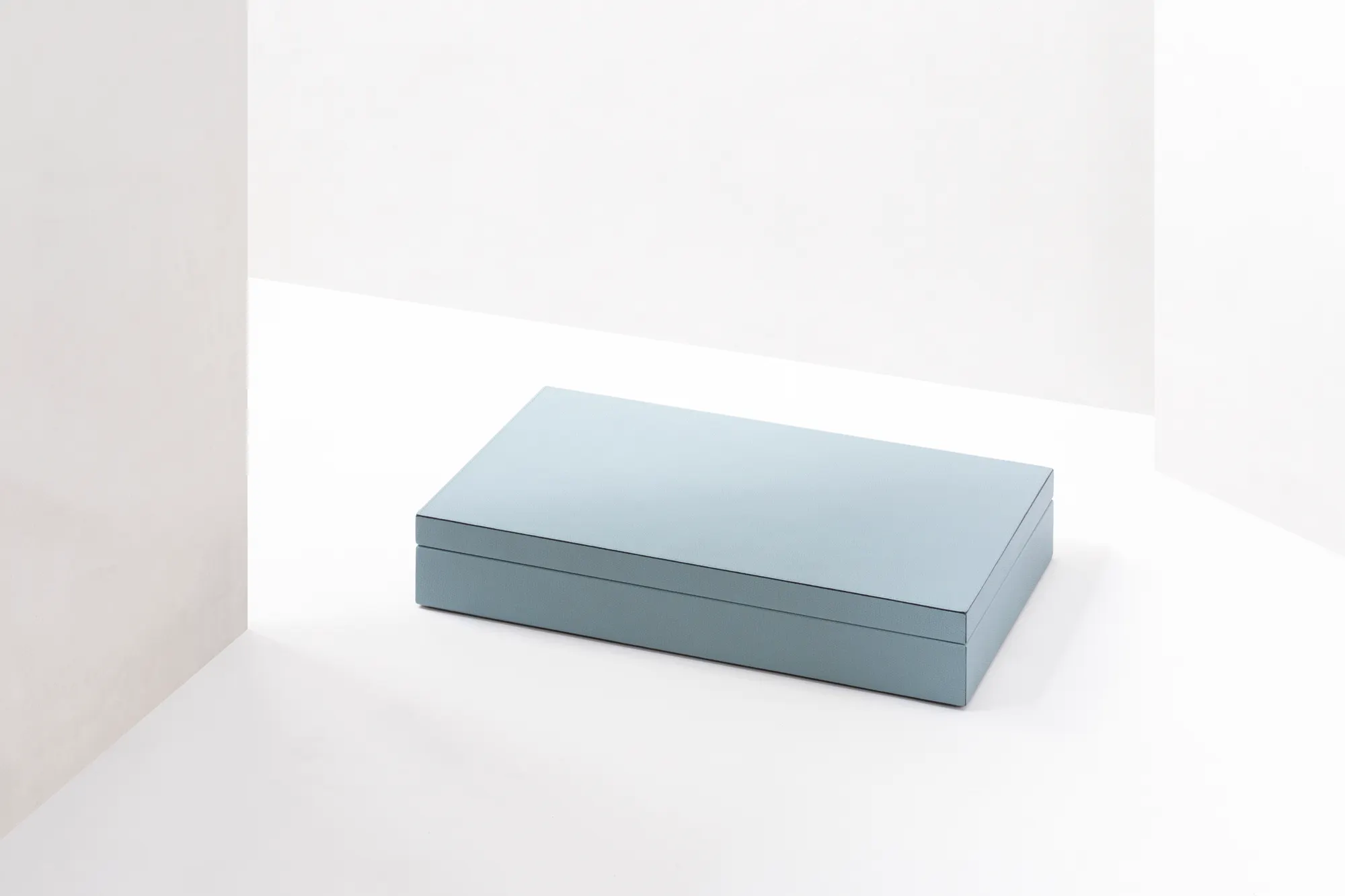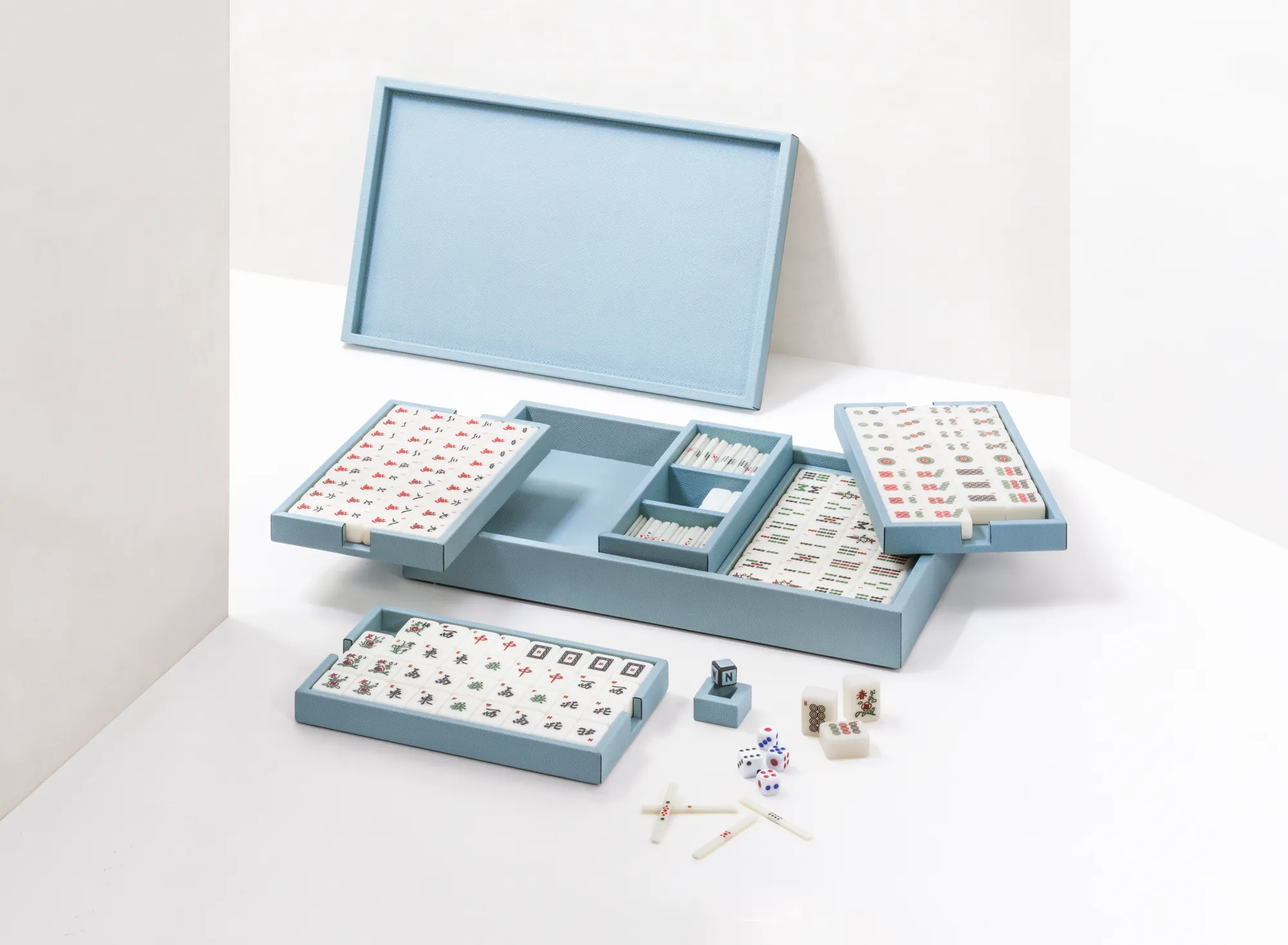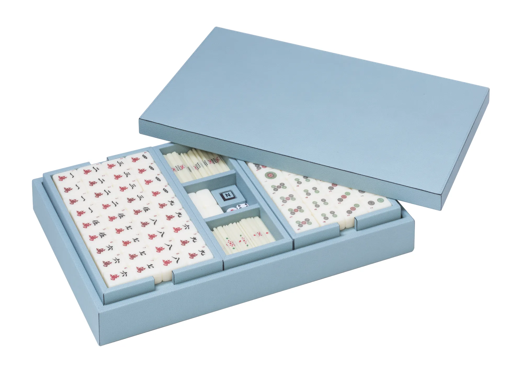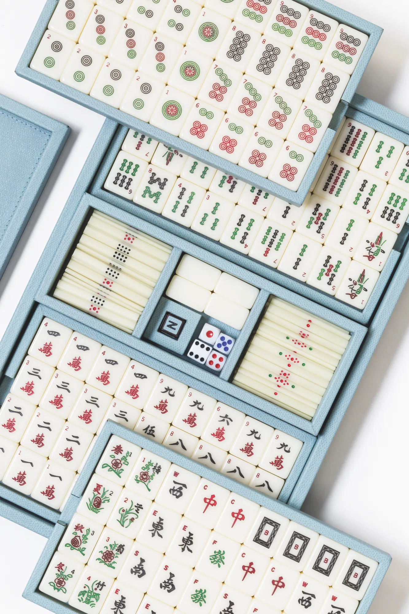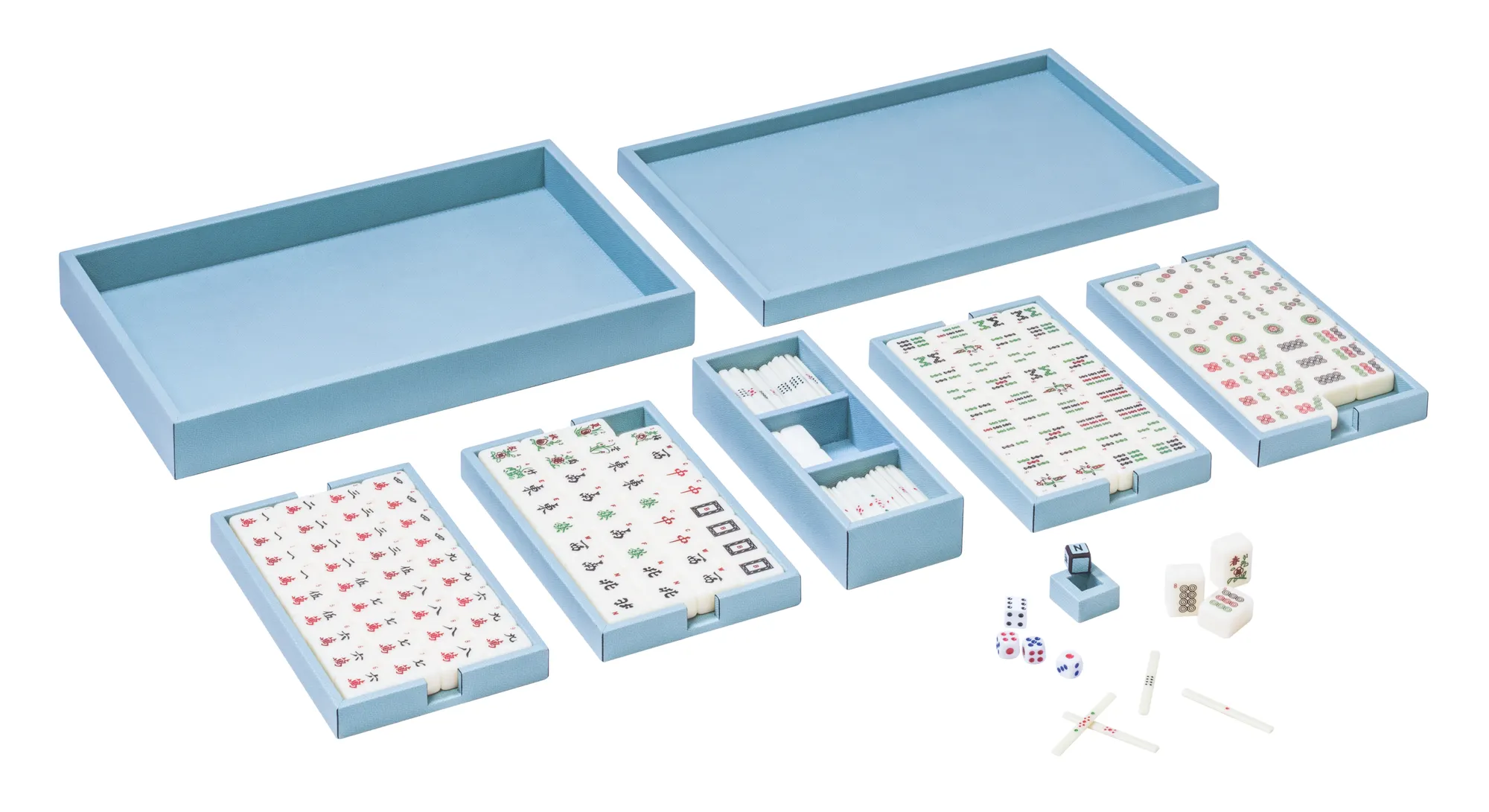 Presented in a precious leather-covered wood case with removable top, this set is a stunning gift for any board game enthusiast. Includes one set of high quality bakelite tiles and sticks, three standard dice and one larger dice. Features a leather-covered dice (with north, south, east and west labeled sides) to determine the seating arrangement and who will begin play.
