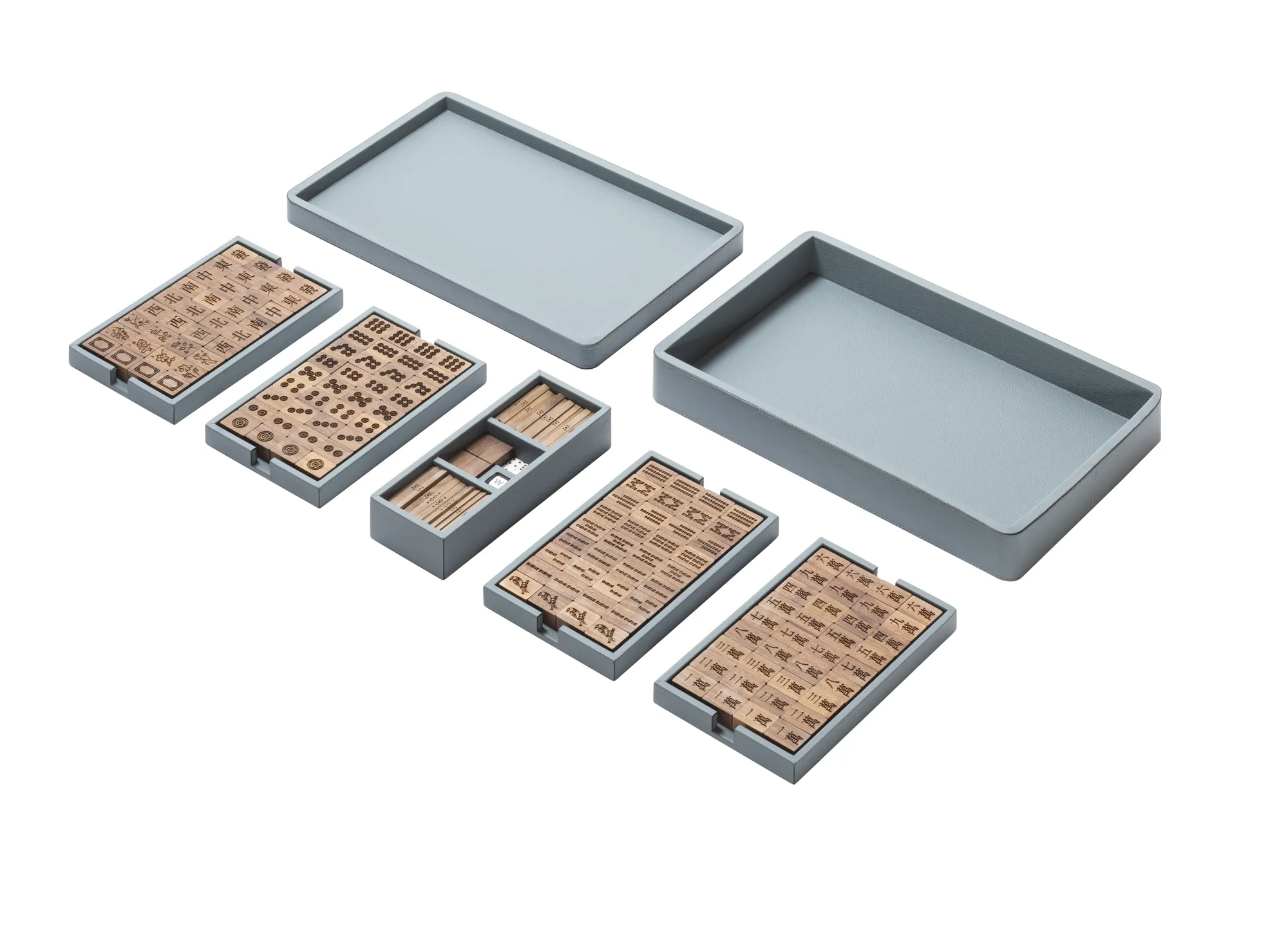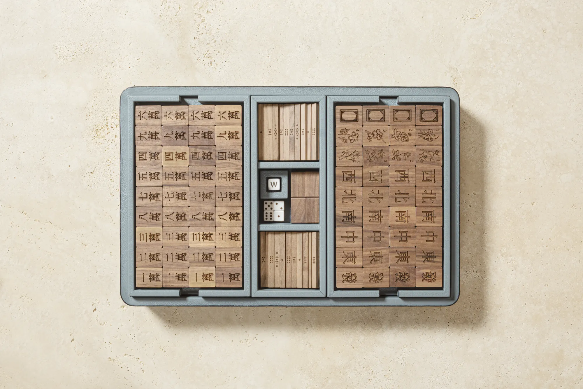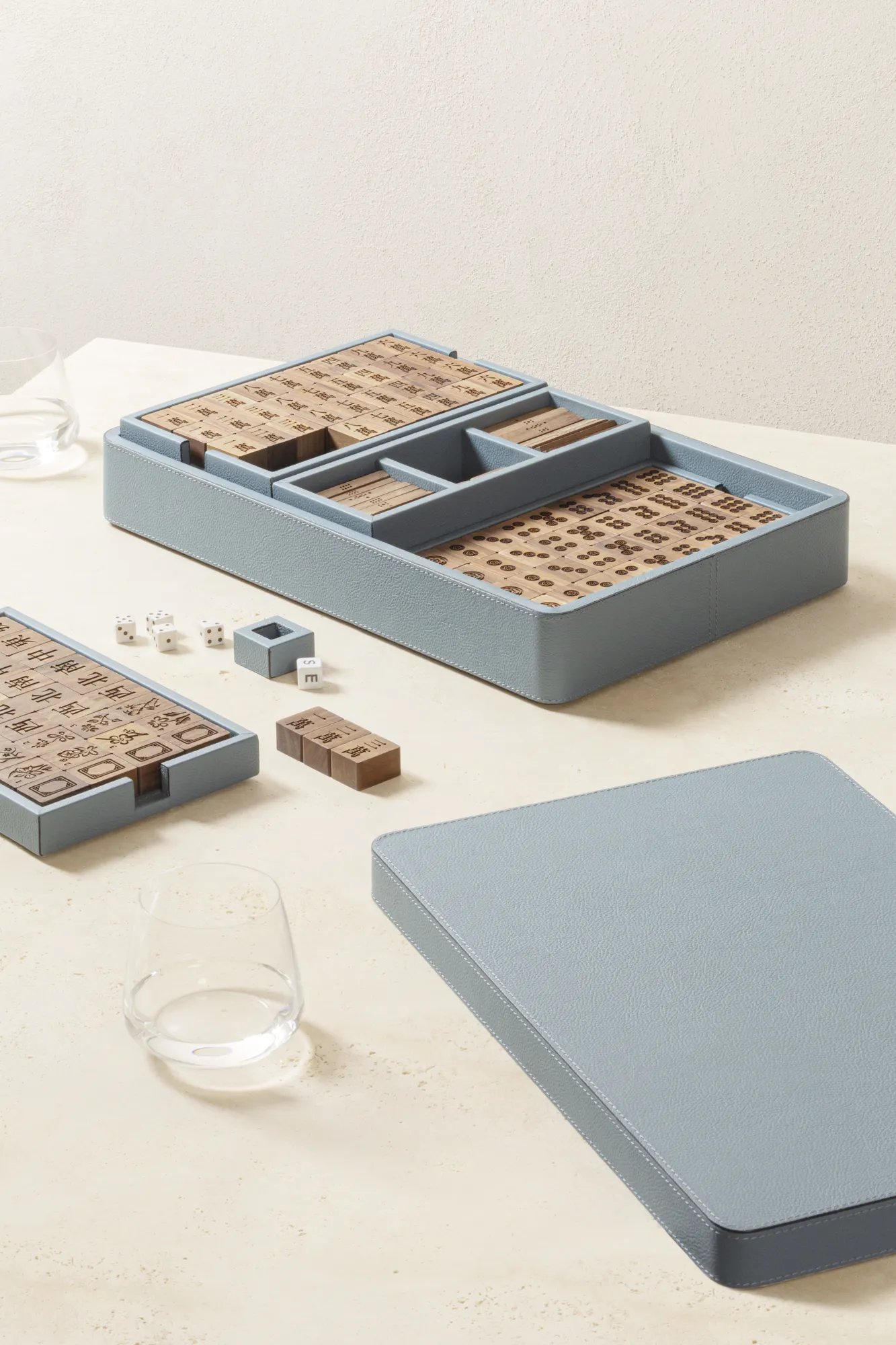 Traditional Chinese tile-based game that has gained popularity worldwide during the 1920s. Presented in a precious leather-covered wood case with removable top, this set makes an amazing gift for any board game enthusiast. The set includes: 148 engraved walnut wood and maple tiles (144 with symbols and characters + 4 plain) 244 walnut wood sticks 4 opaque plexiglass dice 1 leather-covered wind indicator dice Entirely made in Pelle Frau®.