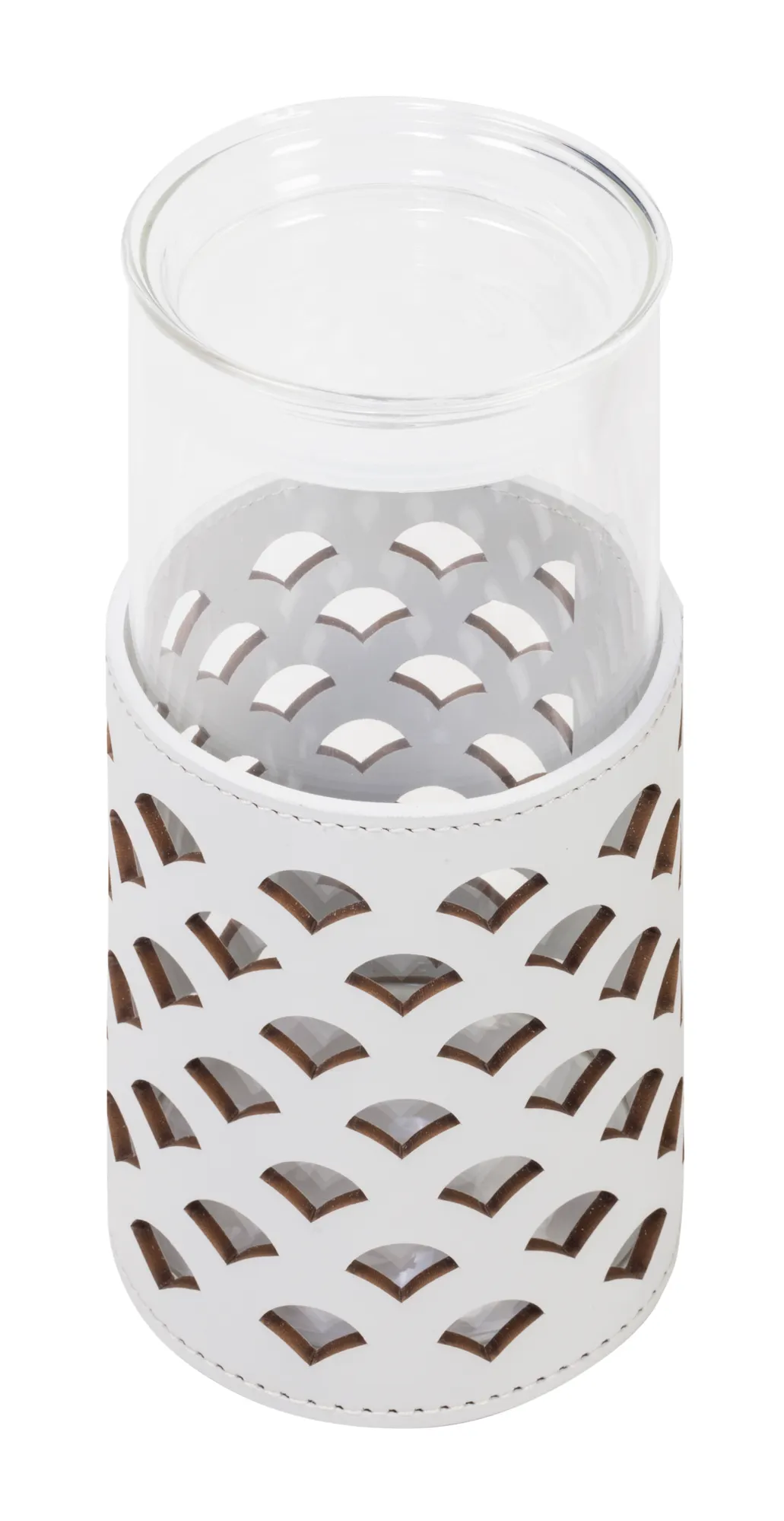 Transparent borosilicate glass partially dressed in finest regenerated leather with water-resistant and UV-resistant finish. Non-slip waterproof rubber base underneath. Removable cover for easy cleaning.