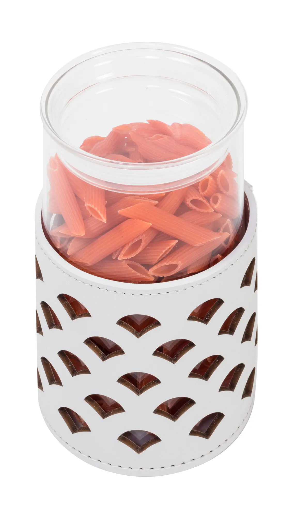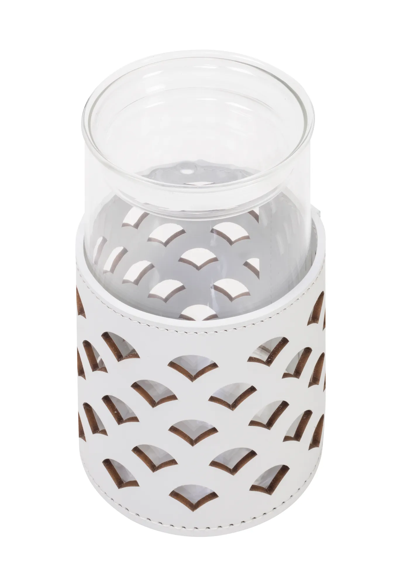 Transparent borosilicate glass partially dressed in finest regenerated leather with water-resistant and UV-resistant finish. Non-slip waterproof rubber base underneath. Removable cover for easy cleaning.