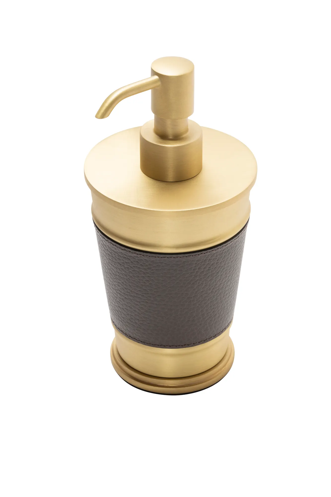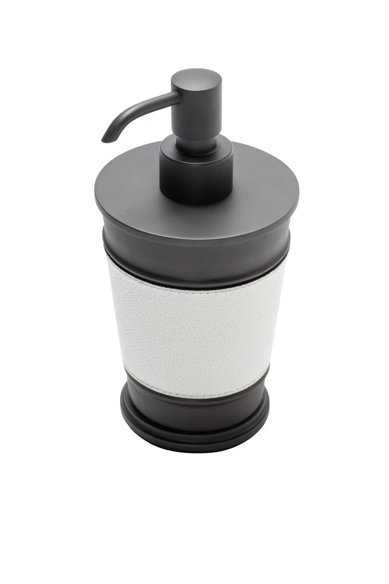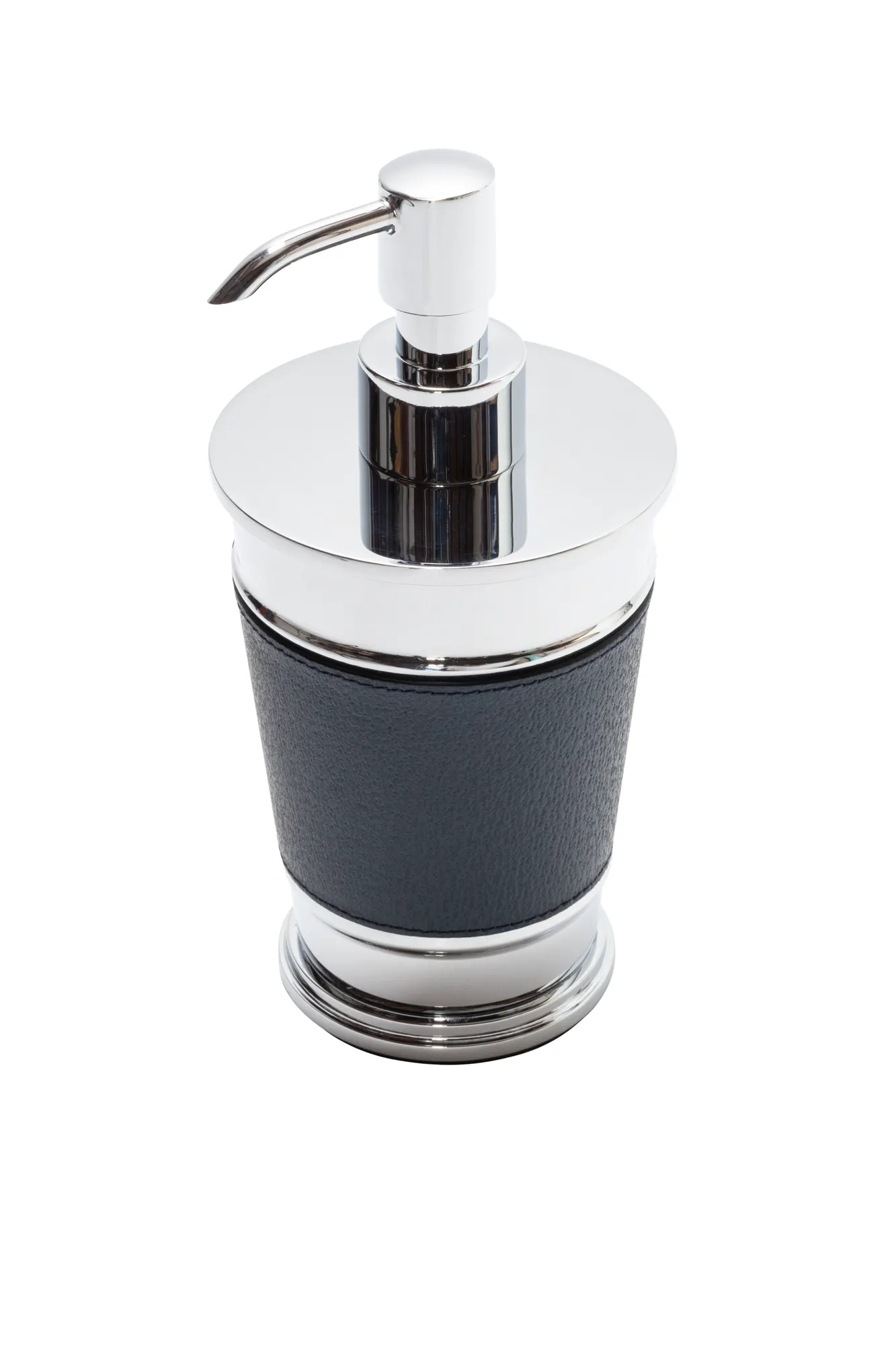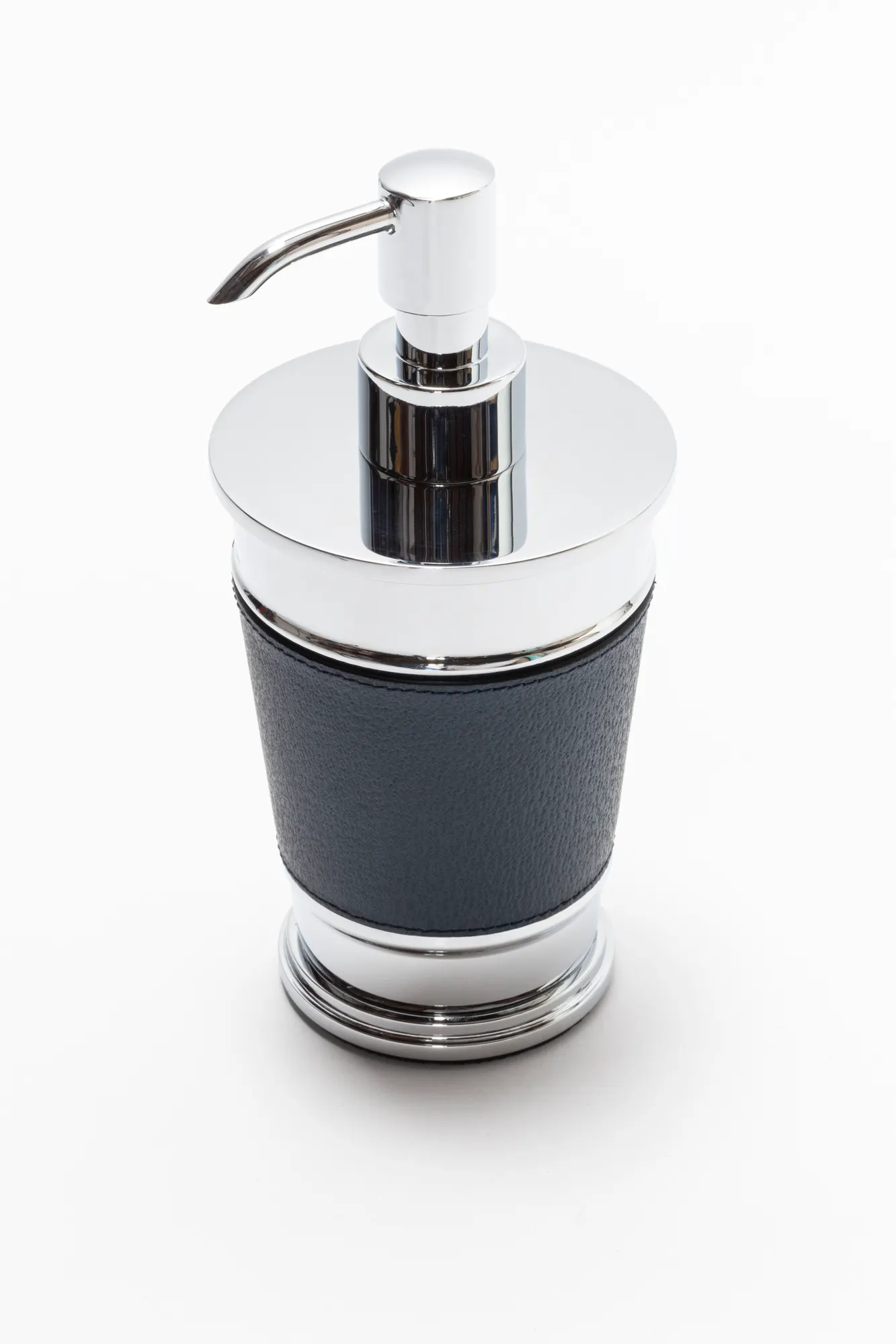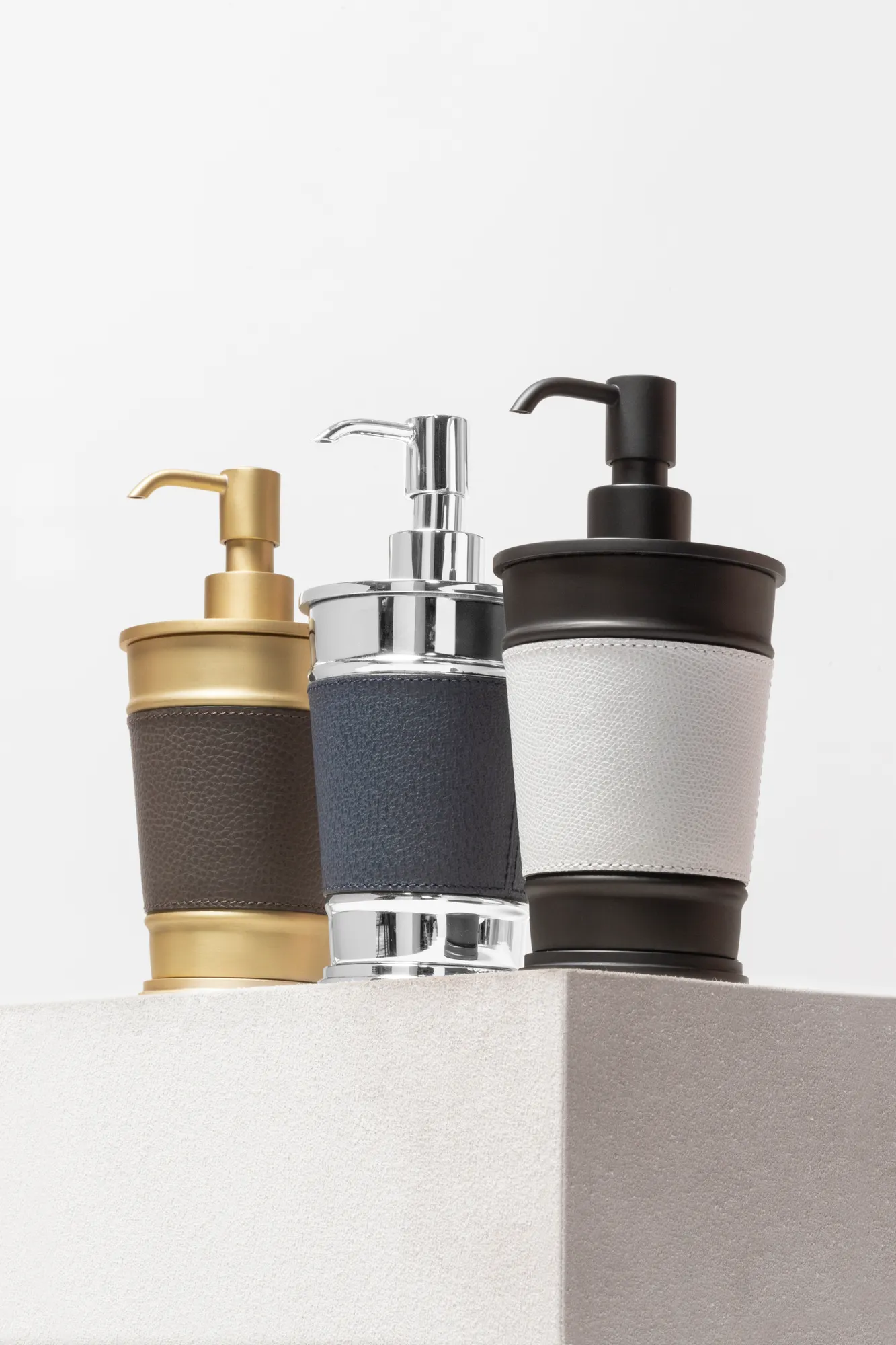 The pieces belonging to this bathroom set boast a characterizing inverted truncated cone metal structure with fine leather inserts. Featuring a series of decorative protrusions and indentations, the Manhattan collection retains a typically modern architectural appeal. Partially leather-covered metal structure. Non-slip waterproof rubber base underneath.