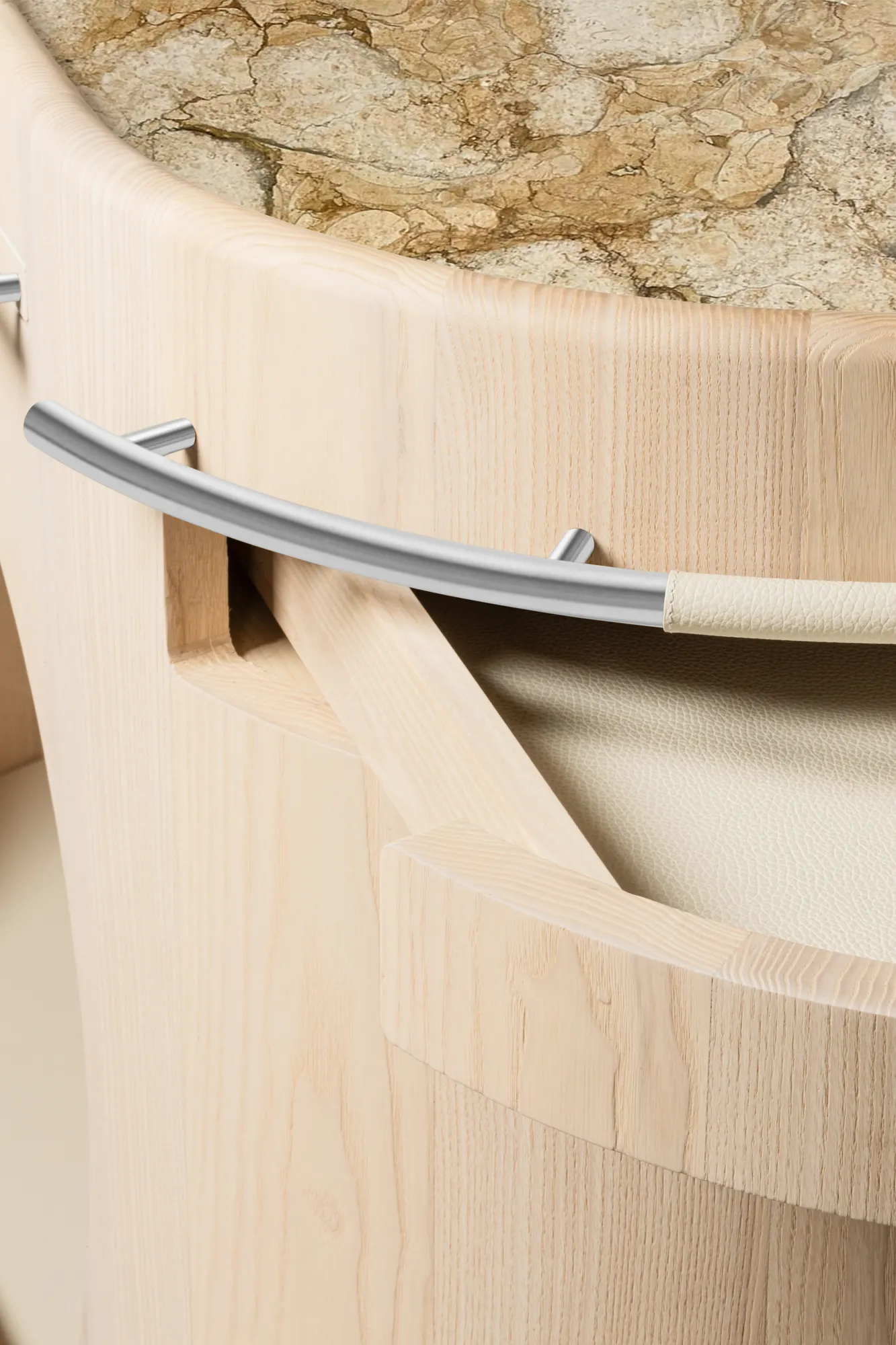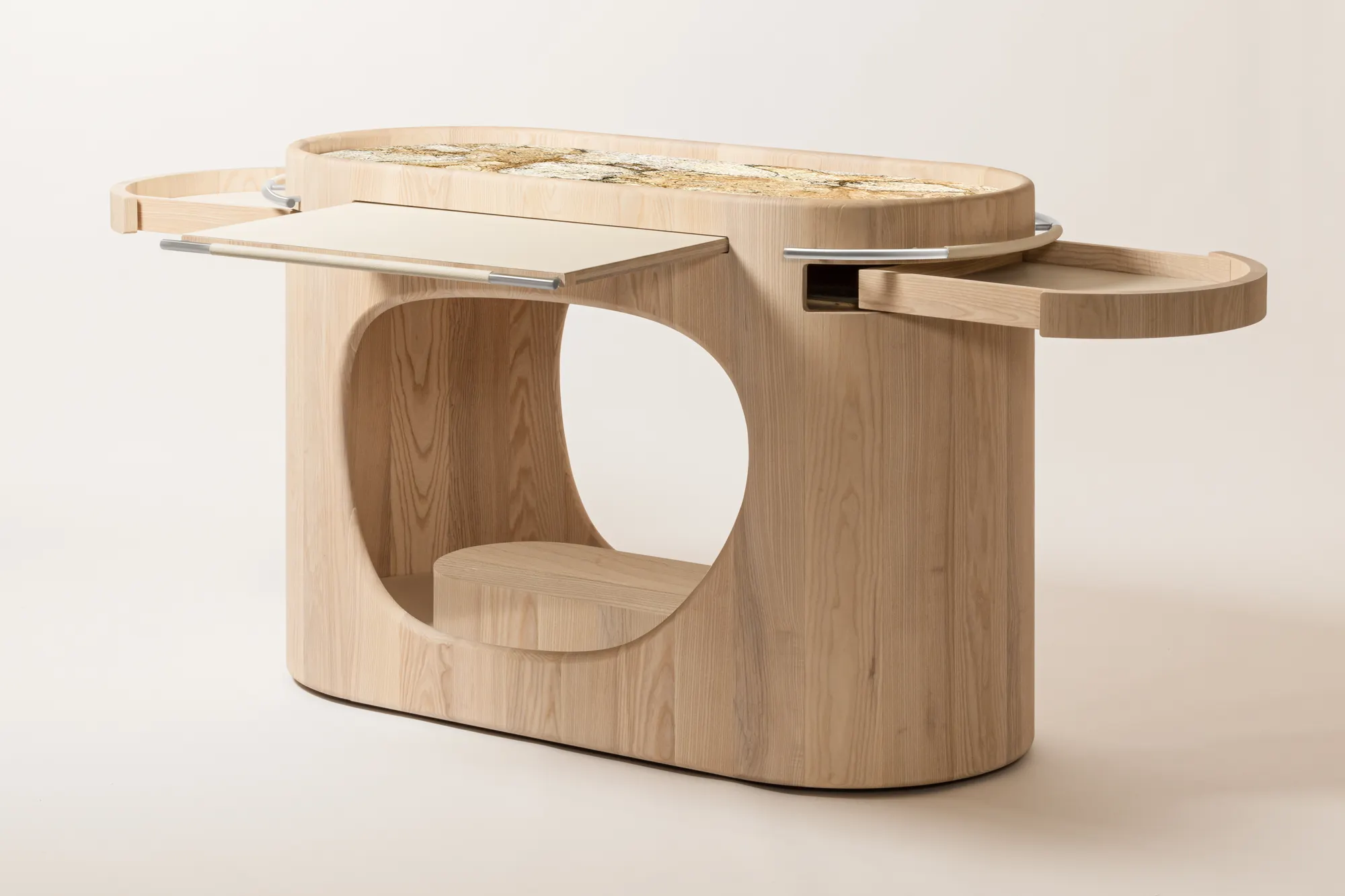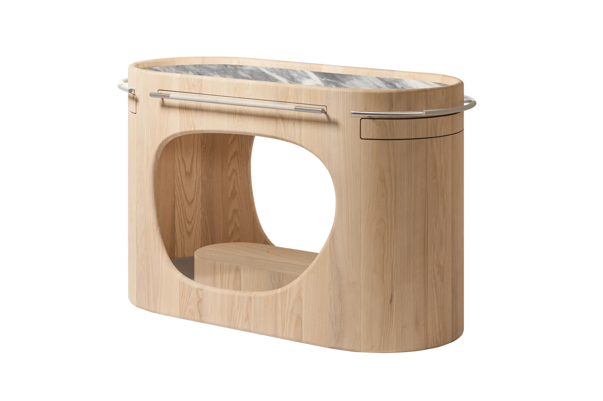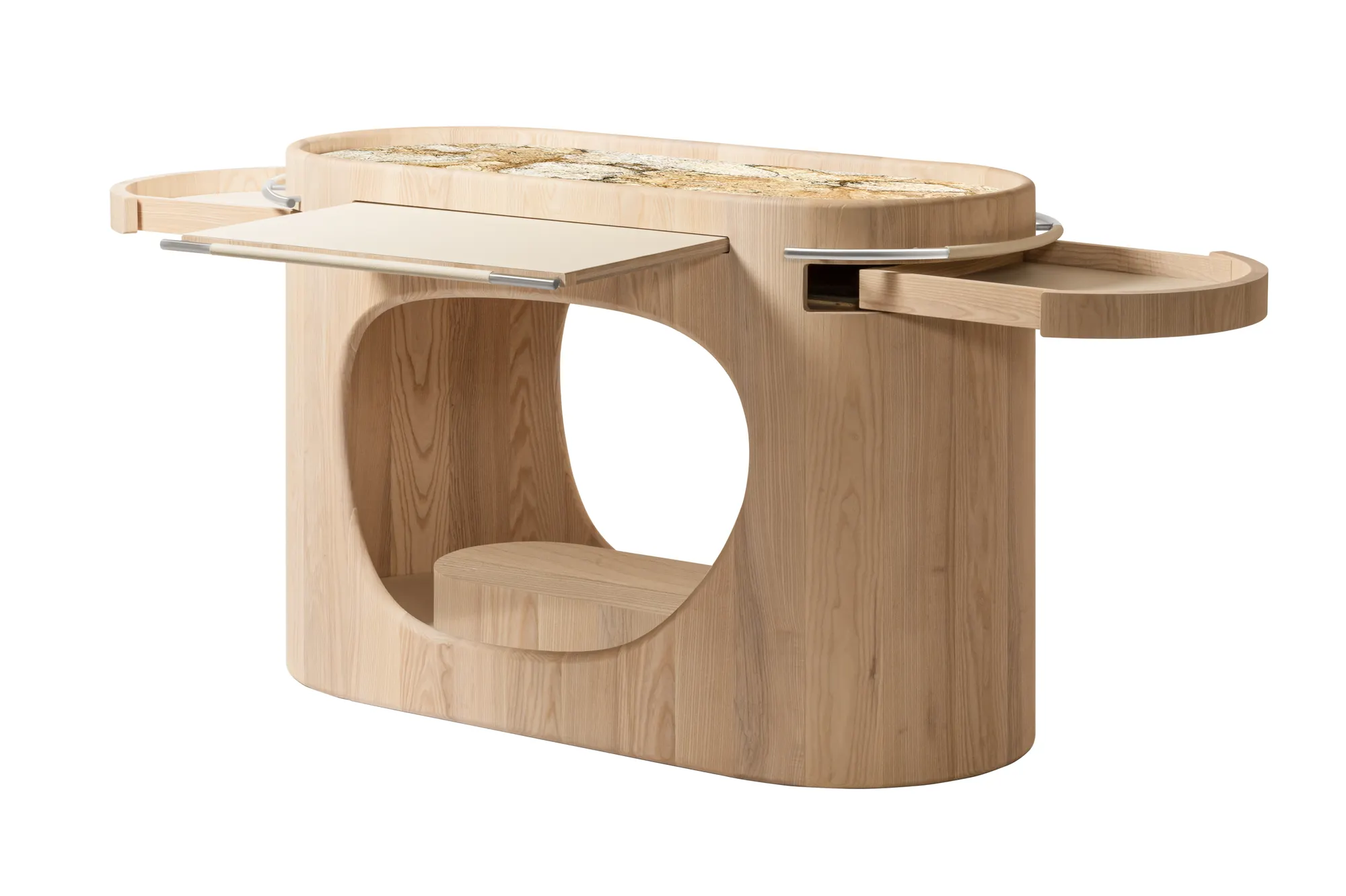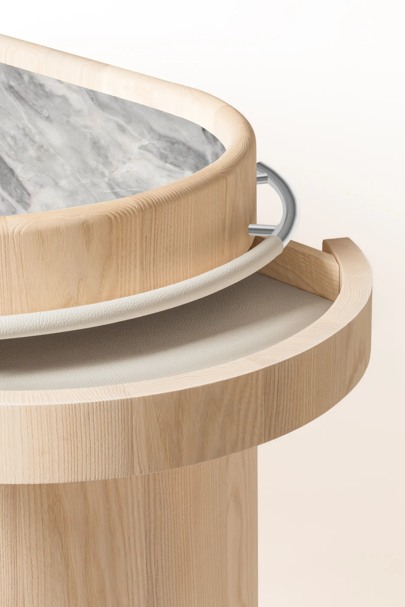 Solid wood structure available either in natural or wenge finish. It features polished chrome handles, a marble top and a leather-covered lower level with a centered wooden platform. Two side drawers can host additional accessories and a pull-out shelf grants additional space for operations.