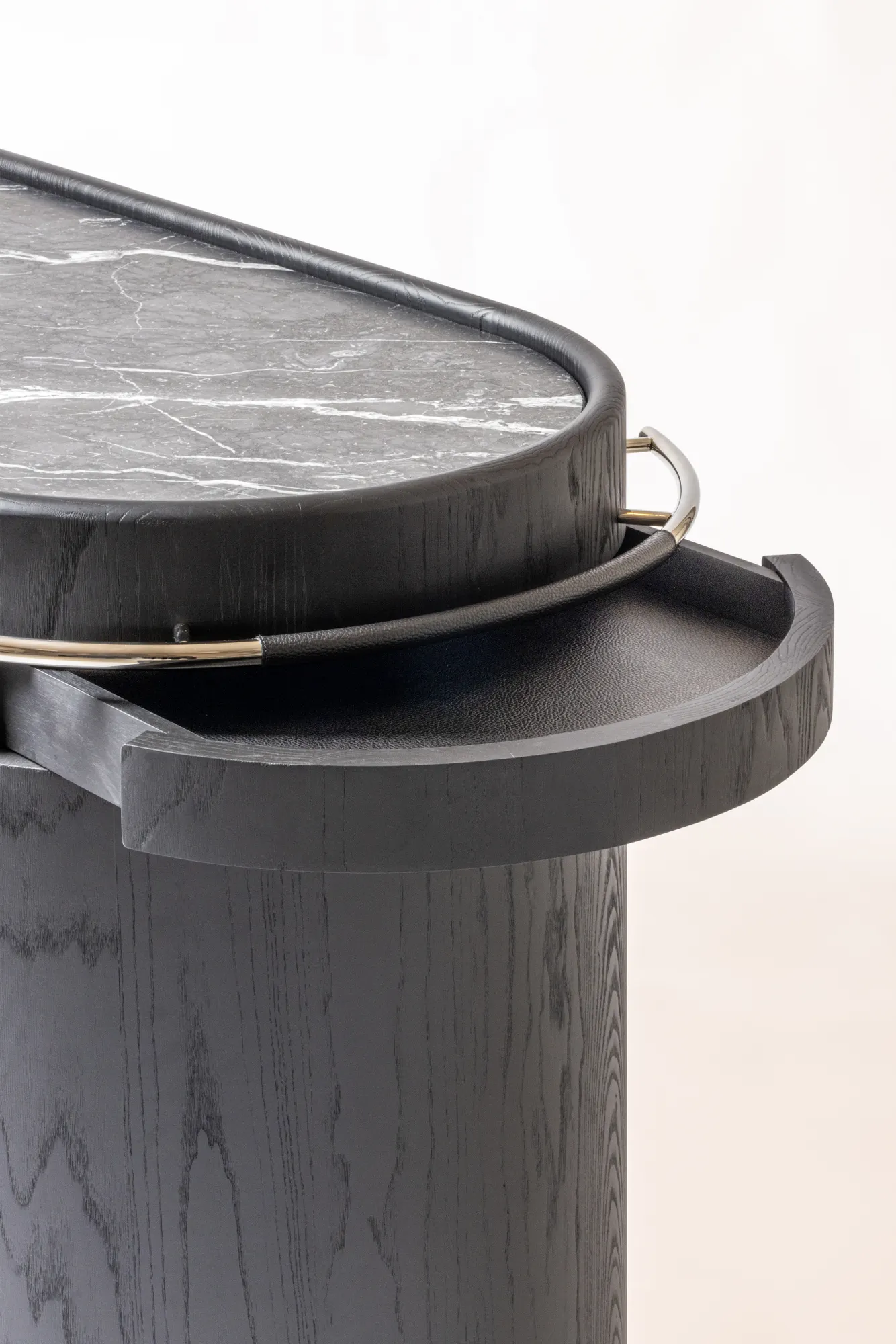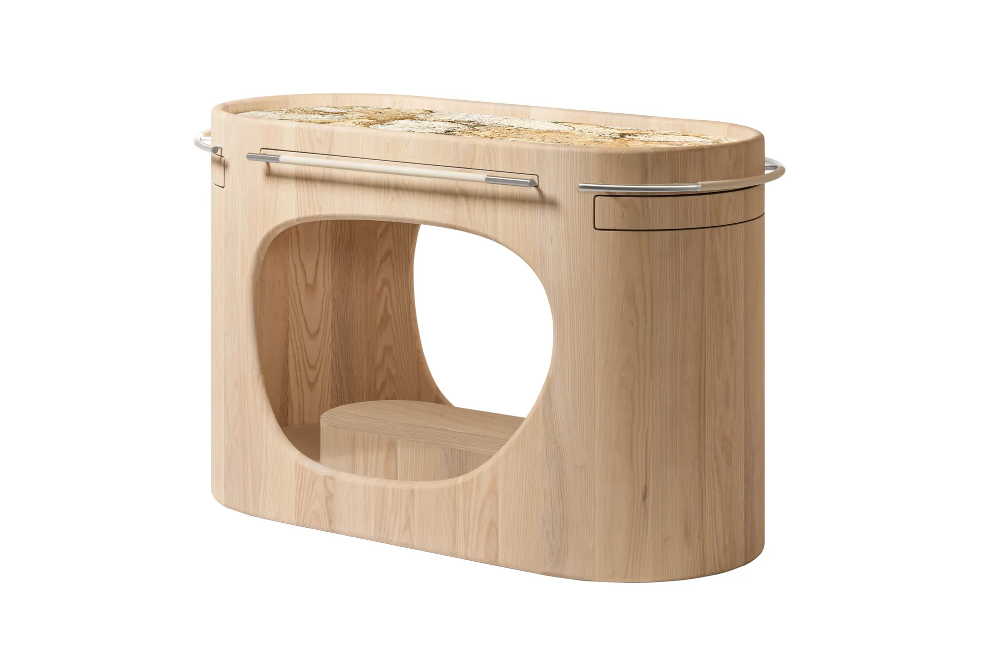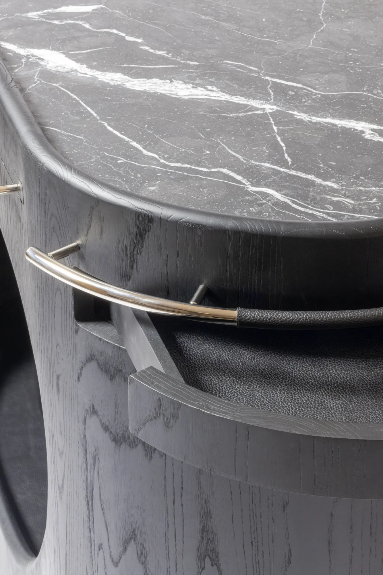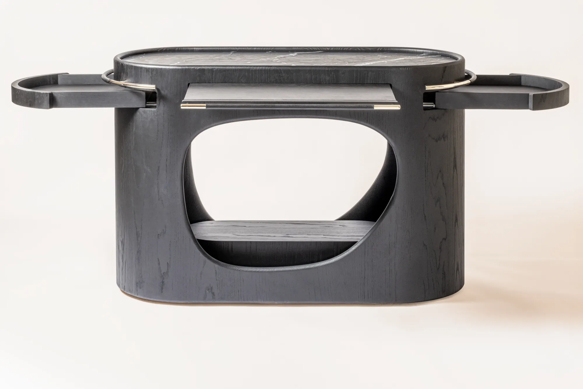 Solid wood structure available either in natural or wenge finish. It features polished chrome handles, a marble top and a leather-covered lower level with a centered wooden platform. Two side drawers can host additional accessories and a pull-out shelf grants additional space for operations.