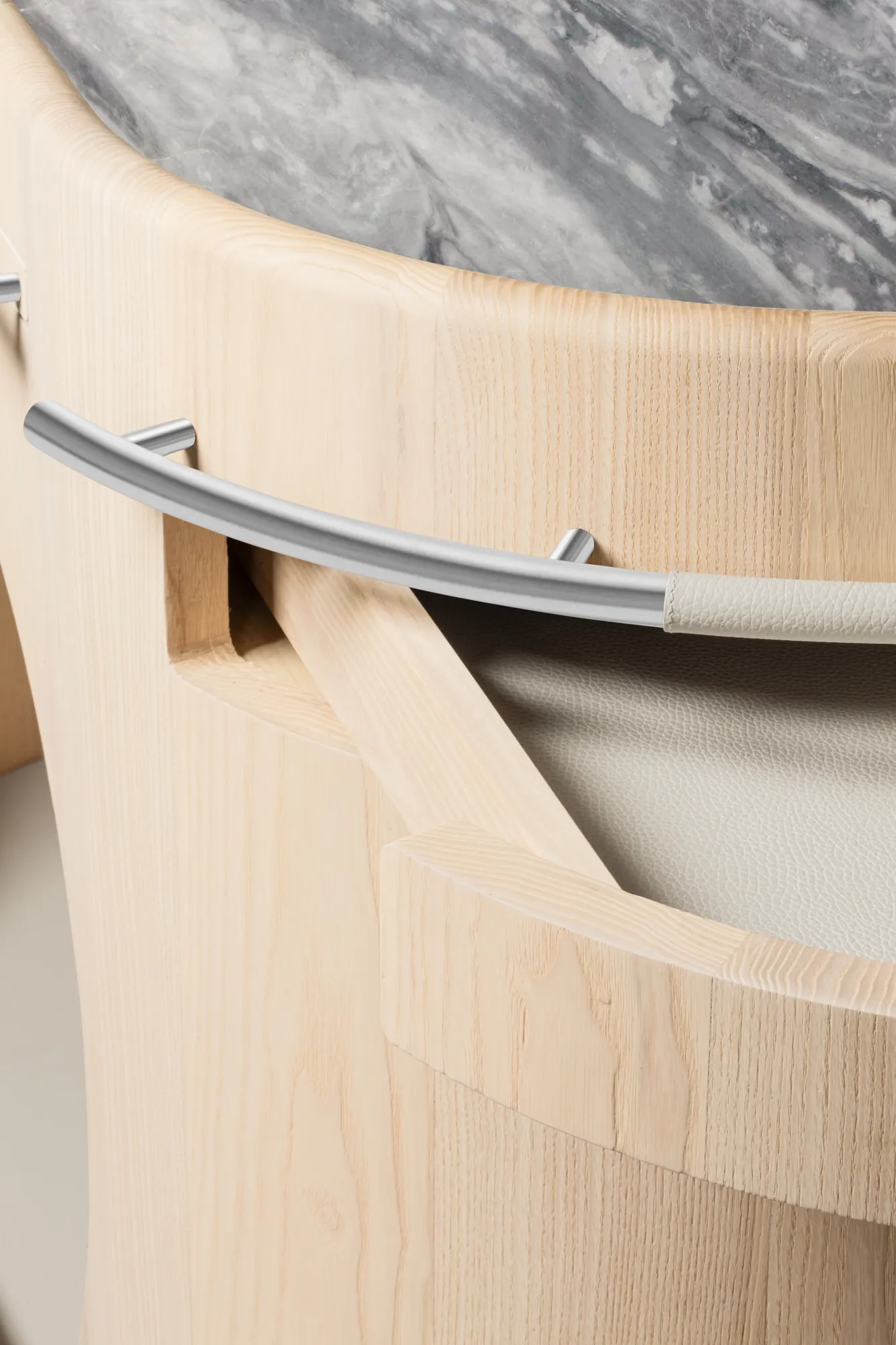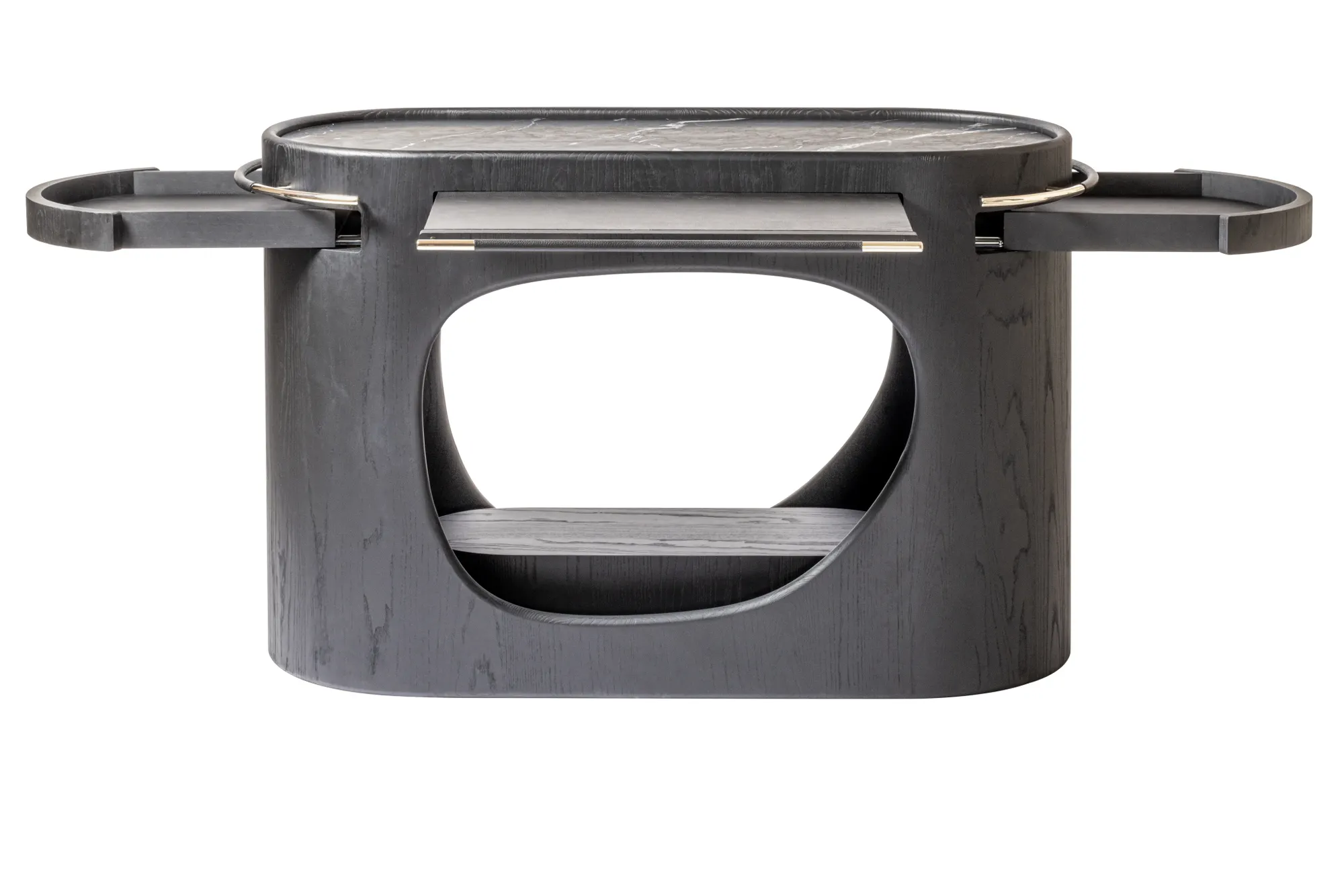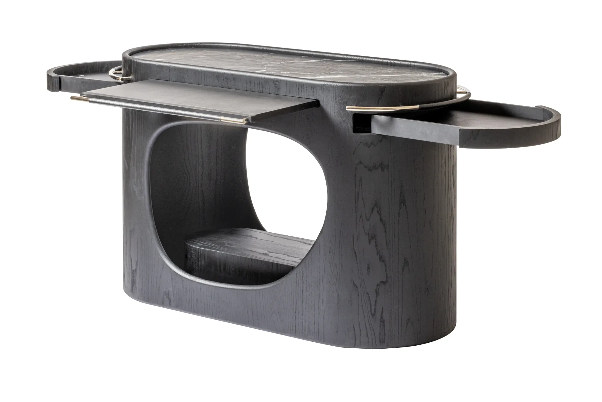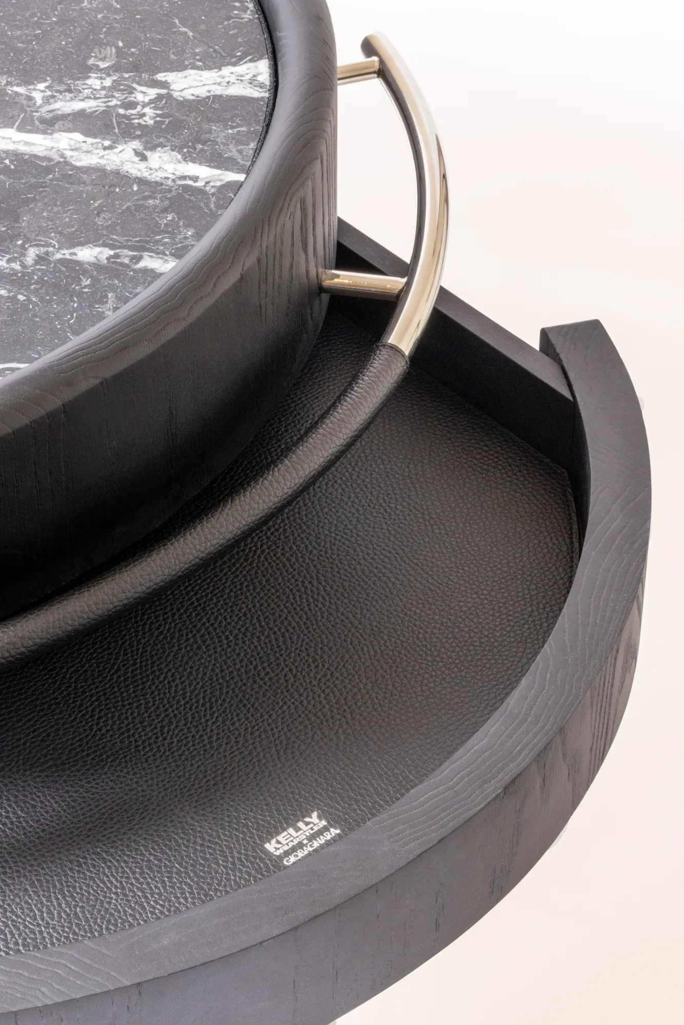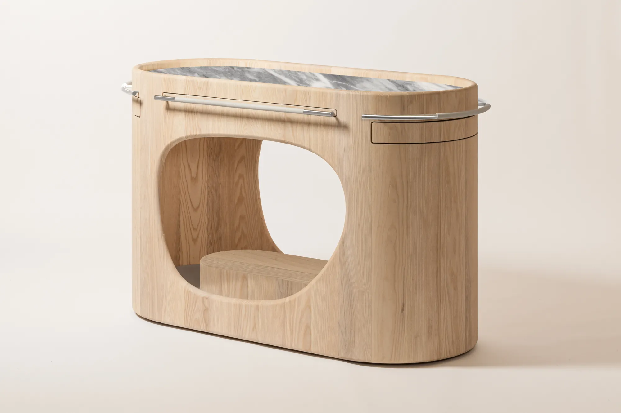 Solid wood structure available either in natural or wenge finish. It features polished chrome handles, a marble top and a leather-covered lower level with a centered wooden platform. Two side drawers can host additional accessories and a pull-out shelf grants additional space for operations.