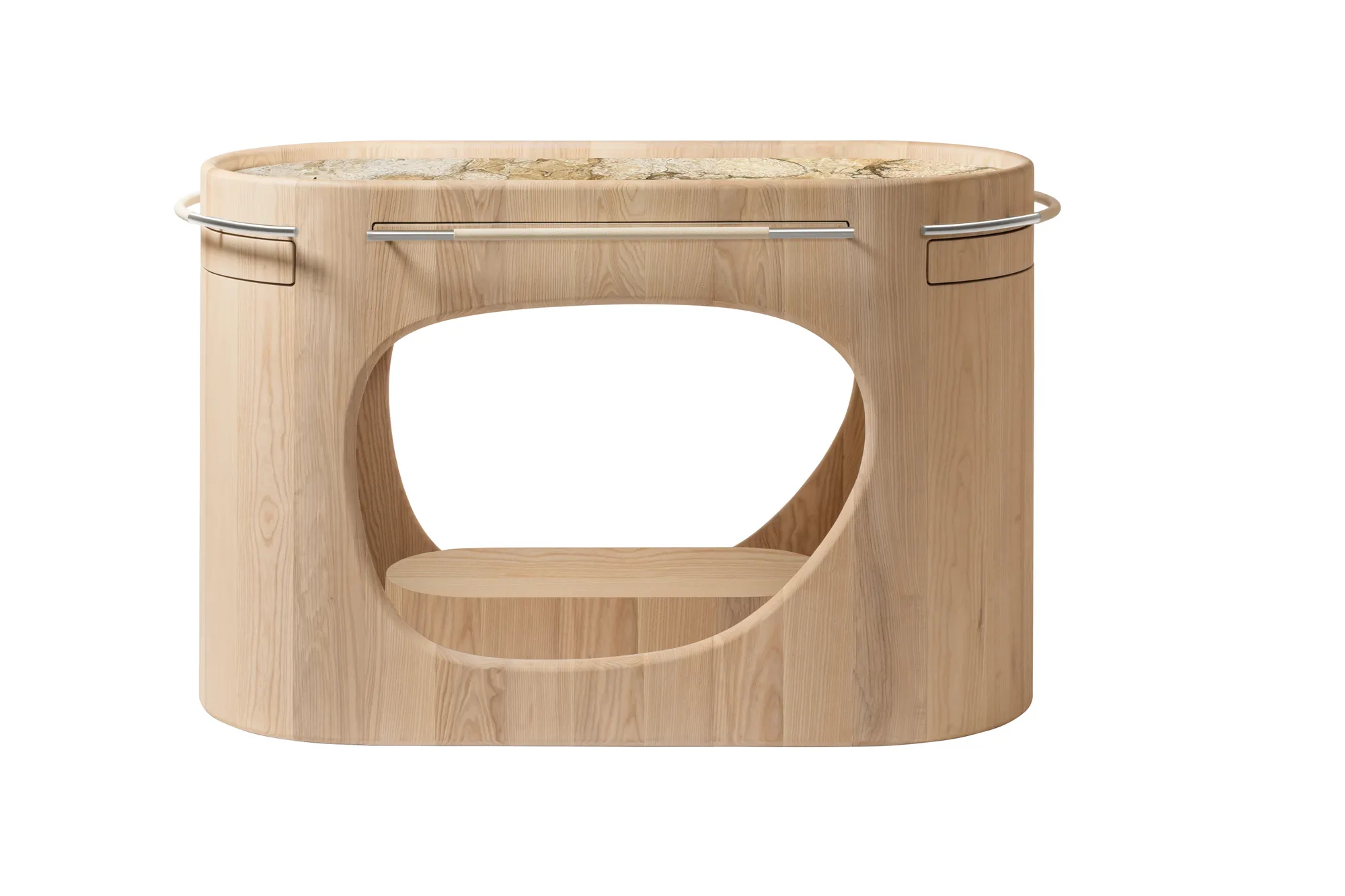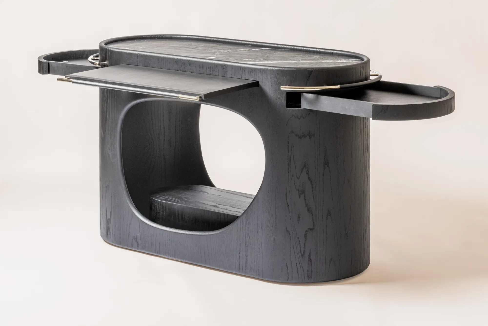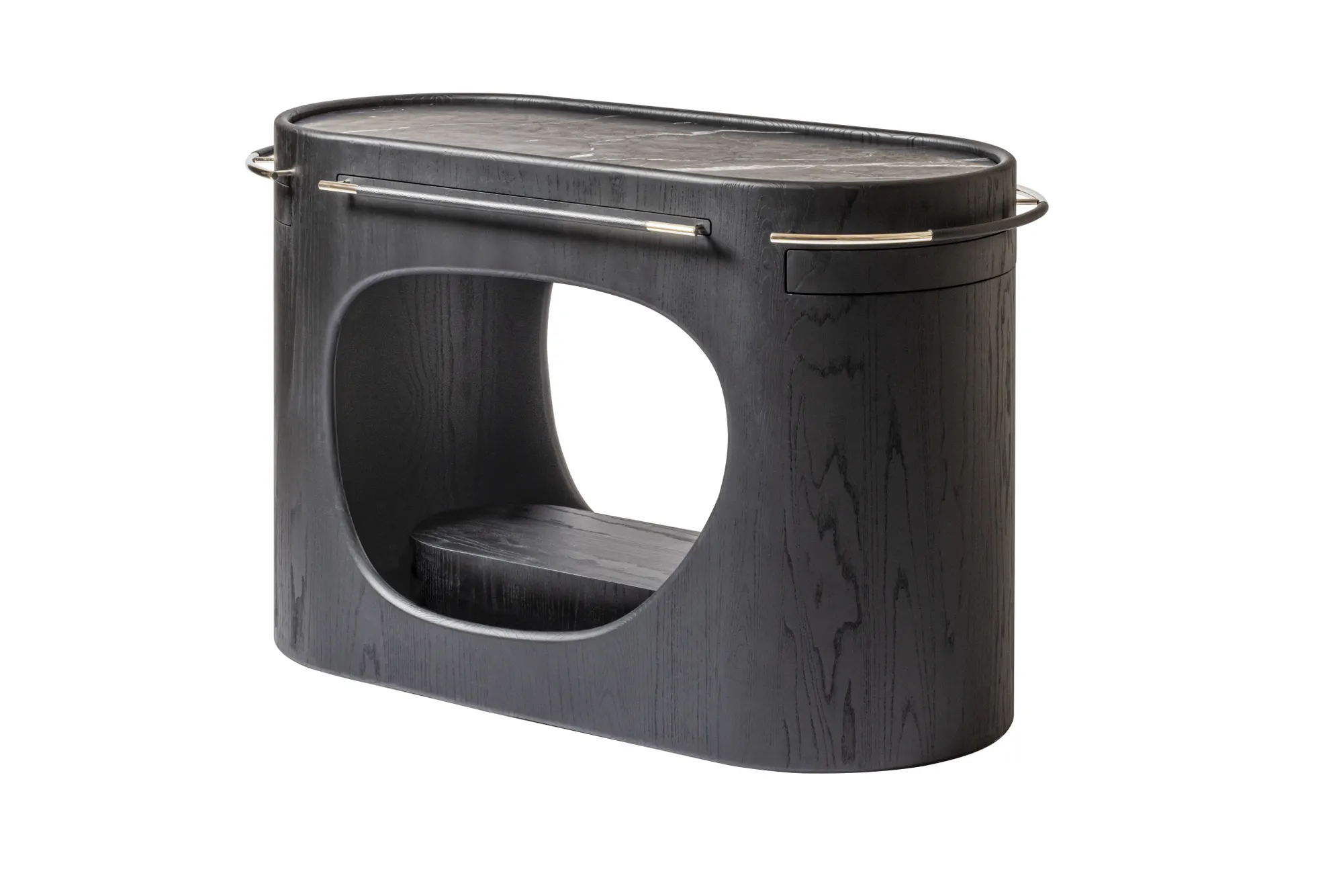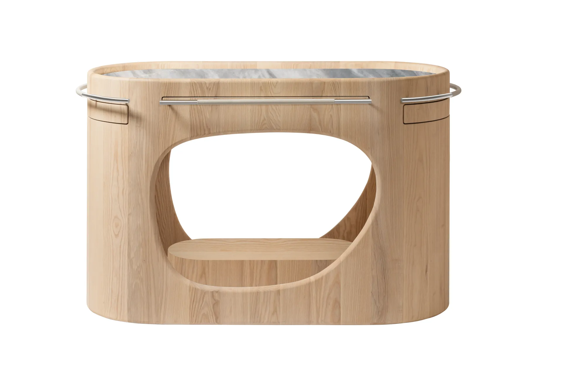 Solid wood structure available either in natural or wenge finish. It features polished chrome handles, a marble top and a leather-covered lower level with a centered wooden platform. Two side drawers can host additional accessories and a pull-out shelf grants additional space for operations.