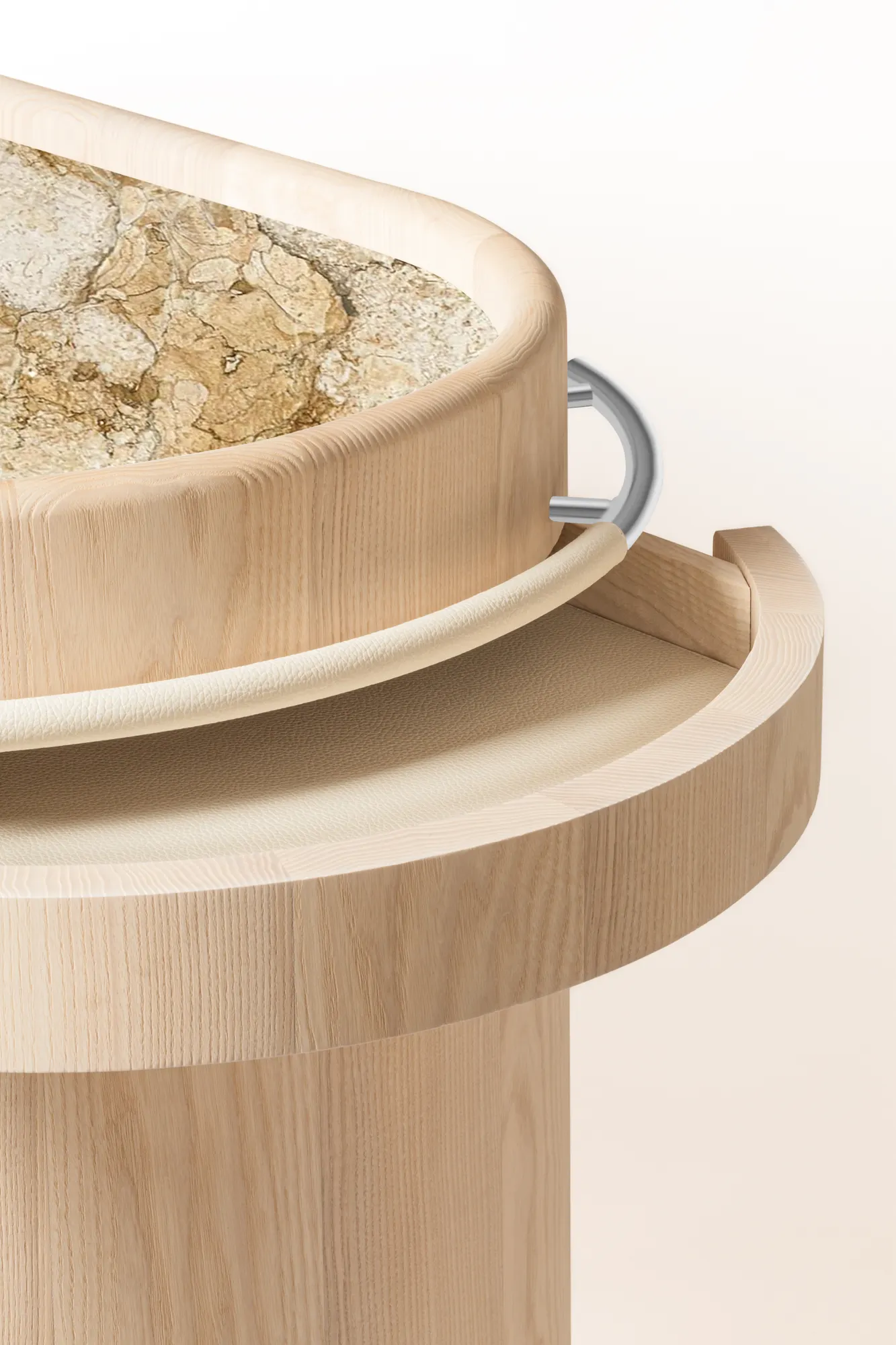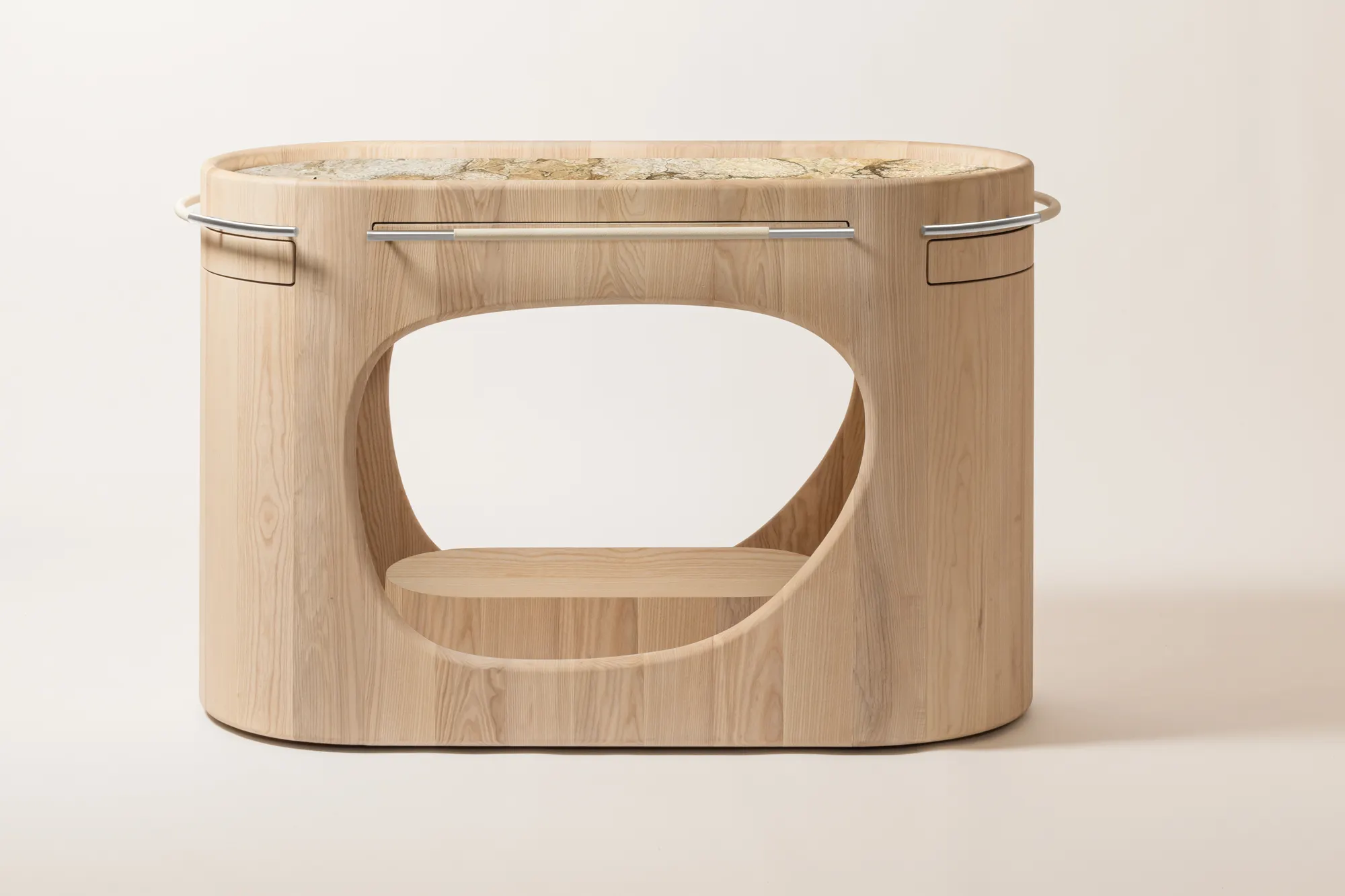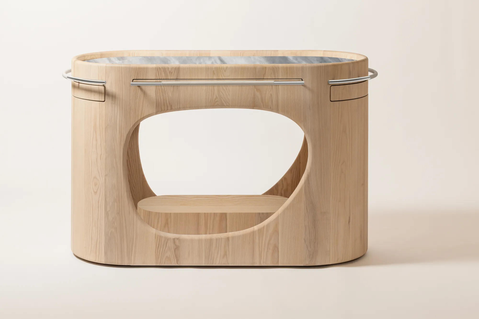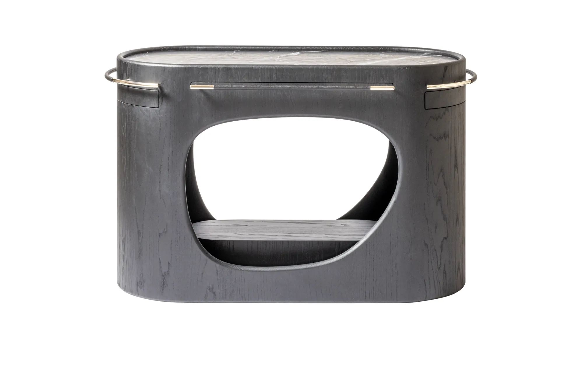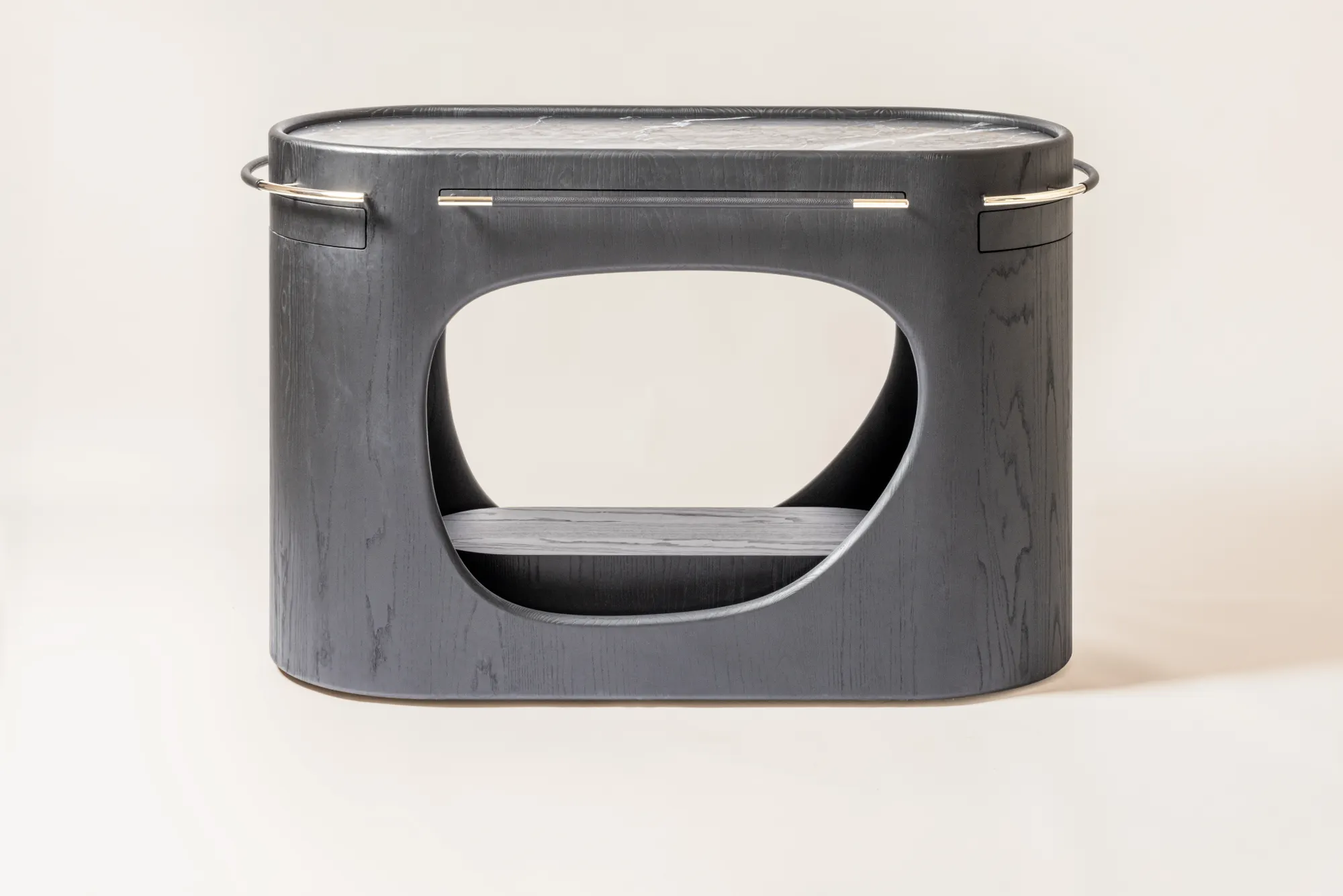 Solid wood structure available either in natural or wenge finish. It features polished chrome handles, a marble top and a leather-covered lower level with a centered wooden platform. Two side drawers can host additional accessories and a pull-out shelf grants additional space for operations.