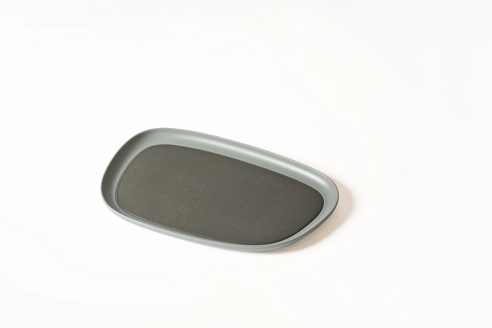 Sandblasted aluminium trays with removable leather inlay. Non-slip waterproof rubber base underneath.