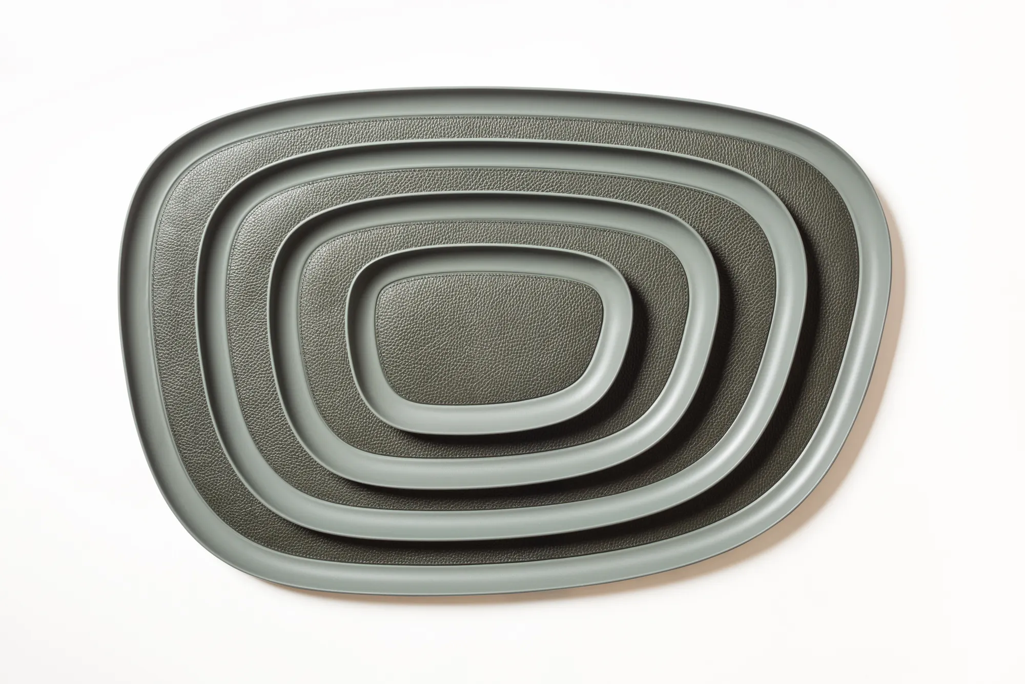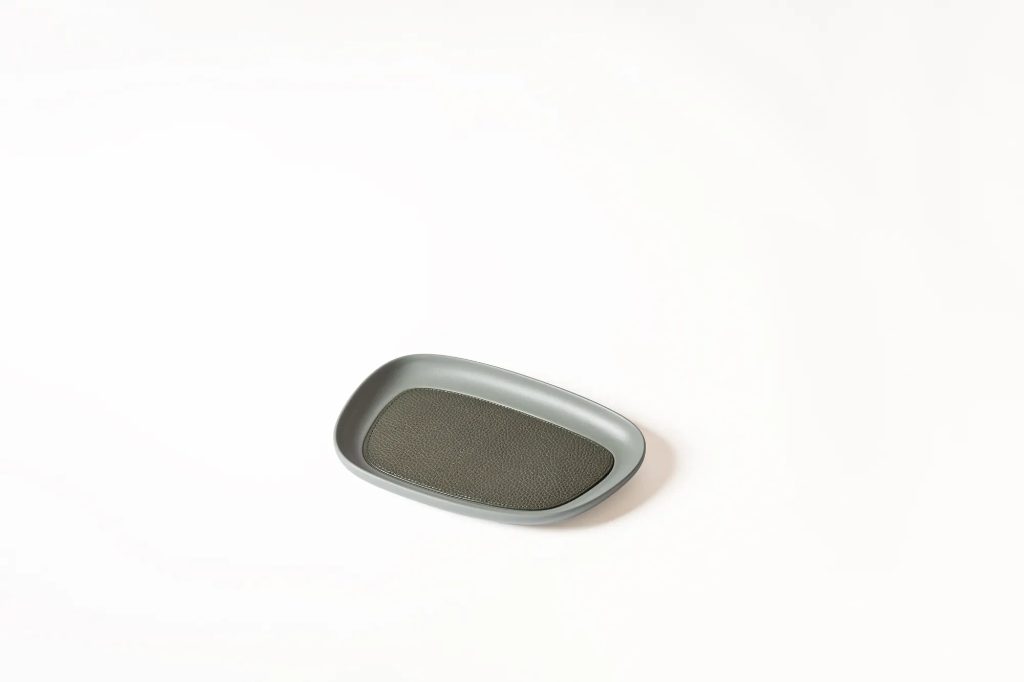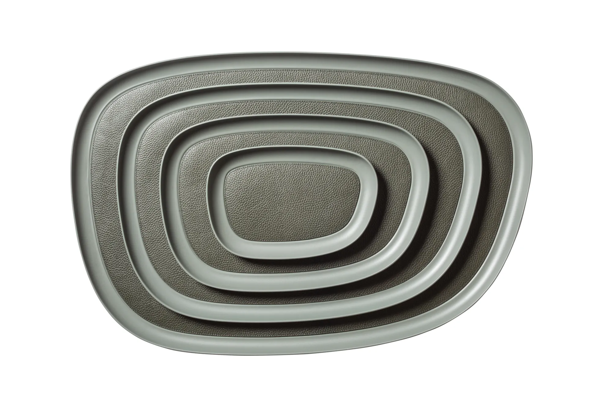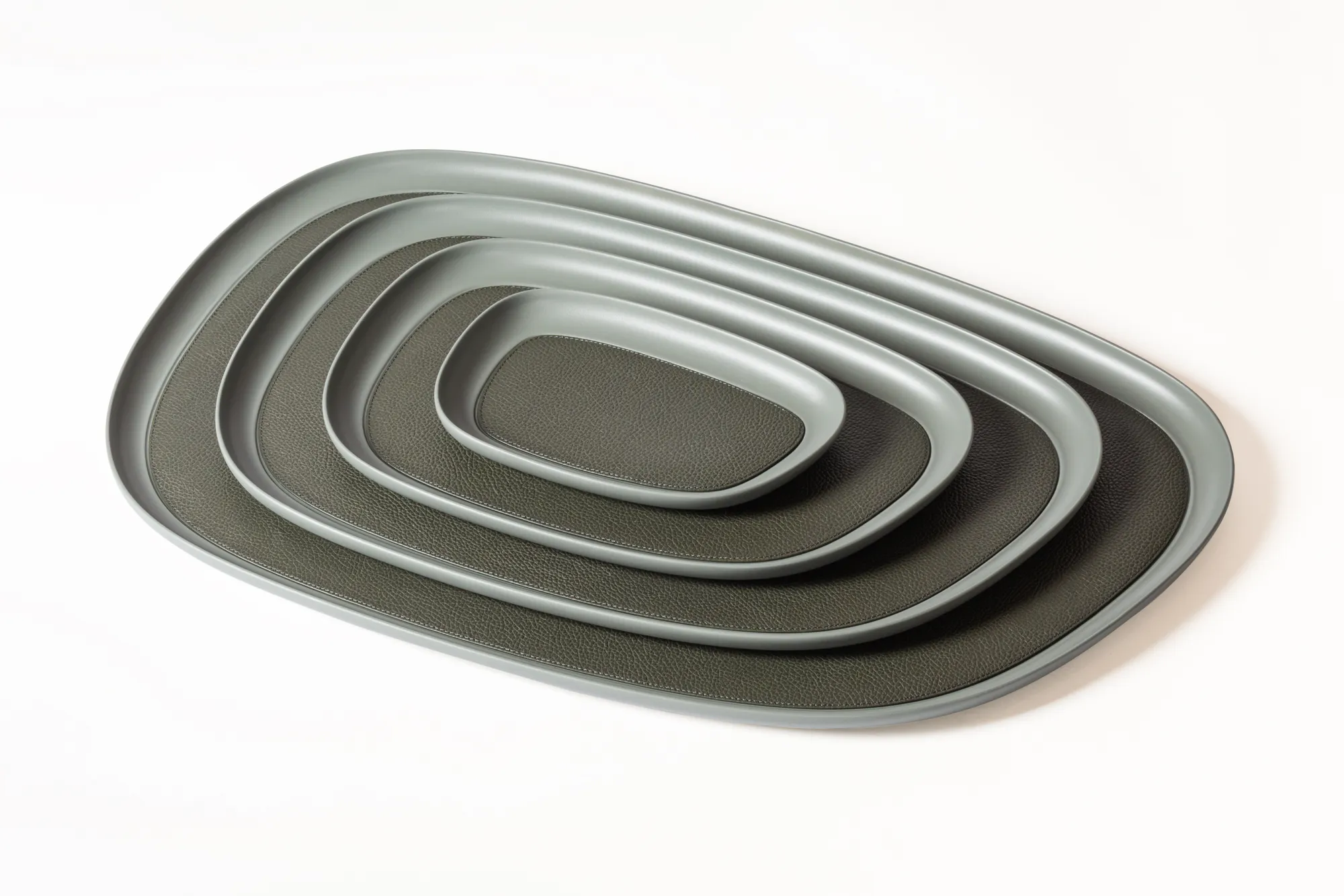 Sandblasted aluminium trays with removable leather inlay. Non-slip waterproof rubber base underneath.