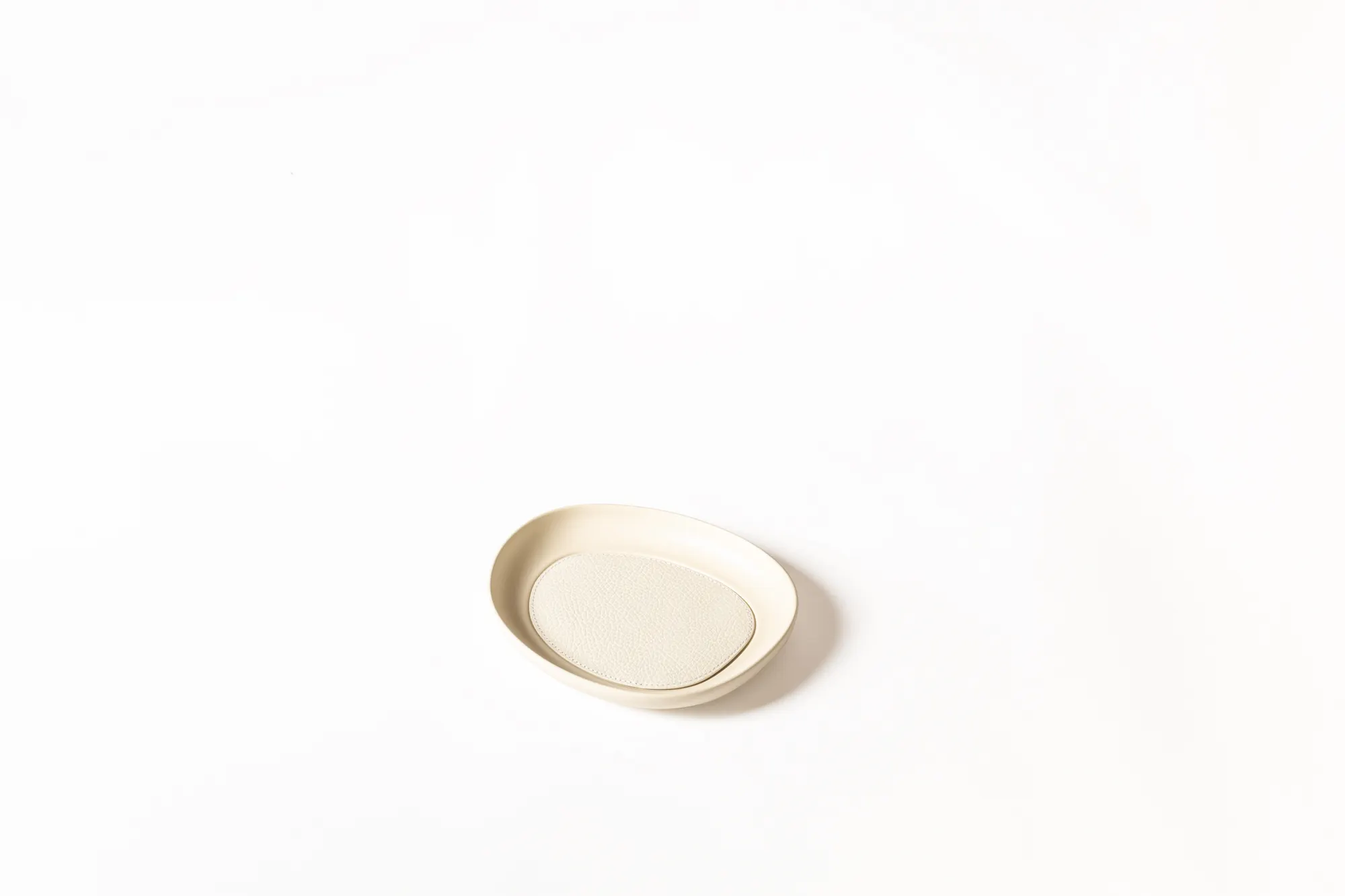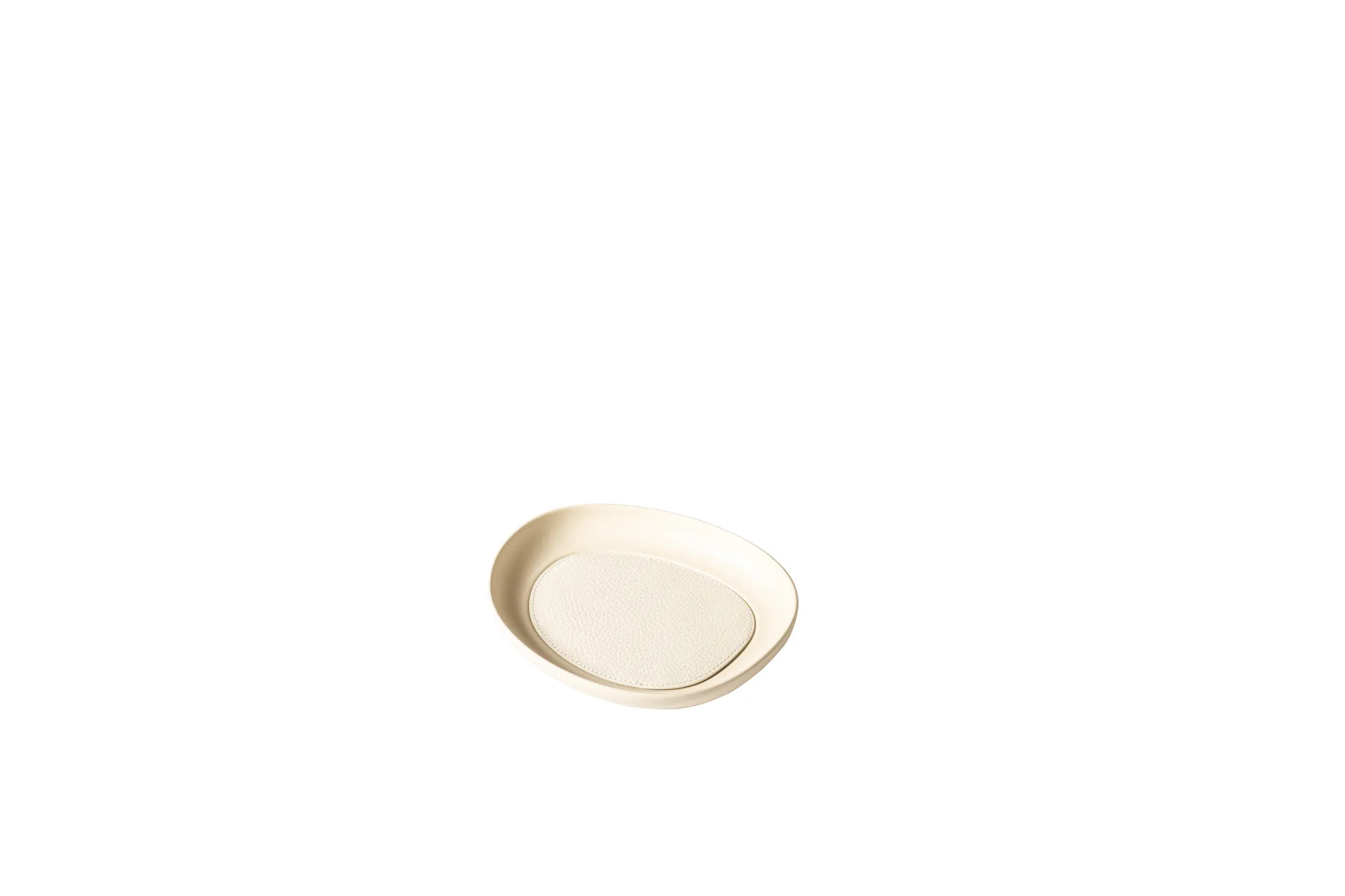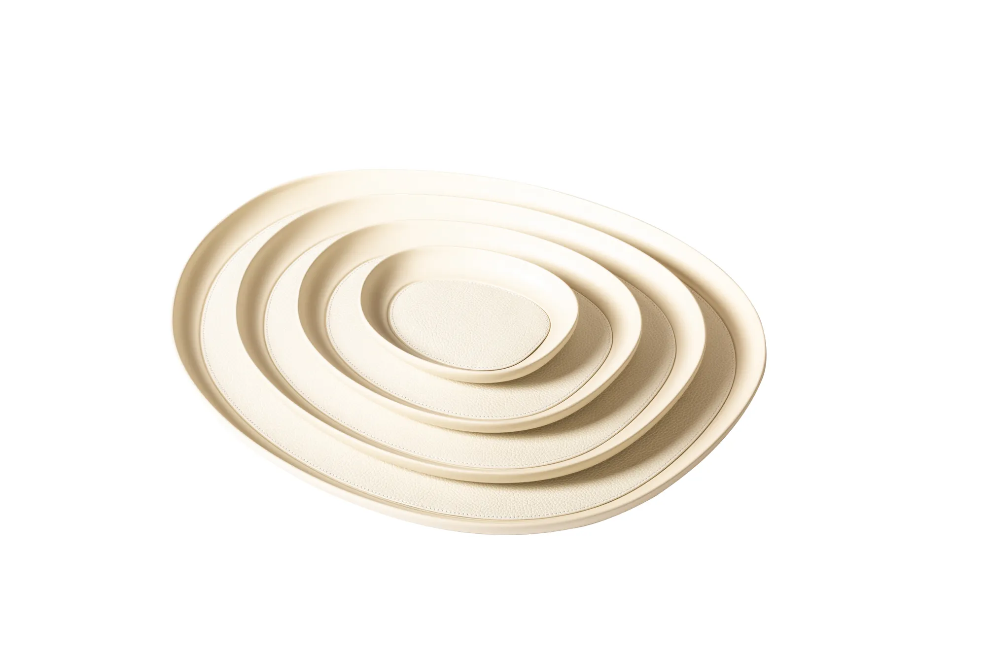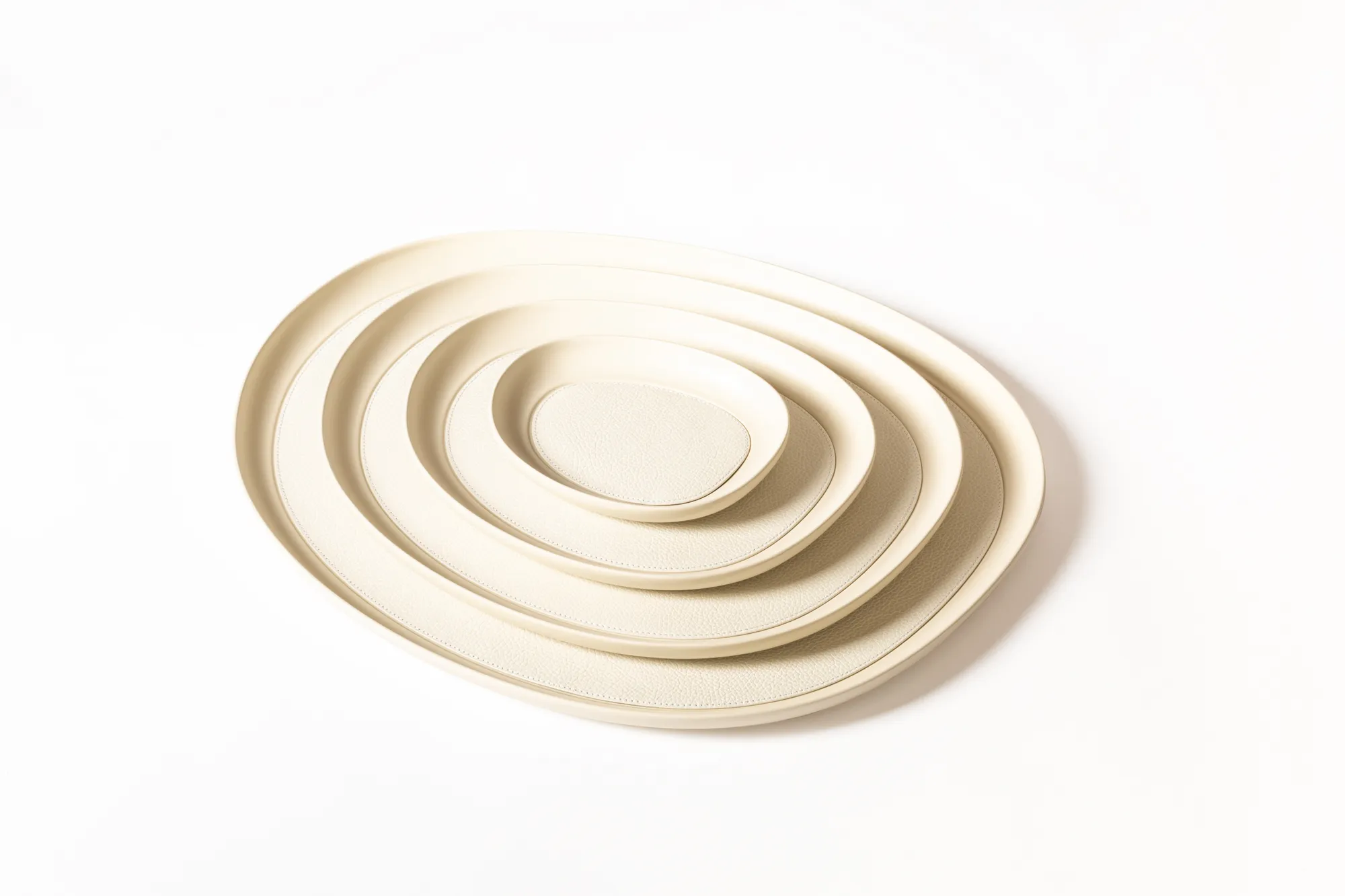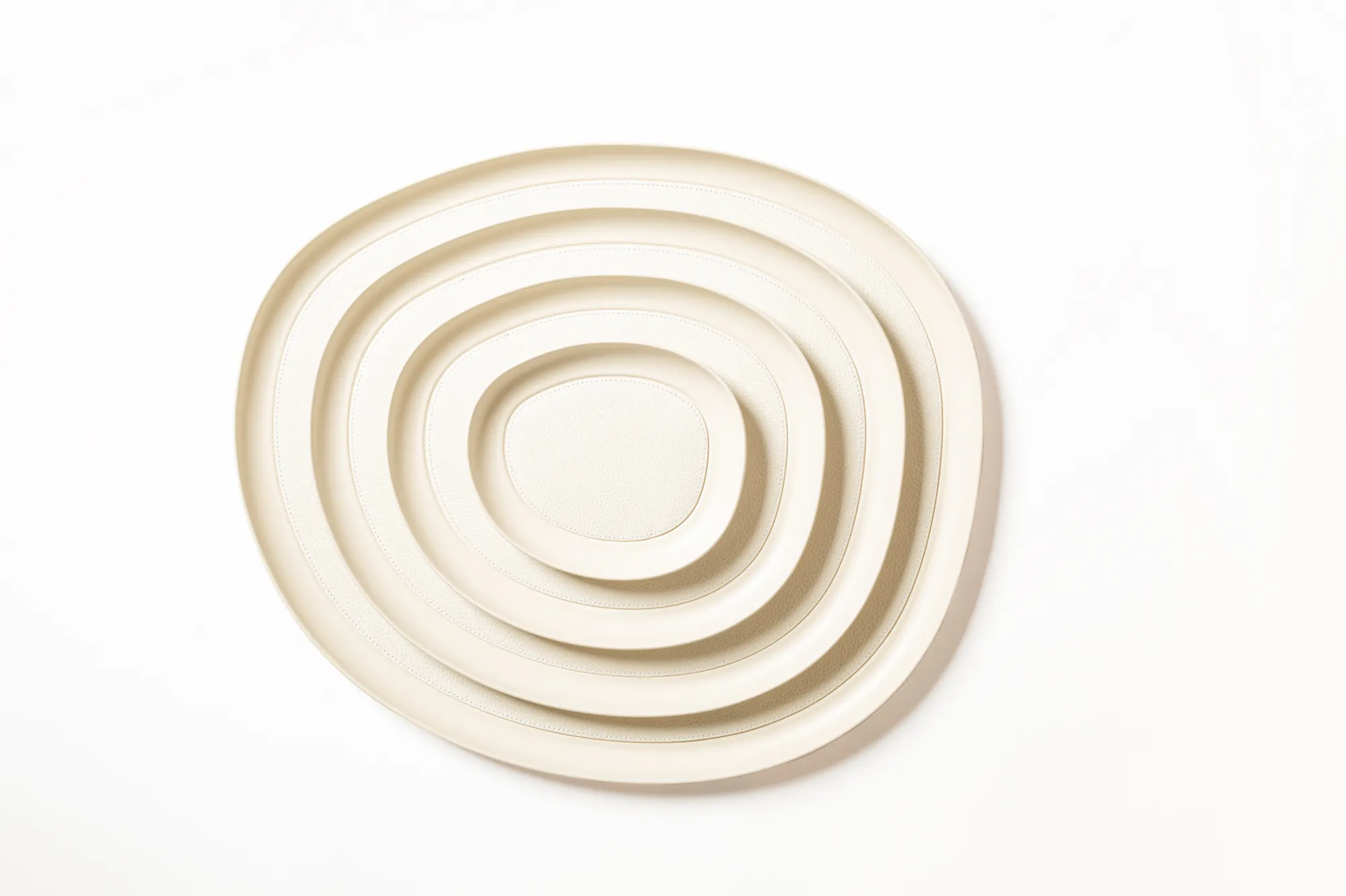 Sandblasted aluminium trays with removable leather inlay. Non-slip waterproof rubber base underneath.