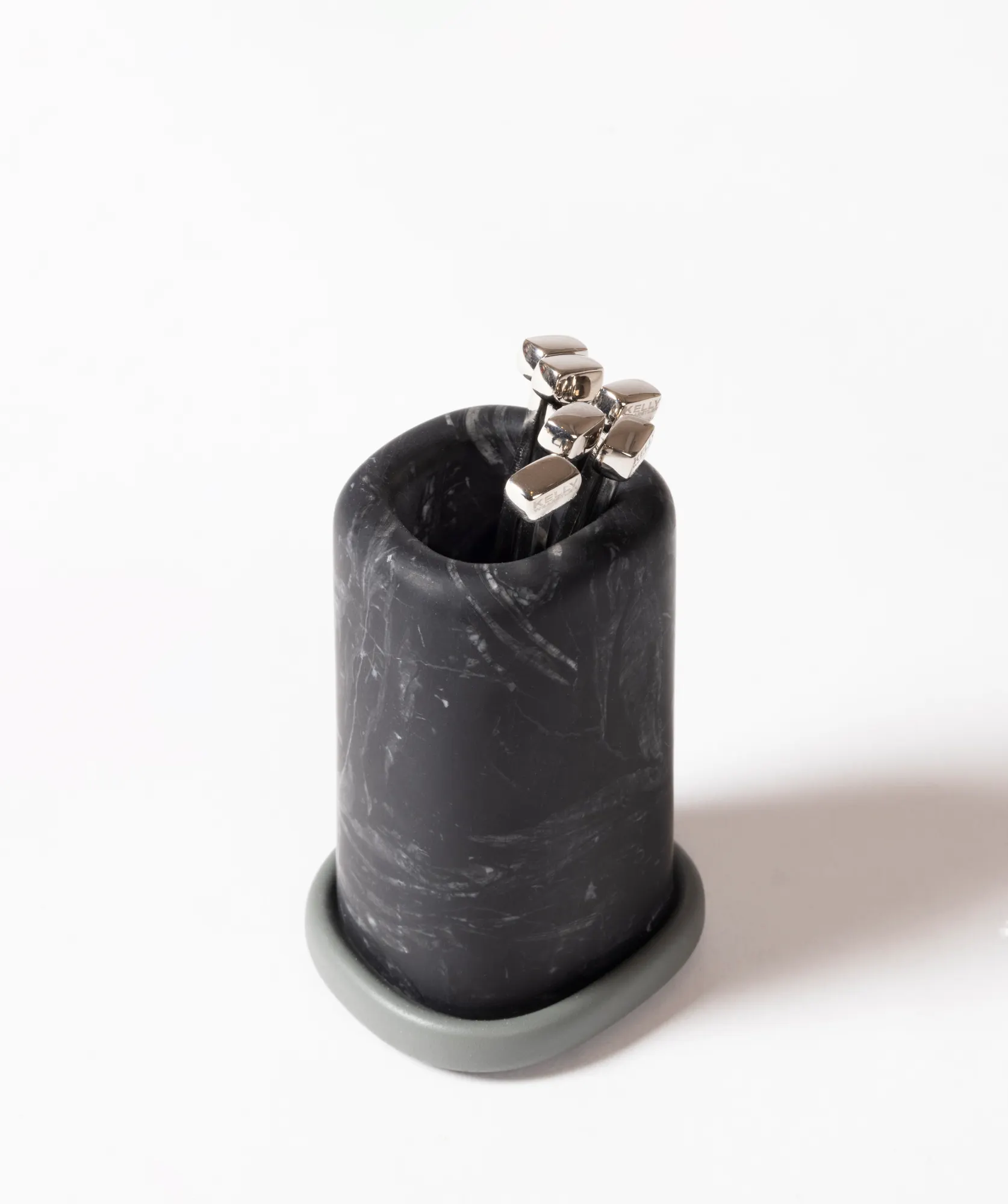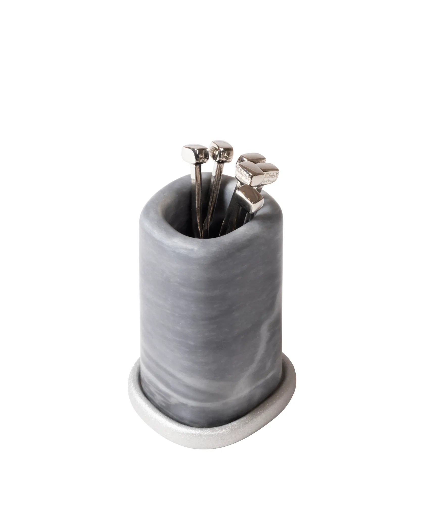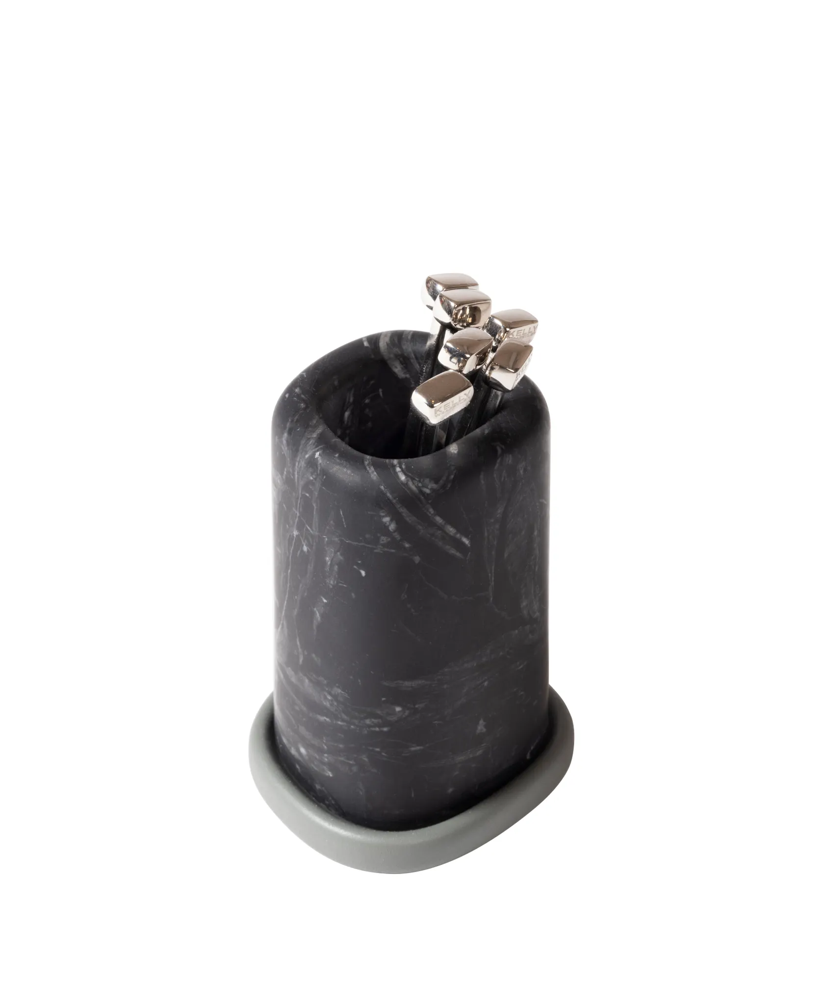 Marble structure featuring sandblasted aluminium accents. It hosts x6 polished stainless steel cocktail picks. Available in five aluminium colors of choice: cappuccino, cipress green, ivory, silver and white.