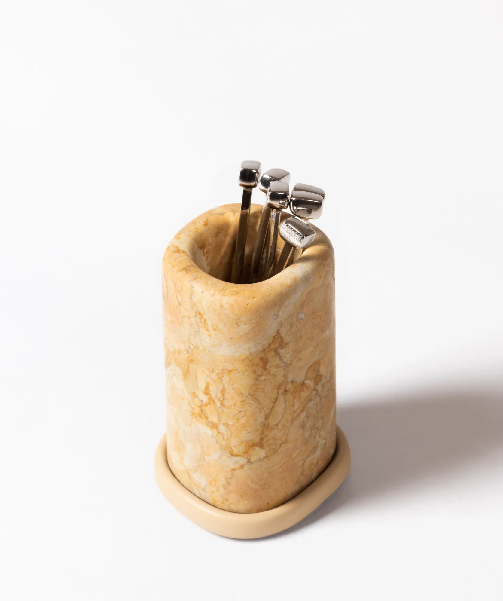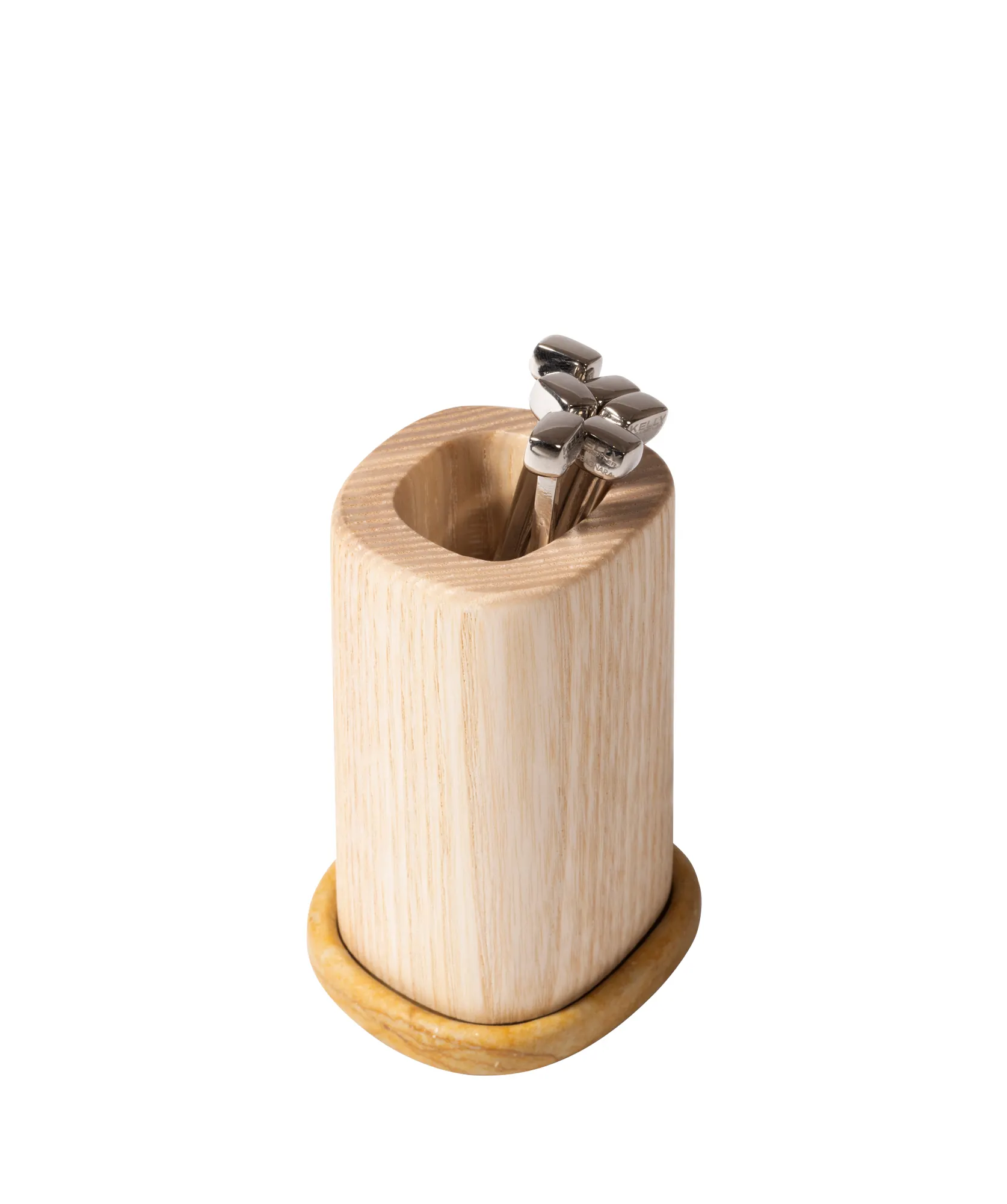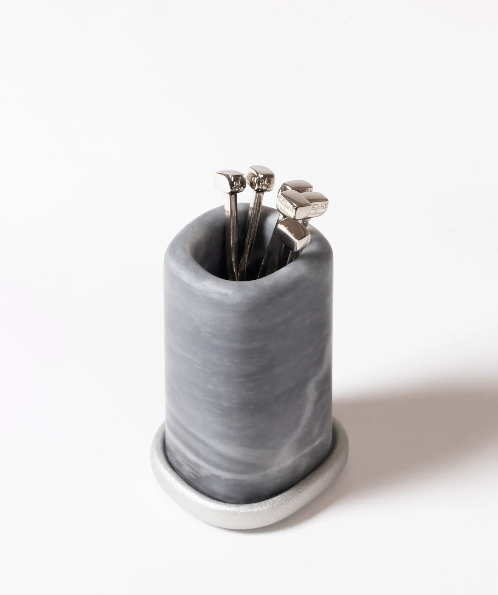 Marble structure featuring sandblasted aluminium accents. It hosts x6 polished stainless steel cocktail picks. Available in five aluminium colors of choice: cappuccino, cipress green, ivory, silver and white.