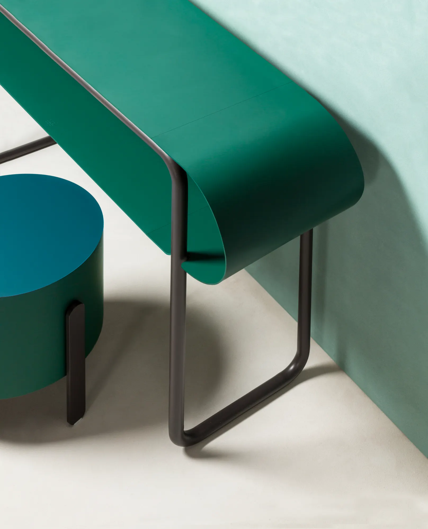 Wood structure featuring a Tecnocuoio® cover: finest regenerated leather with water-resistant and UV-resistant finish. It features dark-stained metal legs. It is possible to choose any color combination from our chart for the stools' bicolor version.