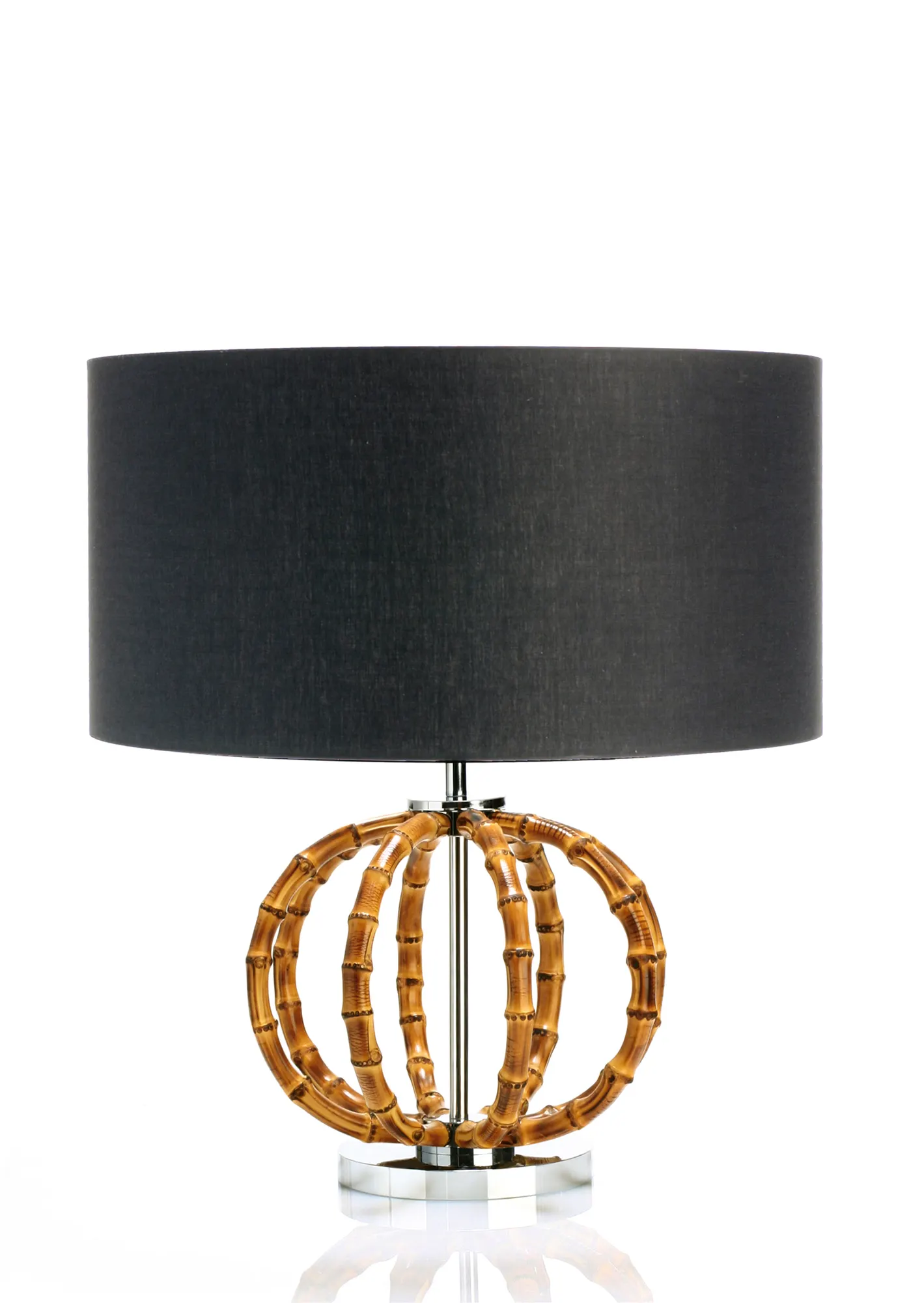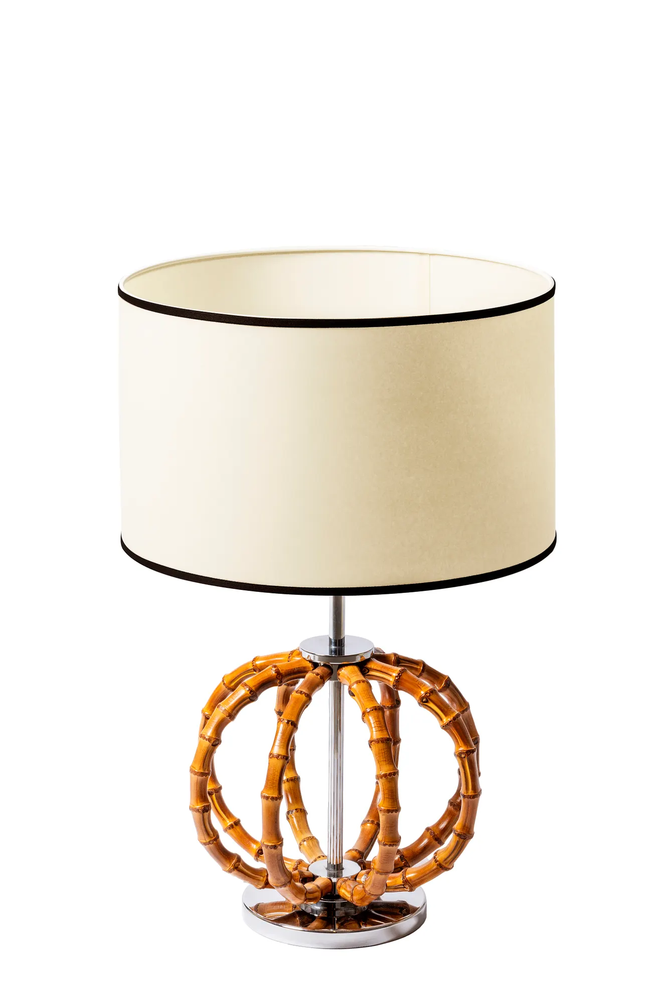 Natural bamboo lamp with chrome or gold metal base, single sphere.