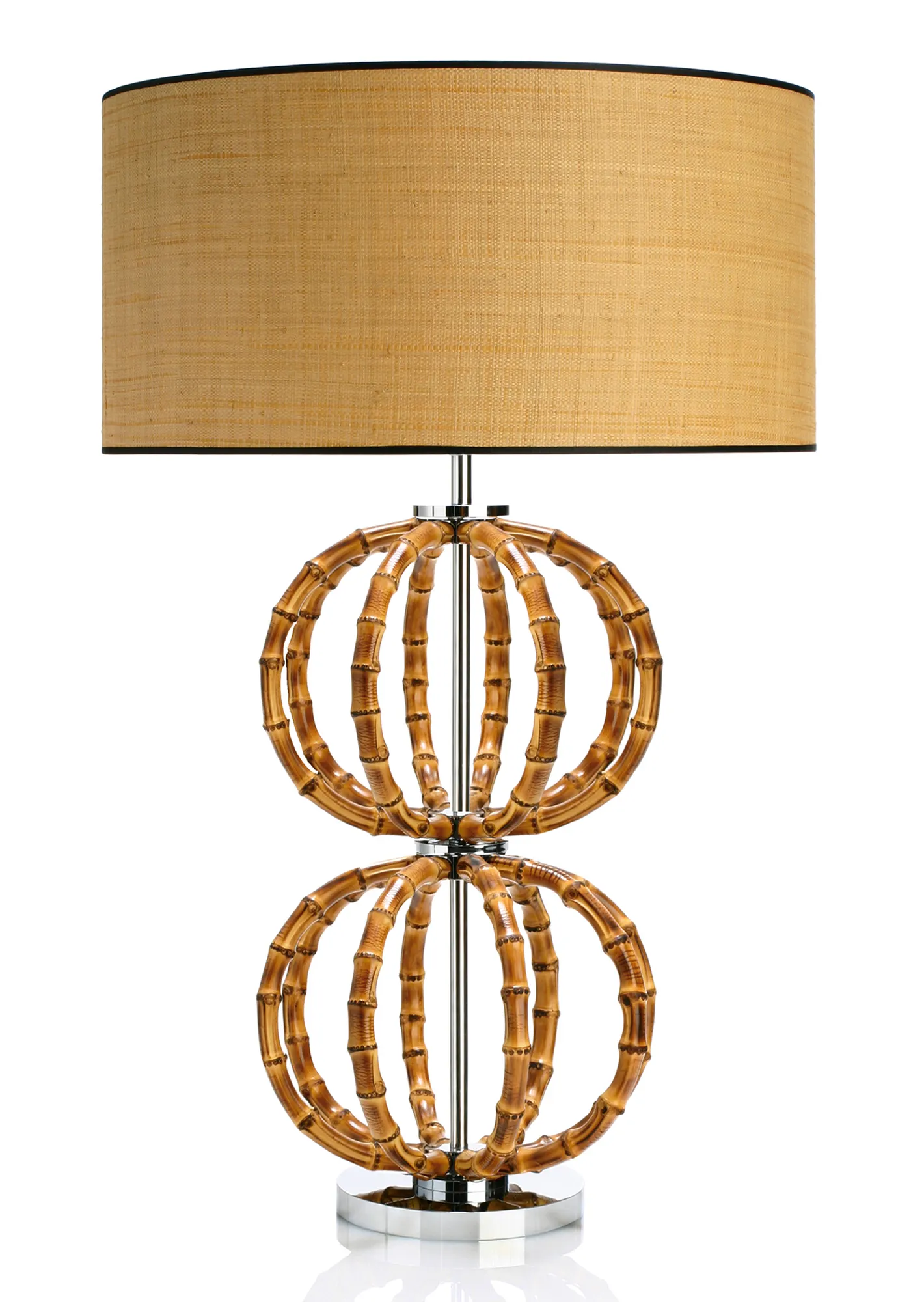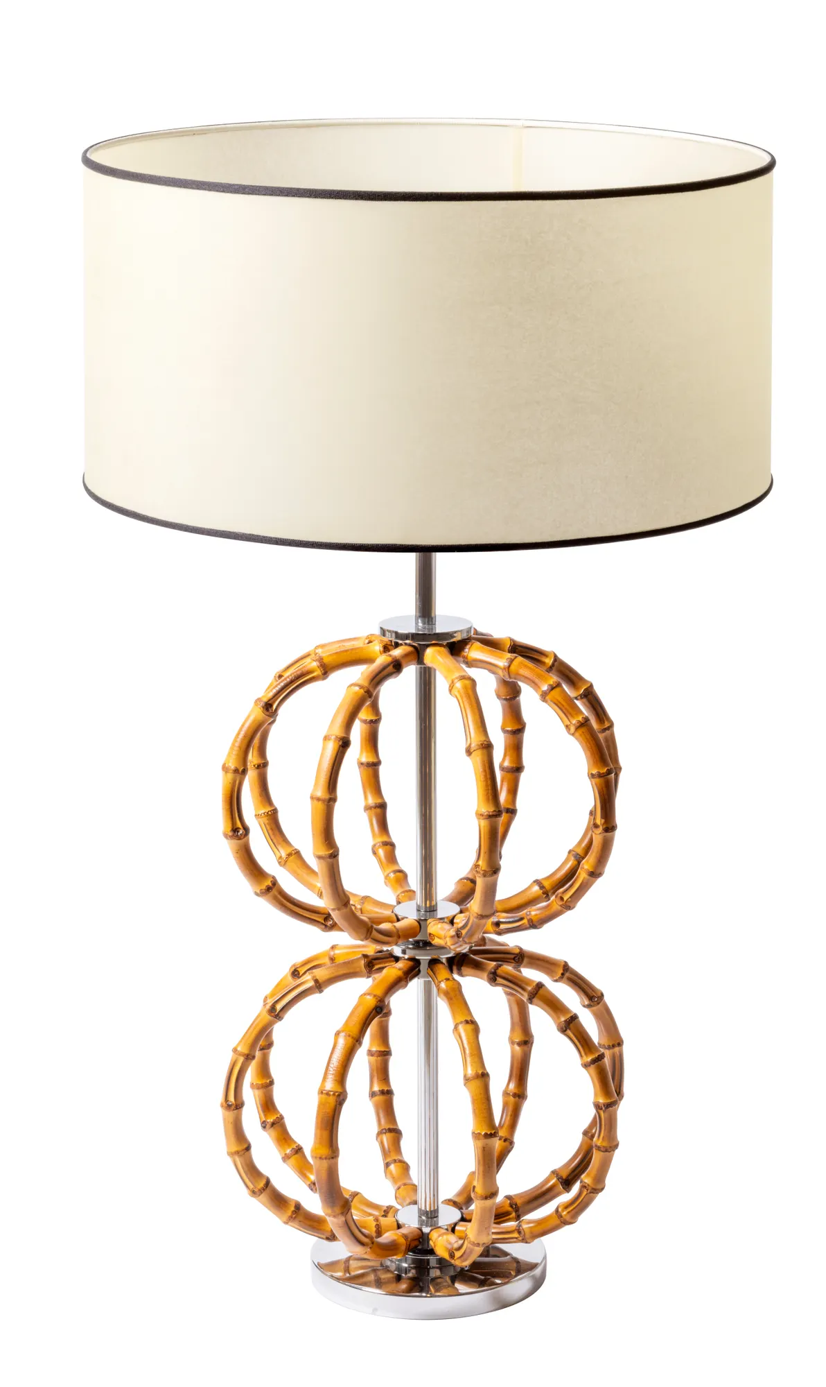 Natural bamboo lamp with chrome or gold metal base, double large sphere.