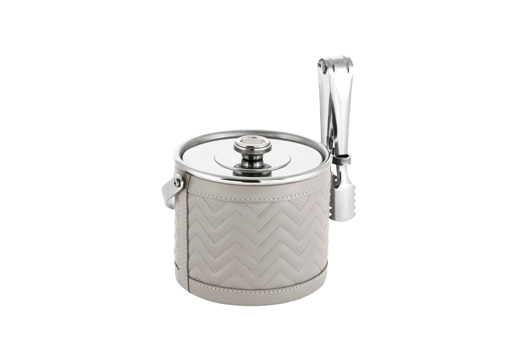 Stainless steel ice bucket covered with quilted herringbone leather.