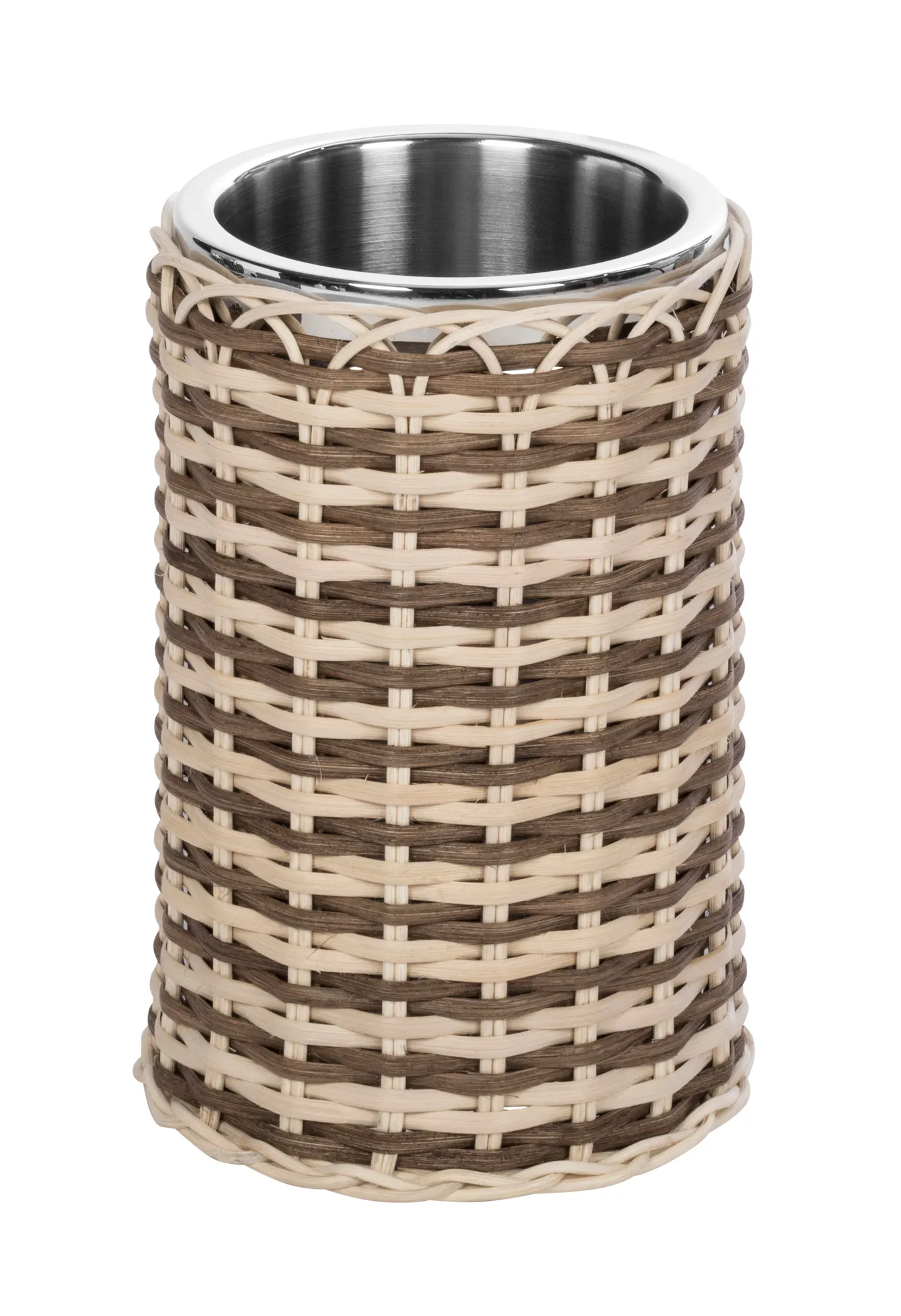 Two-chamber insulated stainless steel structure covered in rattan. Items able to keep bottles cool for several hours.