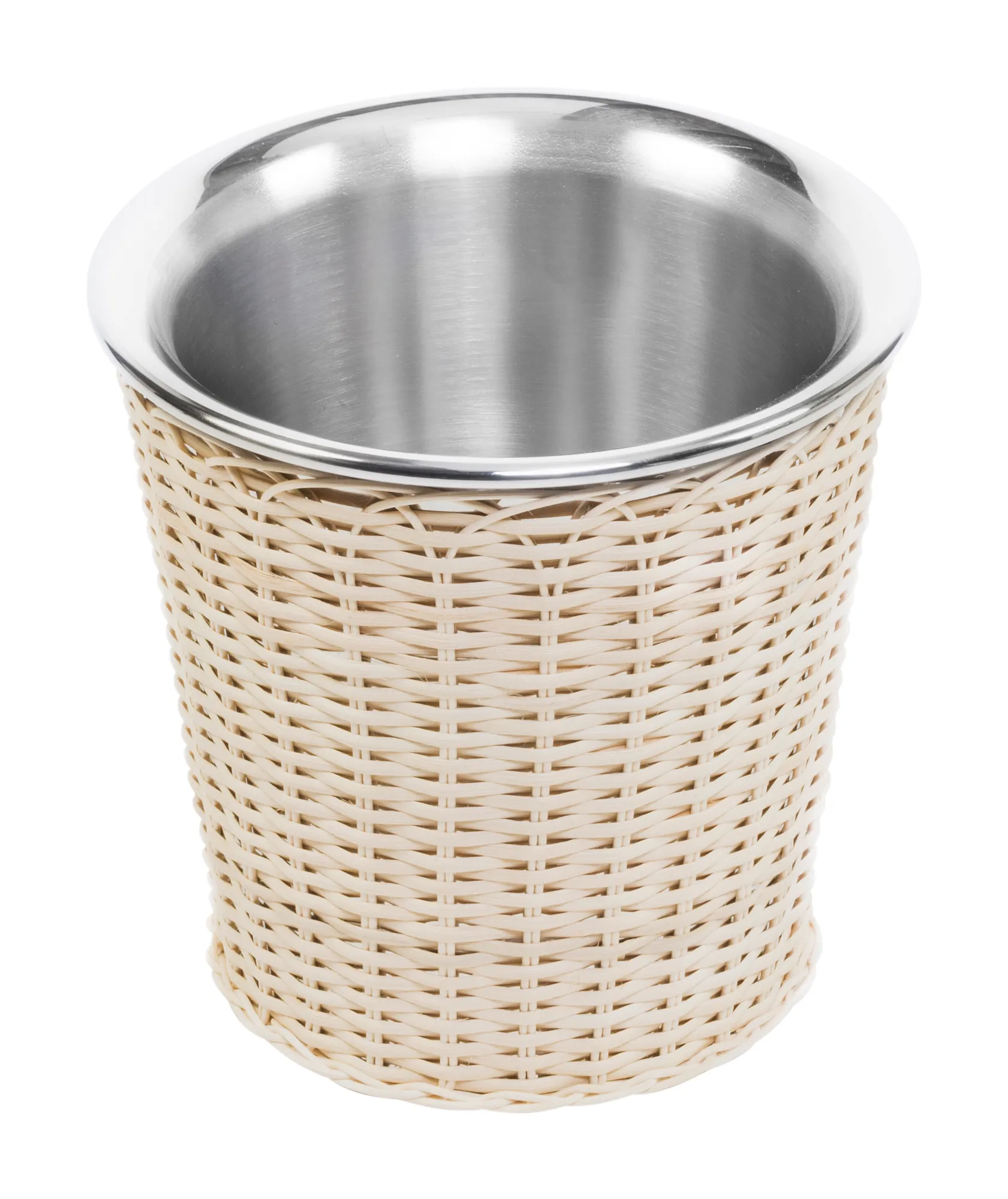 Two-chamber insulated stainless steel structure covered with rattan. This article's cooling action lasts for several hours.