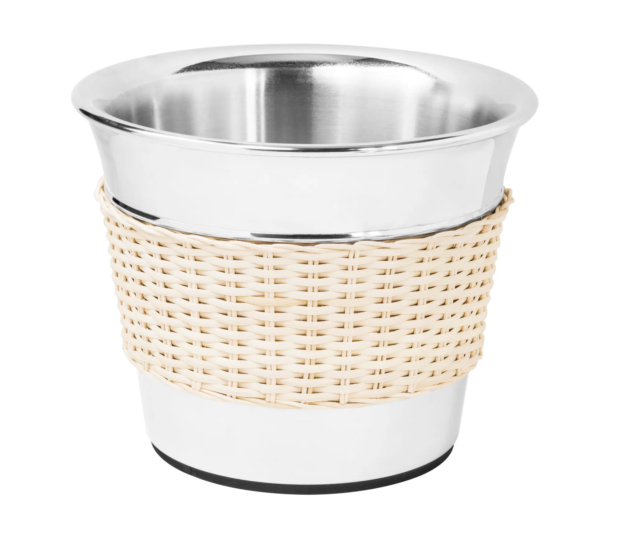 Two-chamber insulated stainless steel structure covered with rattan. This article's cooling action lasts for several hours.