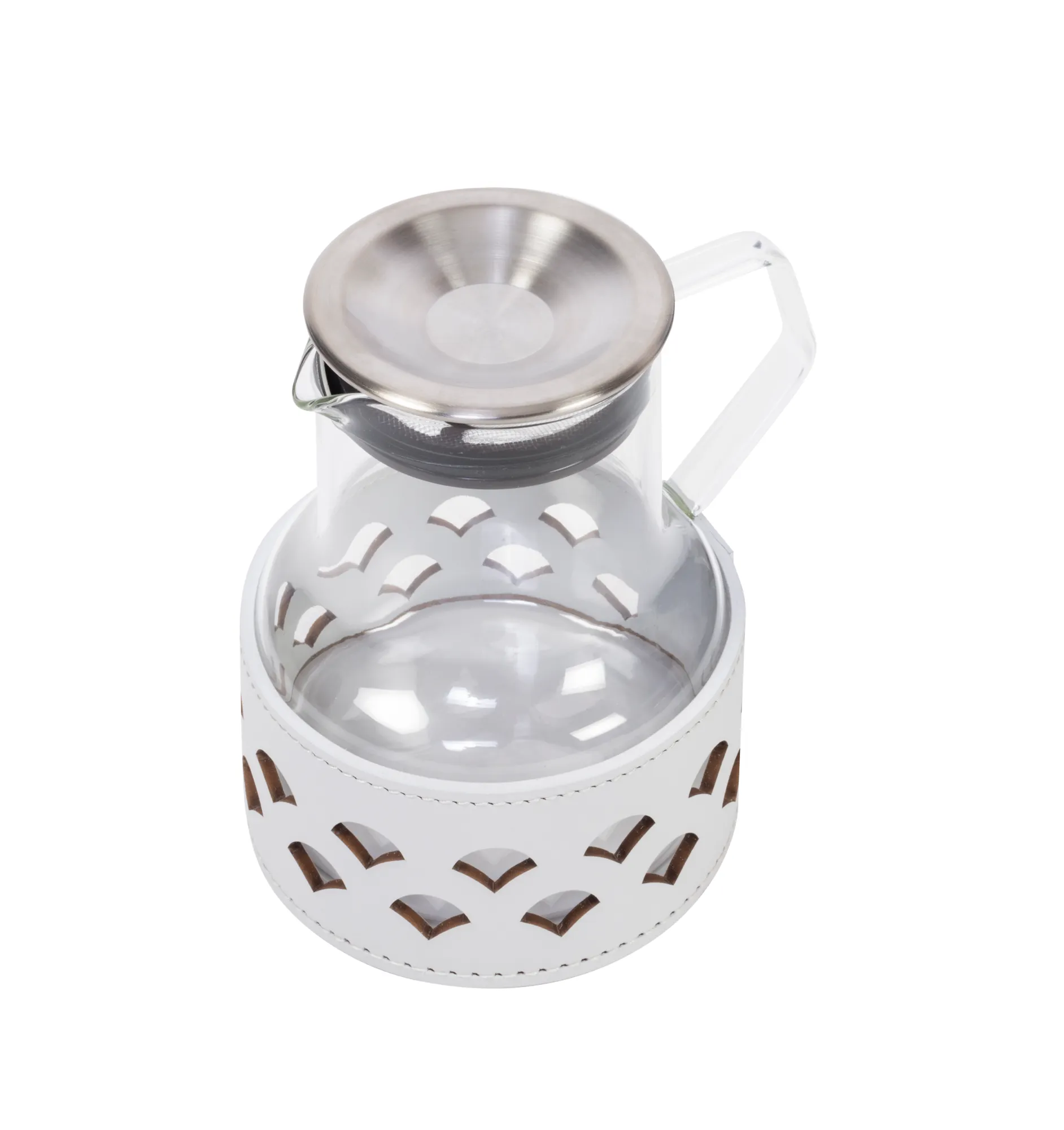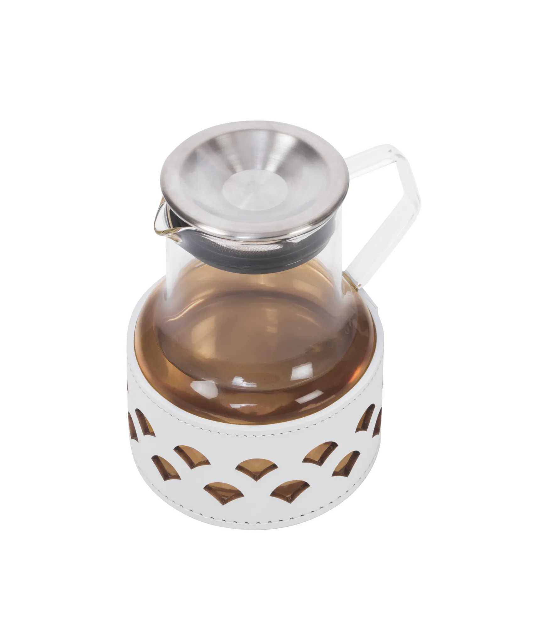 Transparent borosilicate glass partially dressed in finest regenerated leather with water-resistant and UV-resistant finish. Featuring a stainless steel lid with built-in filter and heat-resistant glass body, it can be used for both hot and cold drinks. Non-slip waterproof rubber base underneath. Removable cover for easy cleaning.