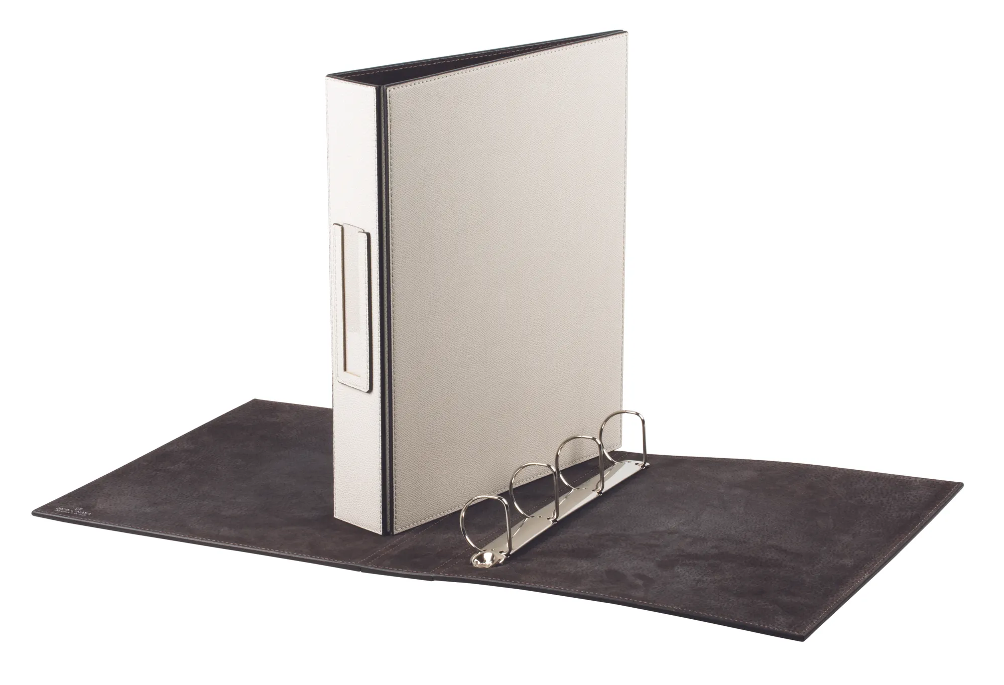 Leather cover and suede lining. 4 “D” rings Ø 4 cm. Title pocket on spine with plastic protector.