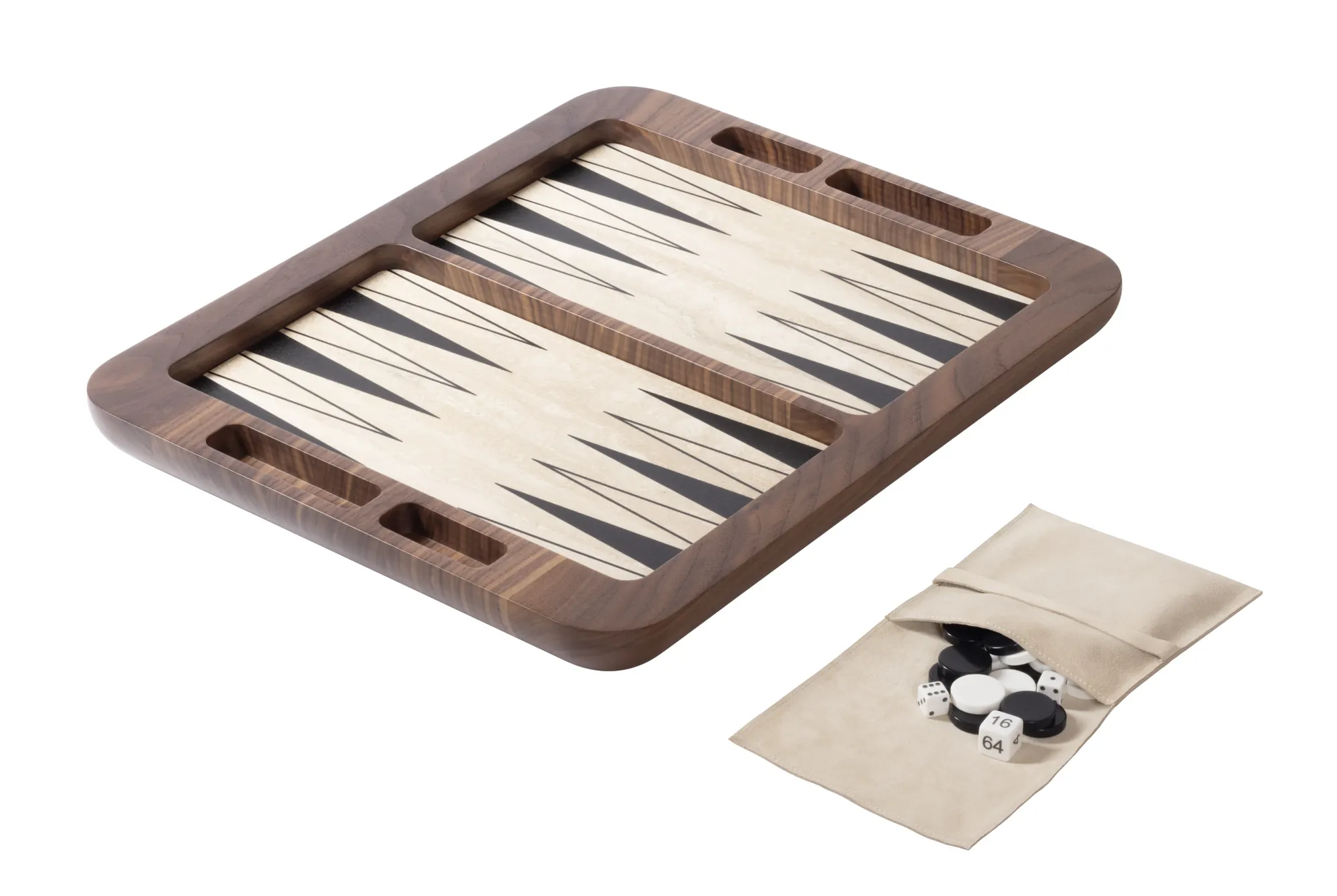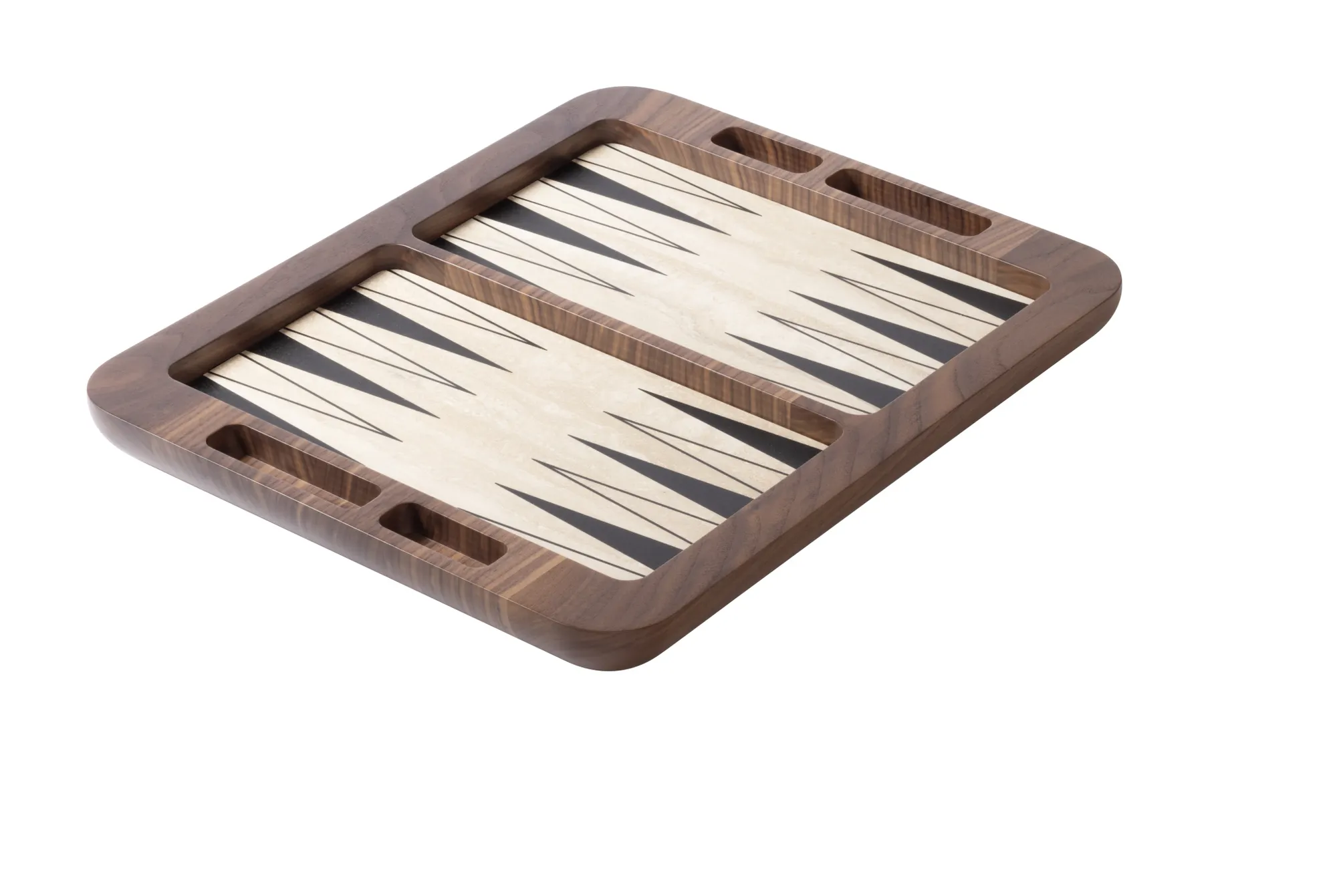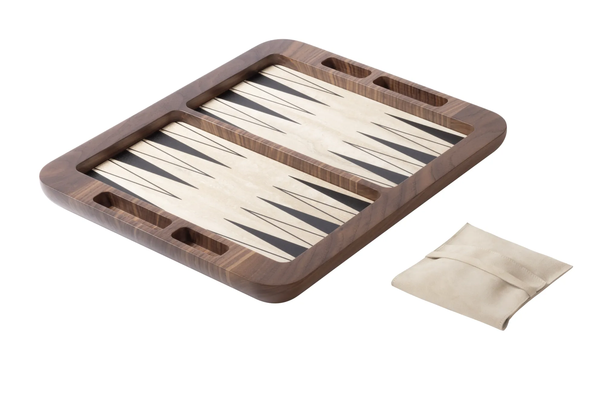 Large volumes in wood and stone are carved and sculpted to create playing fields with modeled, almost primitive lines. Connection and reflection creations that define everyday landscape. Solid walnut wood structure featuring a printed marble playing field and a fine suede bag containing the playing pieces when not used. The set is equipped with bakelite black and white backgammon checkers, 4 standard dice and a doubling cube. Design by Simone Fanciullacci.
