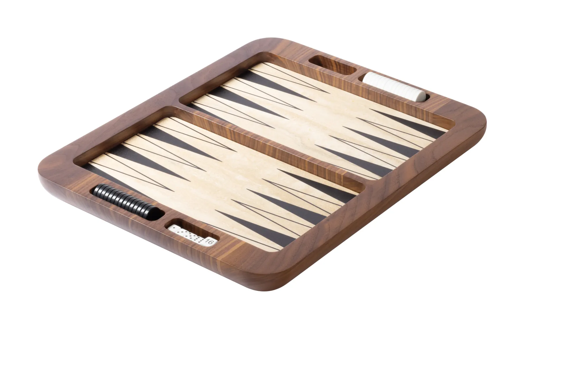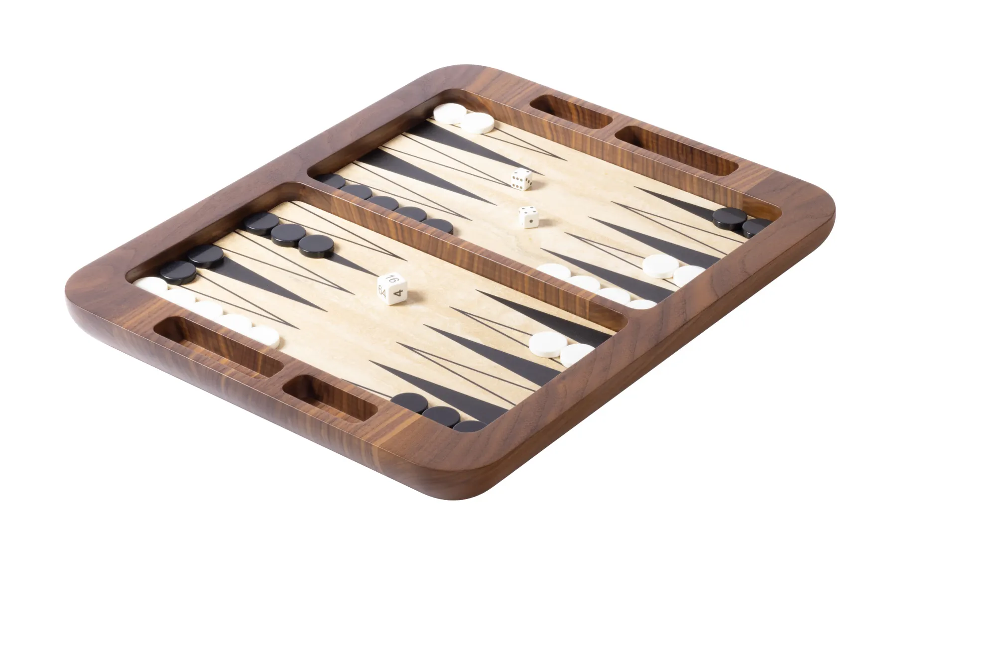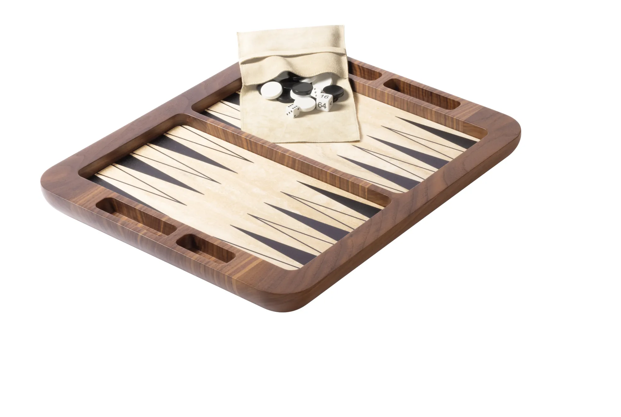 Large volumes in wood and stone are carved and sculpted to create playing fields with modeled, almost primitive lines. Connection and reflection creations that define everyday landscape. Solid walnut wood structure featuring a printed marble playing field and a fine suede bag containing the playing pieces when not used. The set is equipped with bakelite black and white backgammon checkers, 4 standard dice and a doubling cube. Design by Simone Fanciullacci.