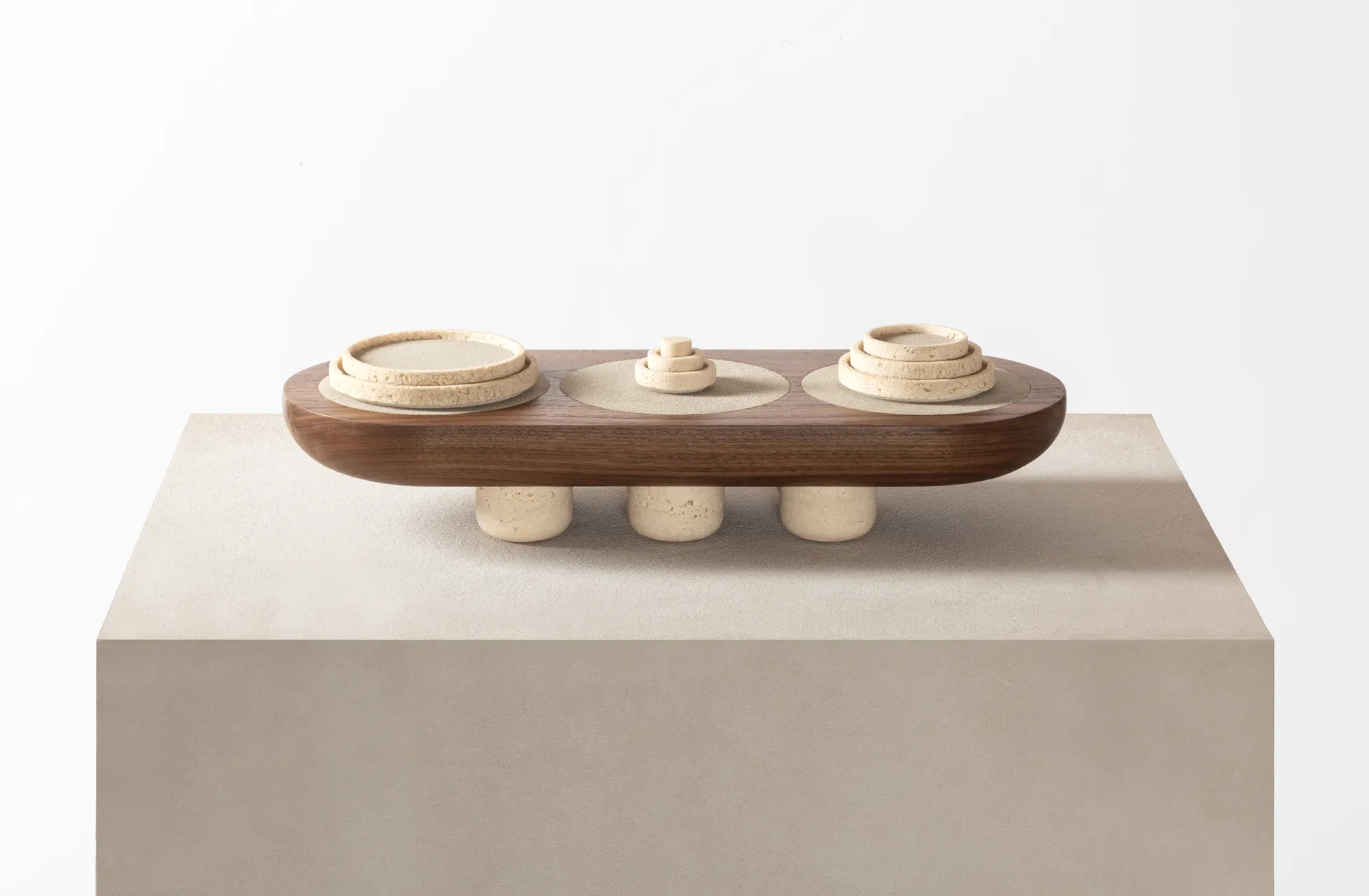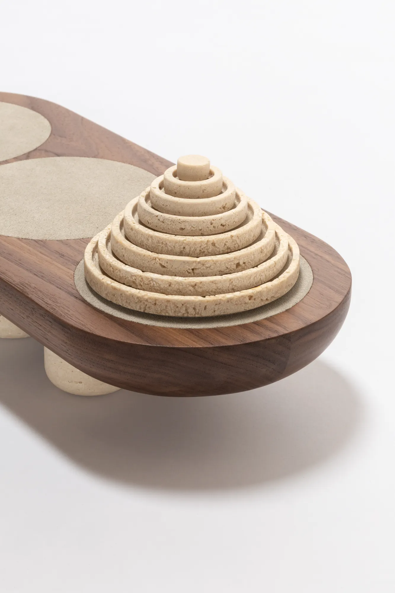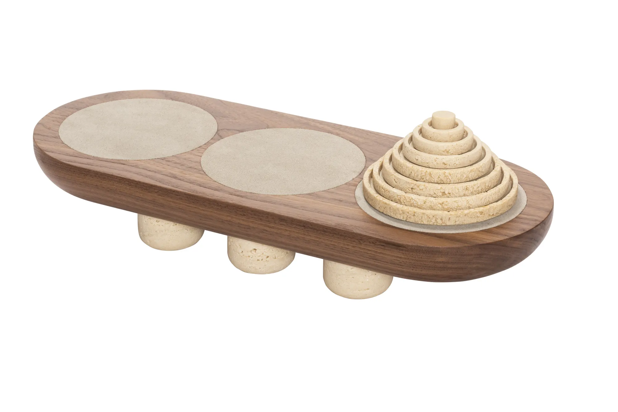 Large volumes in wood and stone are carved and sculpted to create playing fields with modeled, almost primitive lines. Connection and reflection creations that define everyday landscape. Solid walnut wood top with leather inserts standing on three marble legs. The set is equipped with marble playing pieces featuring in their turn fine leather inserts. Design by Simone Fanciullacci.