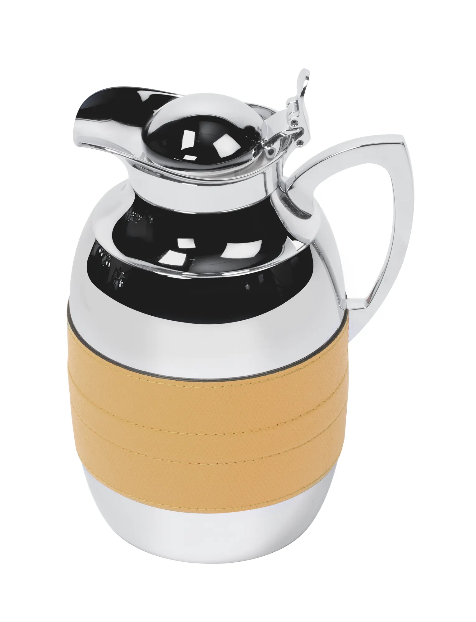 Partially leather covered insulated brass carafe with chrome-plated finish. Maintains liquids’ temperature for up to 12 hours.