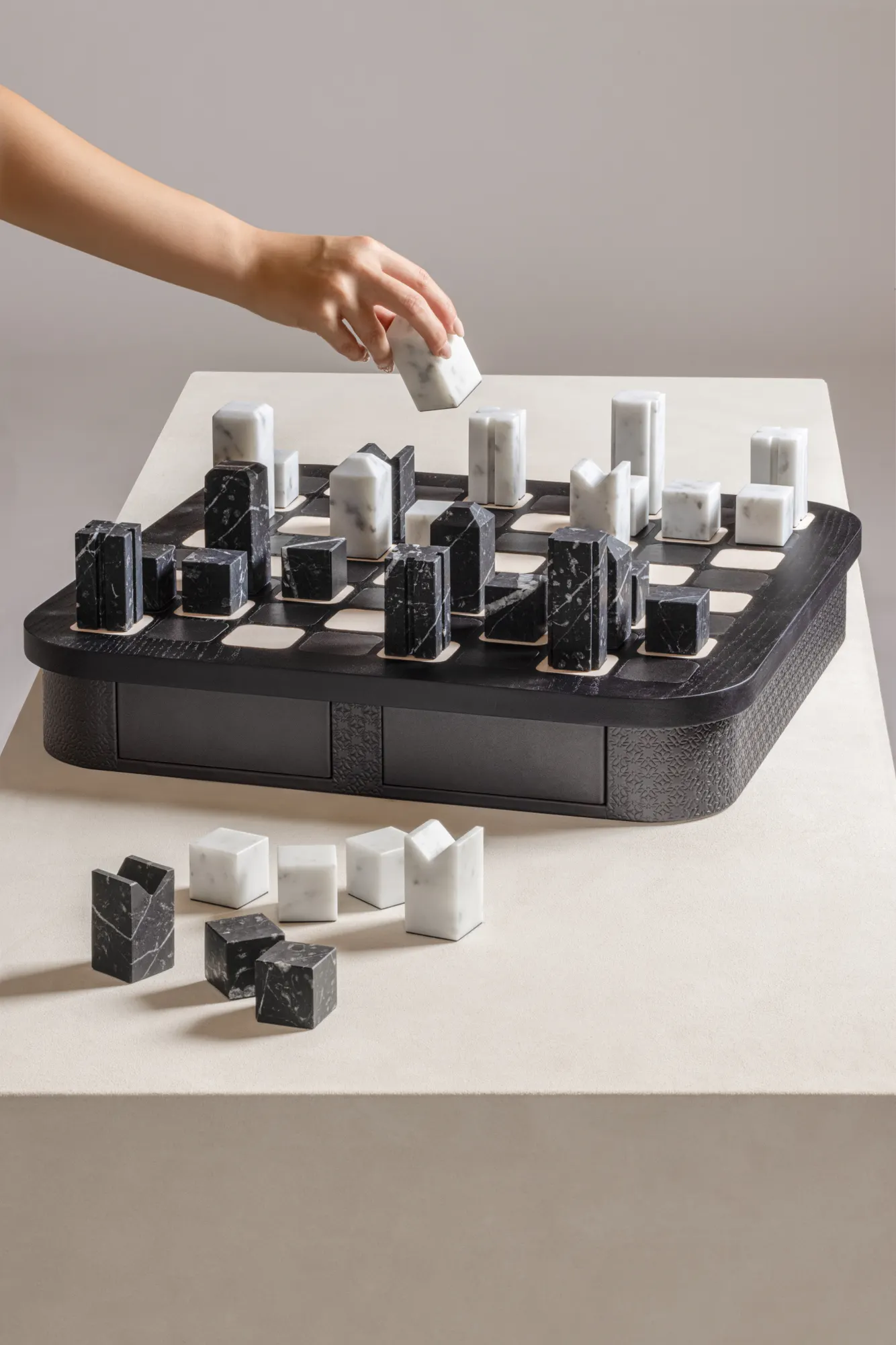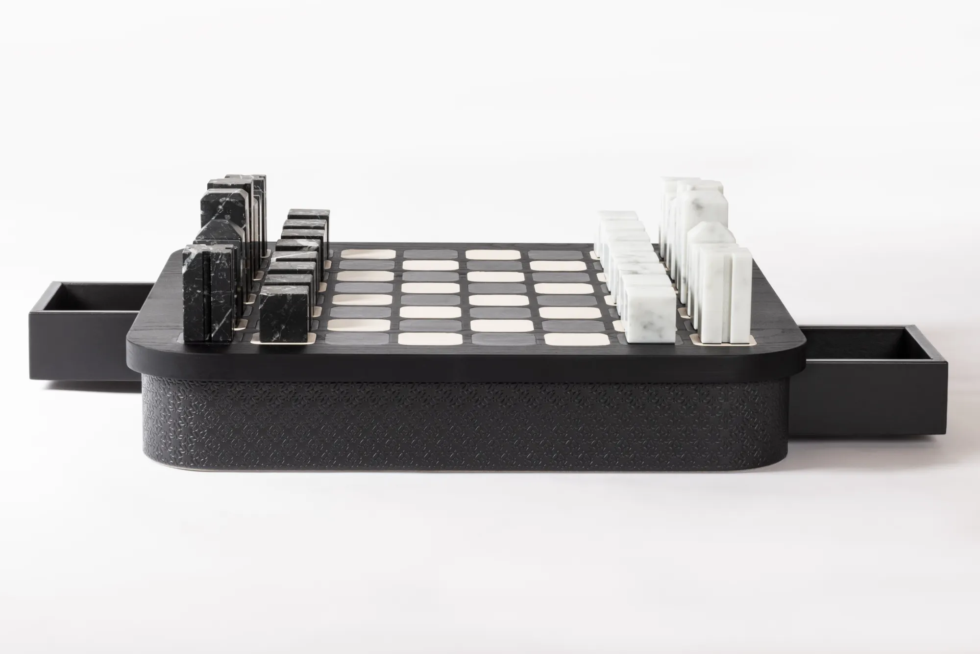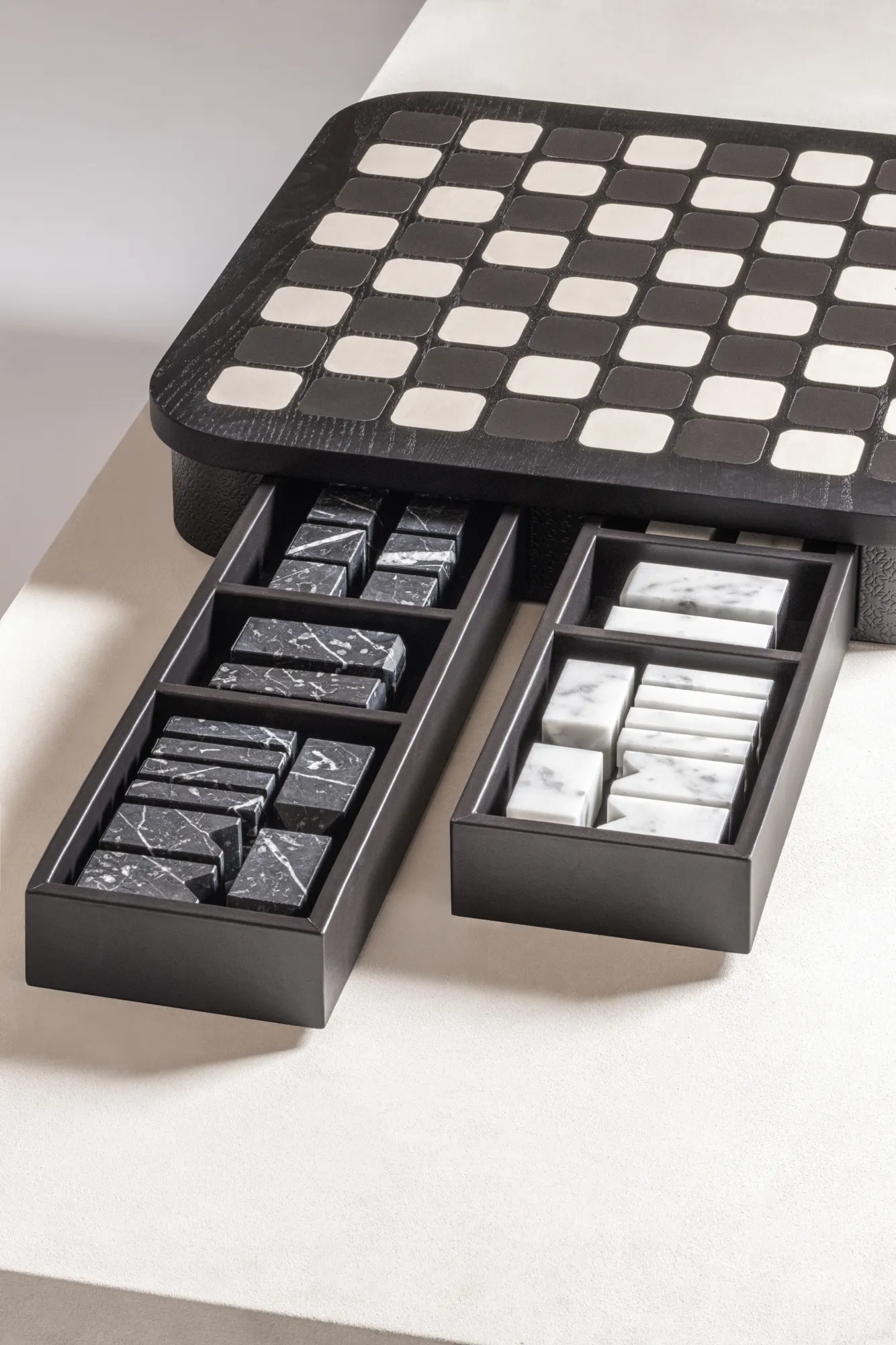 Wood structure featuring fine leather inserts on top and a leather base featuring the ELIE SAAB Monogram pattern. The base encases a couple of magnetic drawers with spaces to store the playing pieces: two sets respectively made in white Carrara and black Marquinia marbles.