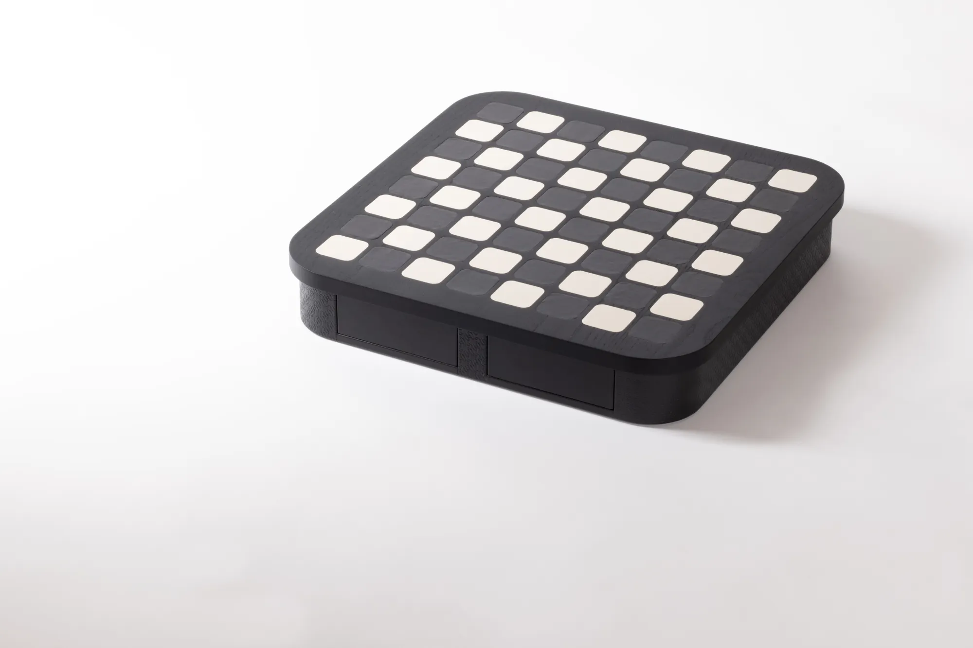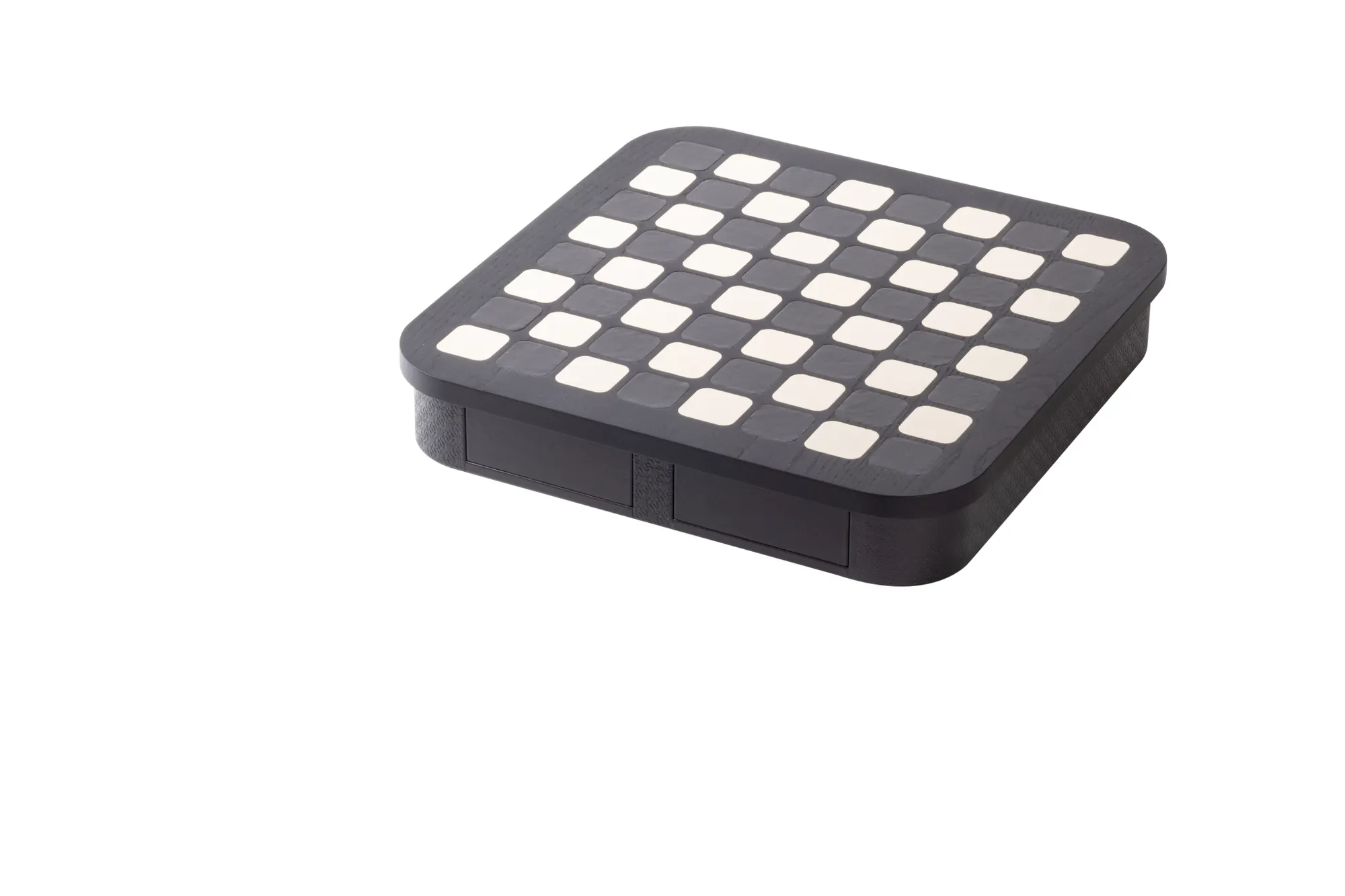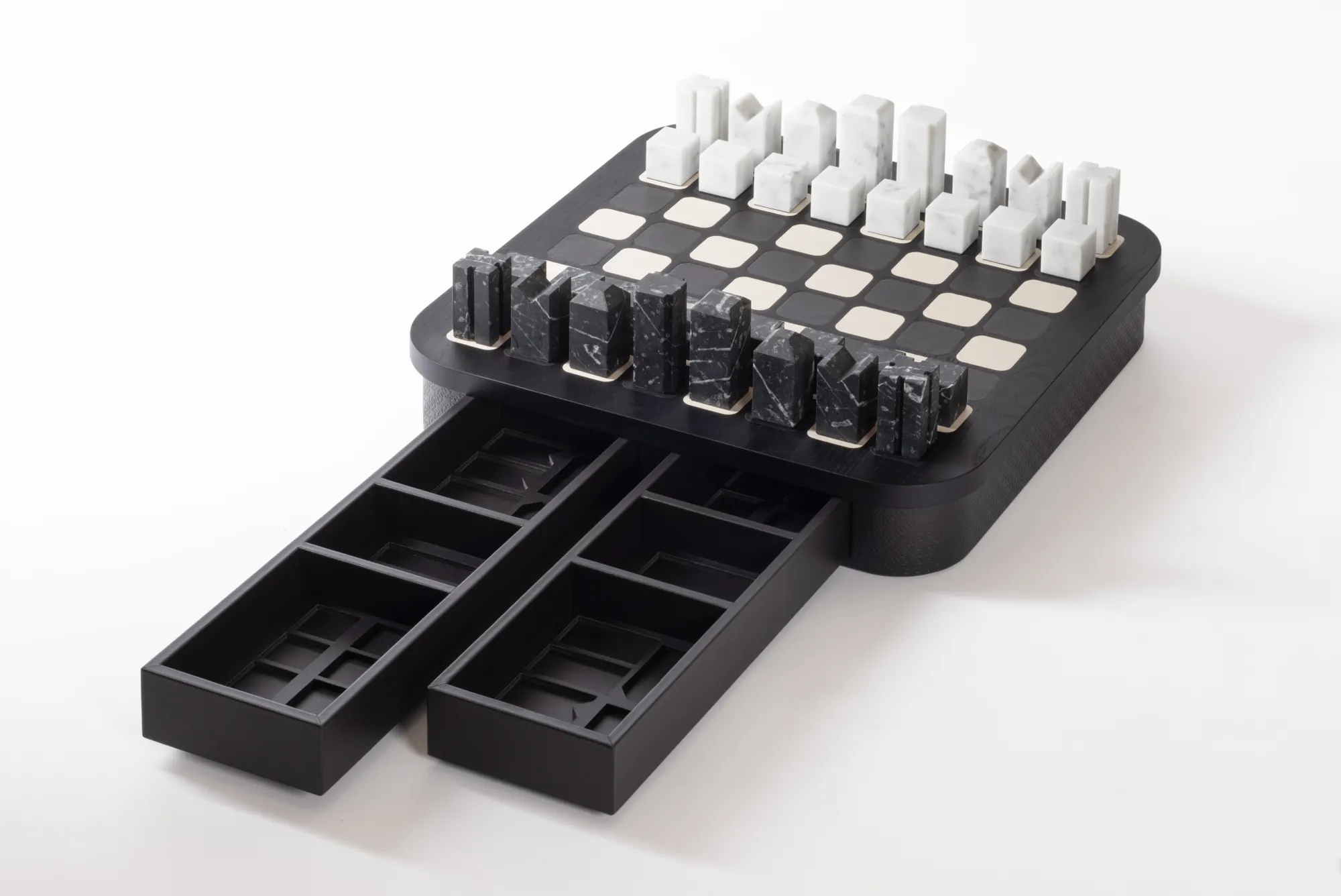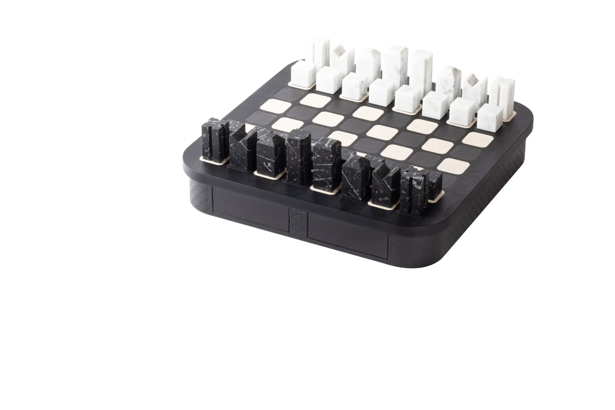 Wood structure featuring fine leather inserts on top and a leather base featuring the ELIE SAAB Monogram pattern. The base encases a couple of magnetic drawers with spaces to store the playing pieces: two sets respectively made in white Carrara and black Marquinia marbles.