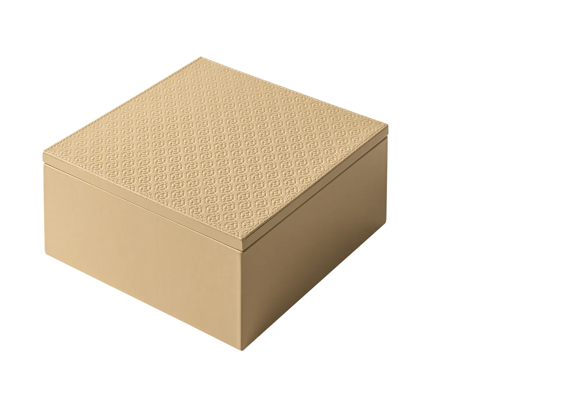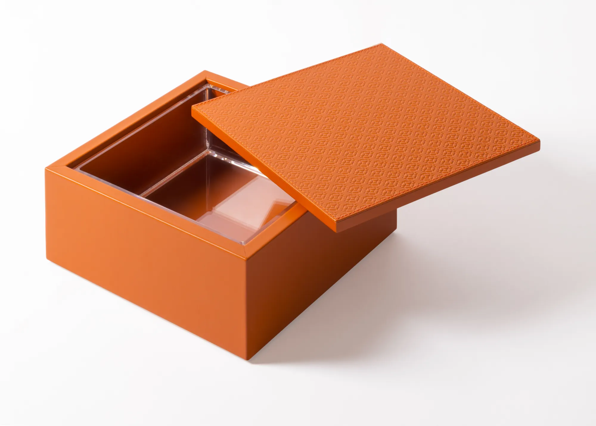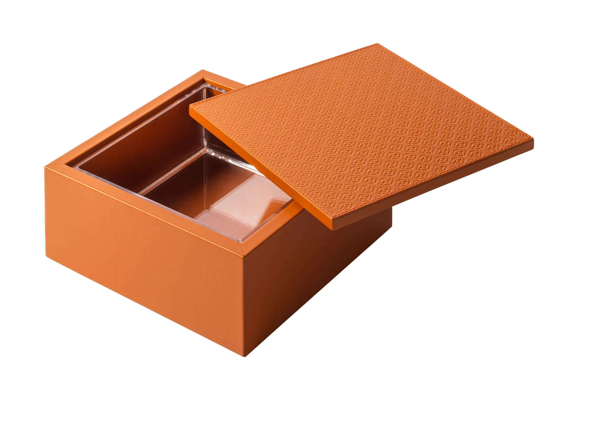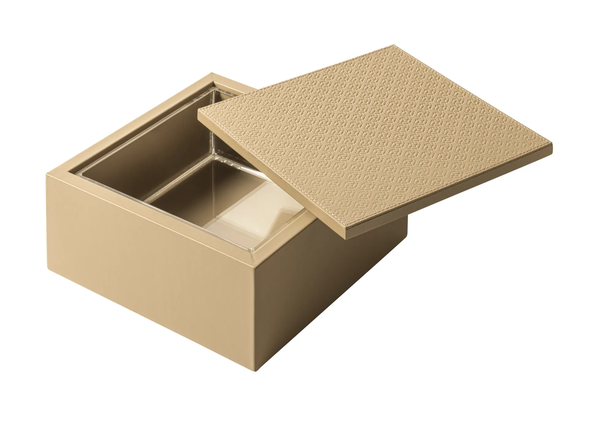 Leather box featuring the ELIE SAAB Monogram pattern on the lid and an acrylic removable inner container that ensures an easy cleaning.