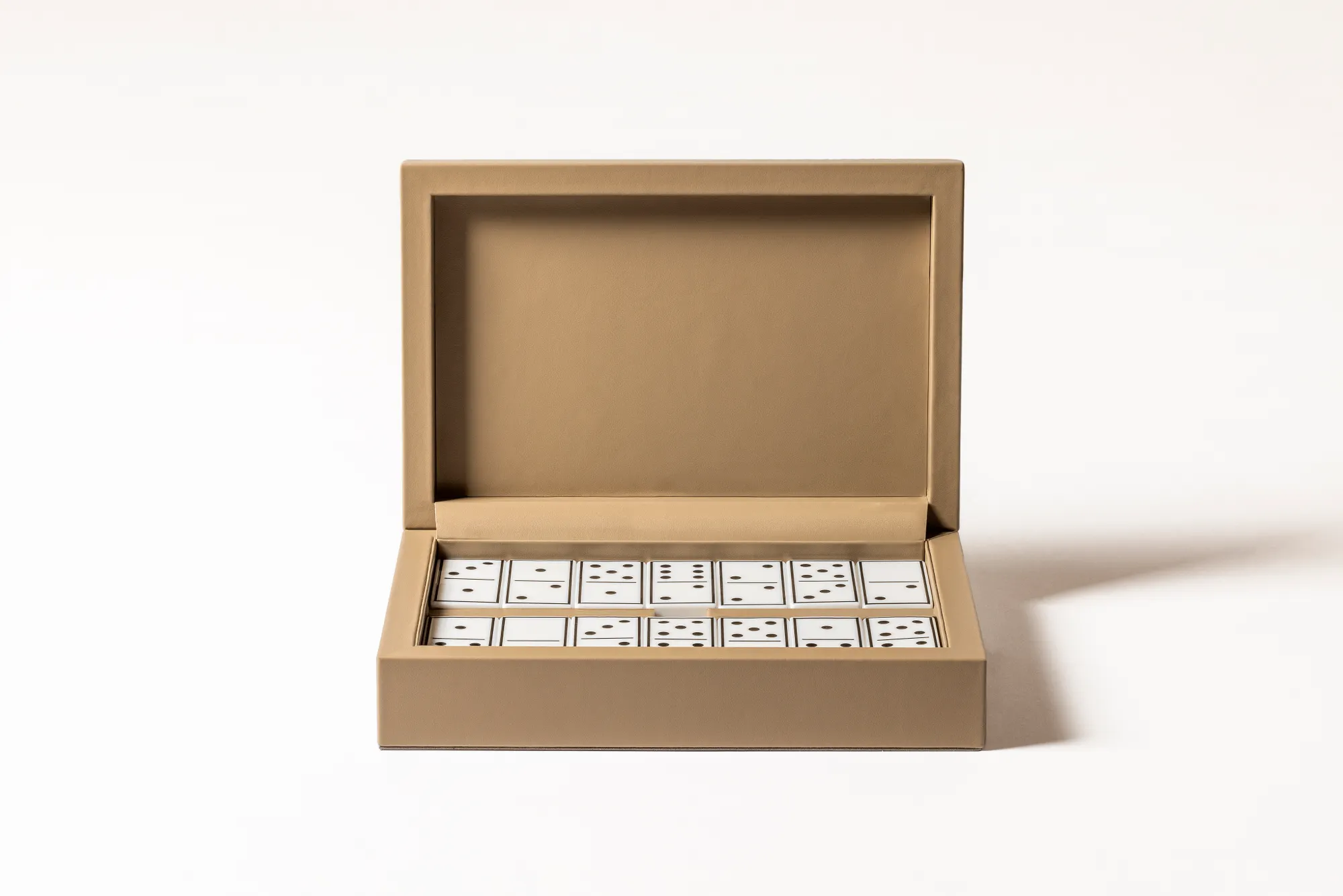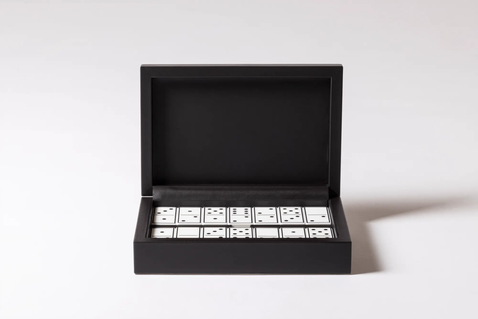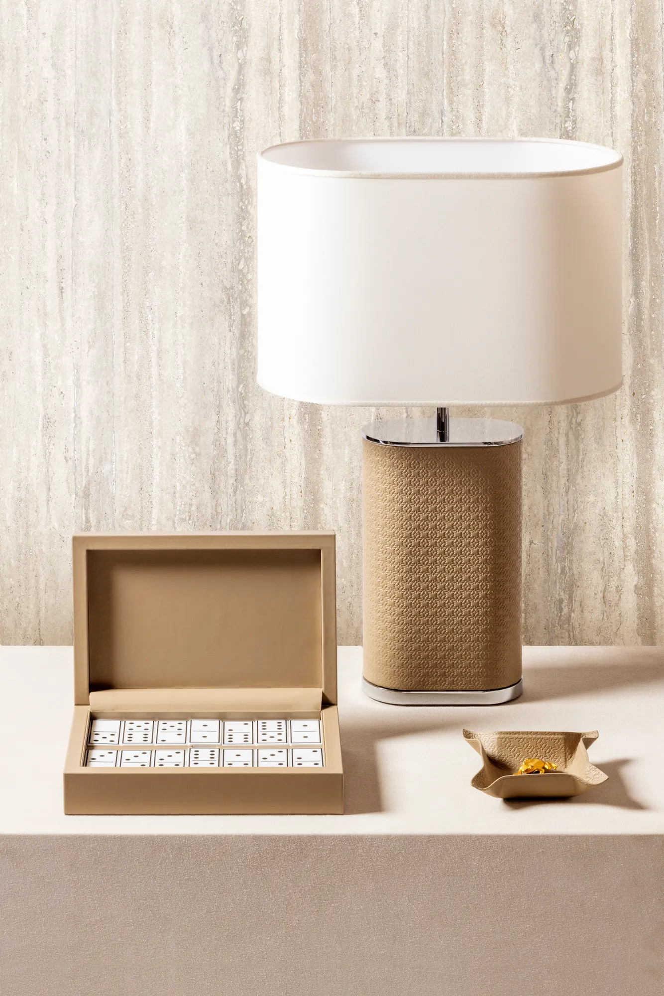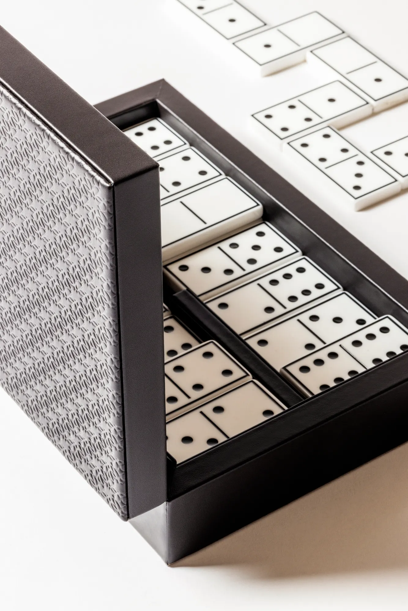 Leather box with hinged leather lid featuring the ELIE SAAB Monogram pattern. Set equipped with highly resistant glossy plexiglass domino pieces.