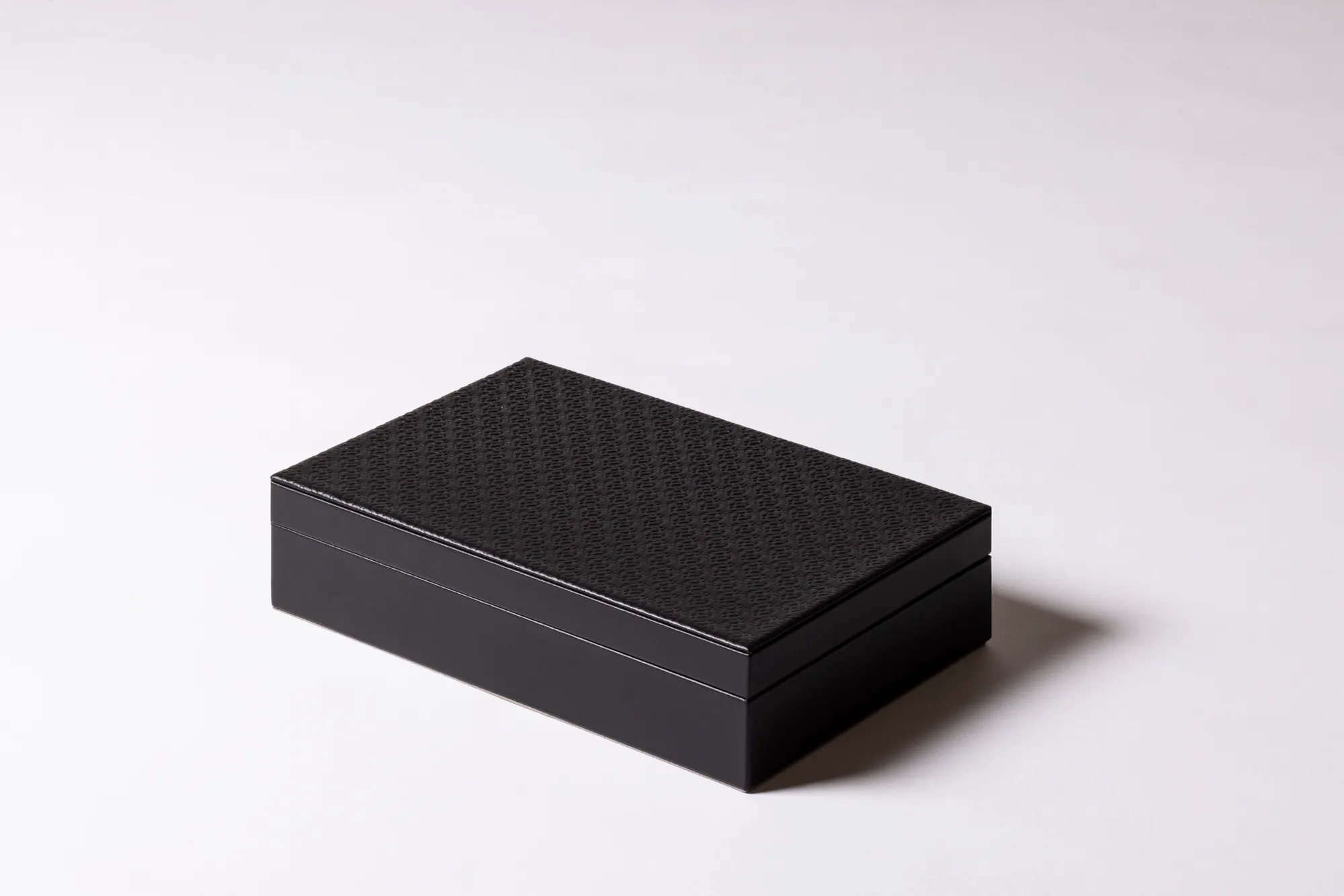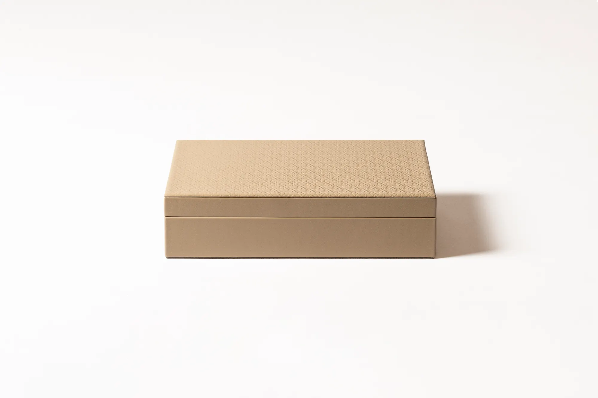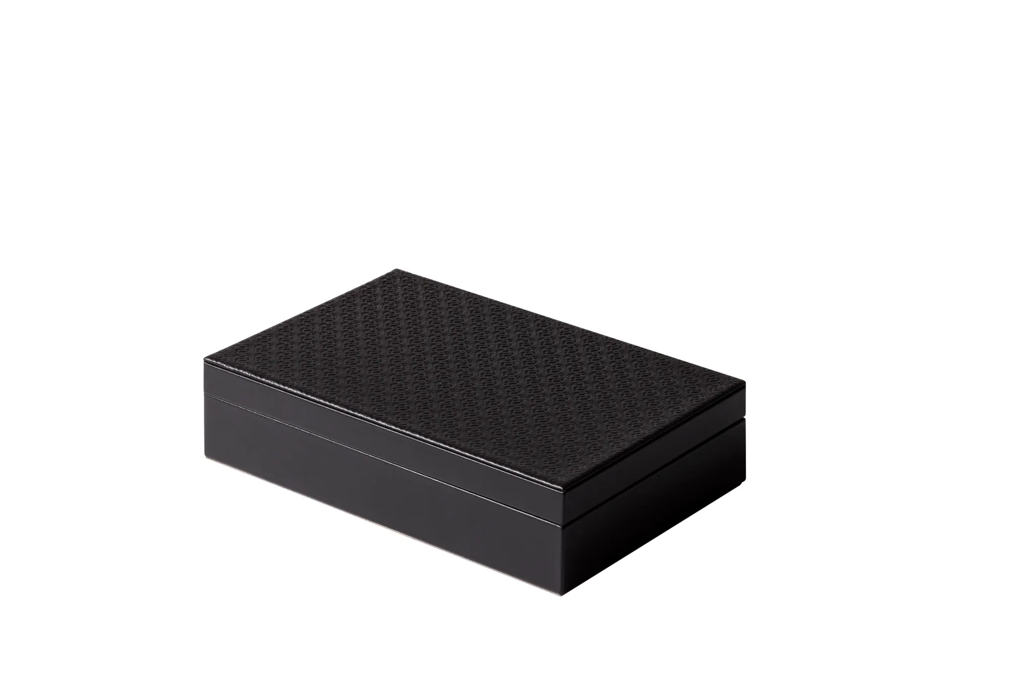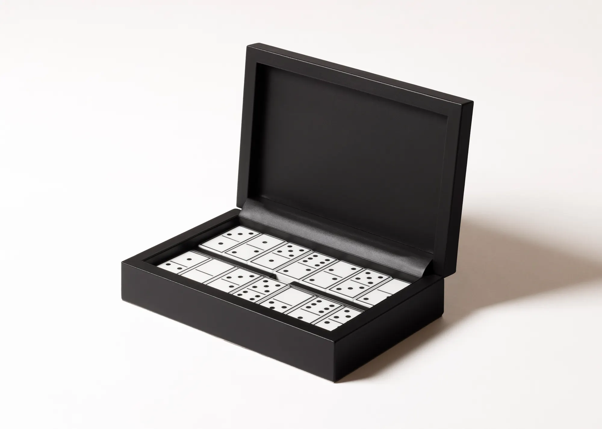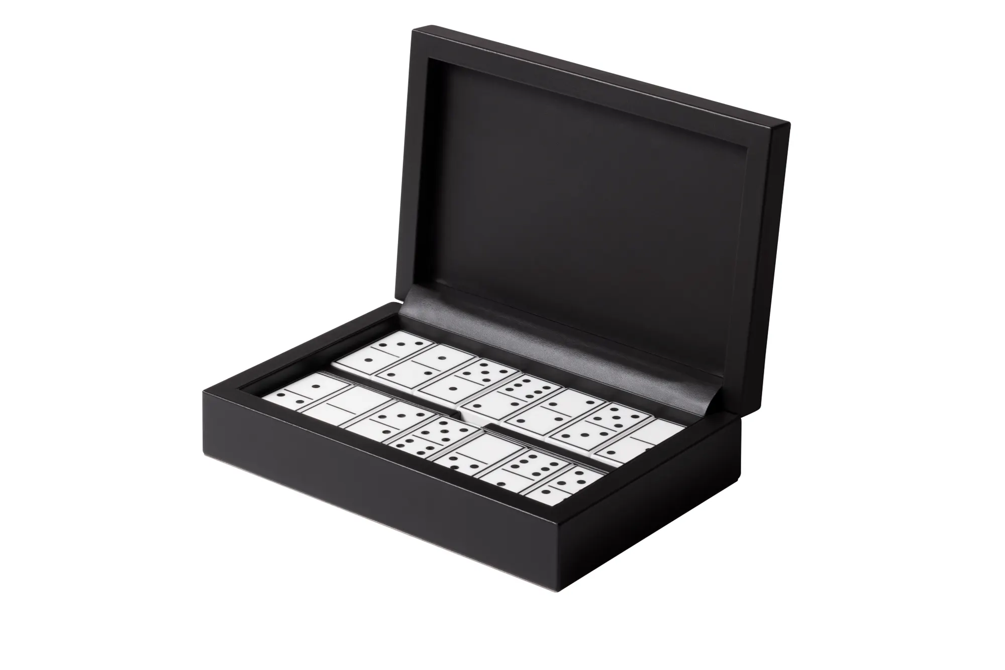 Leather box with hinged leather lid featuring the ELIE SAAB Monogram pattern. Set equipped with highly resistant glossy plexiglass domino pieces.