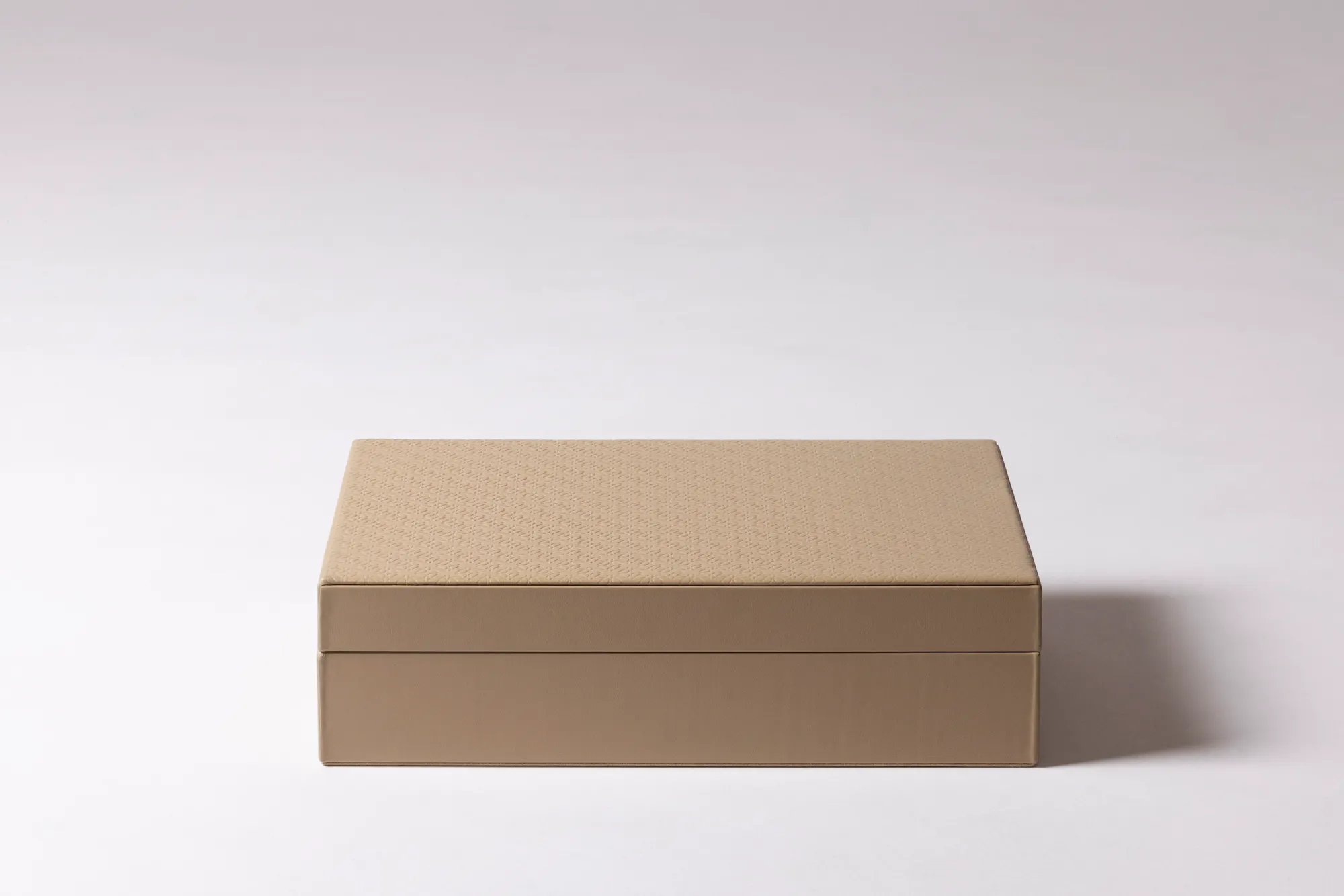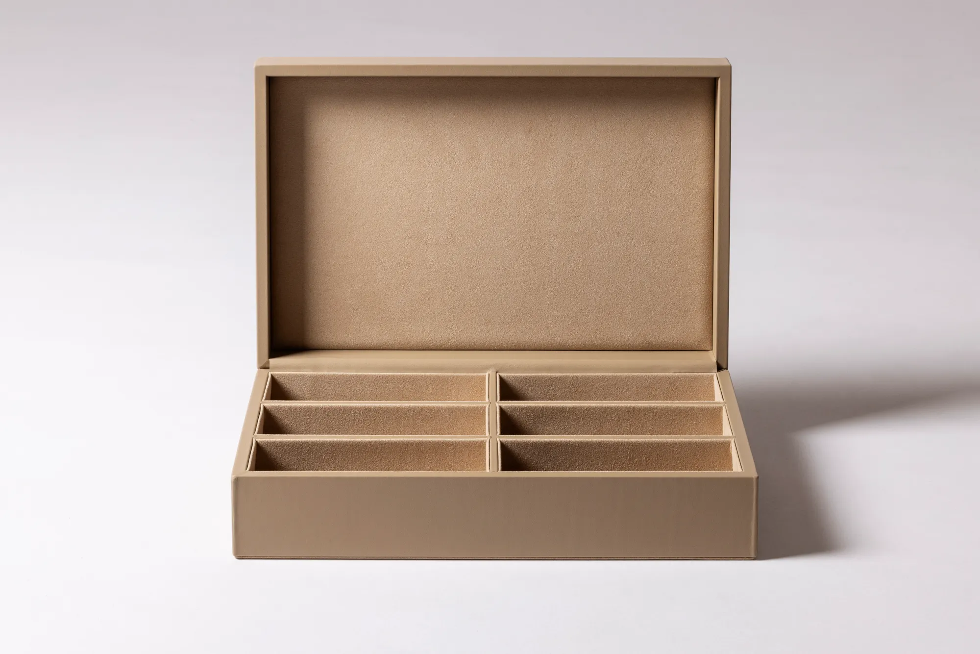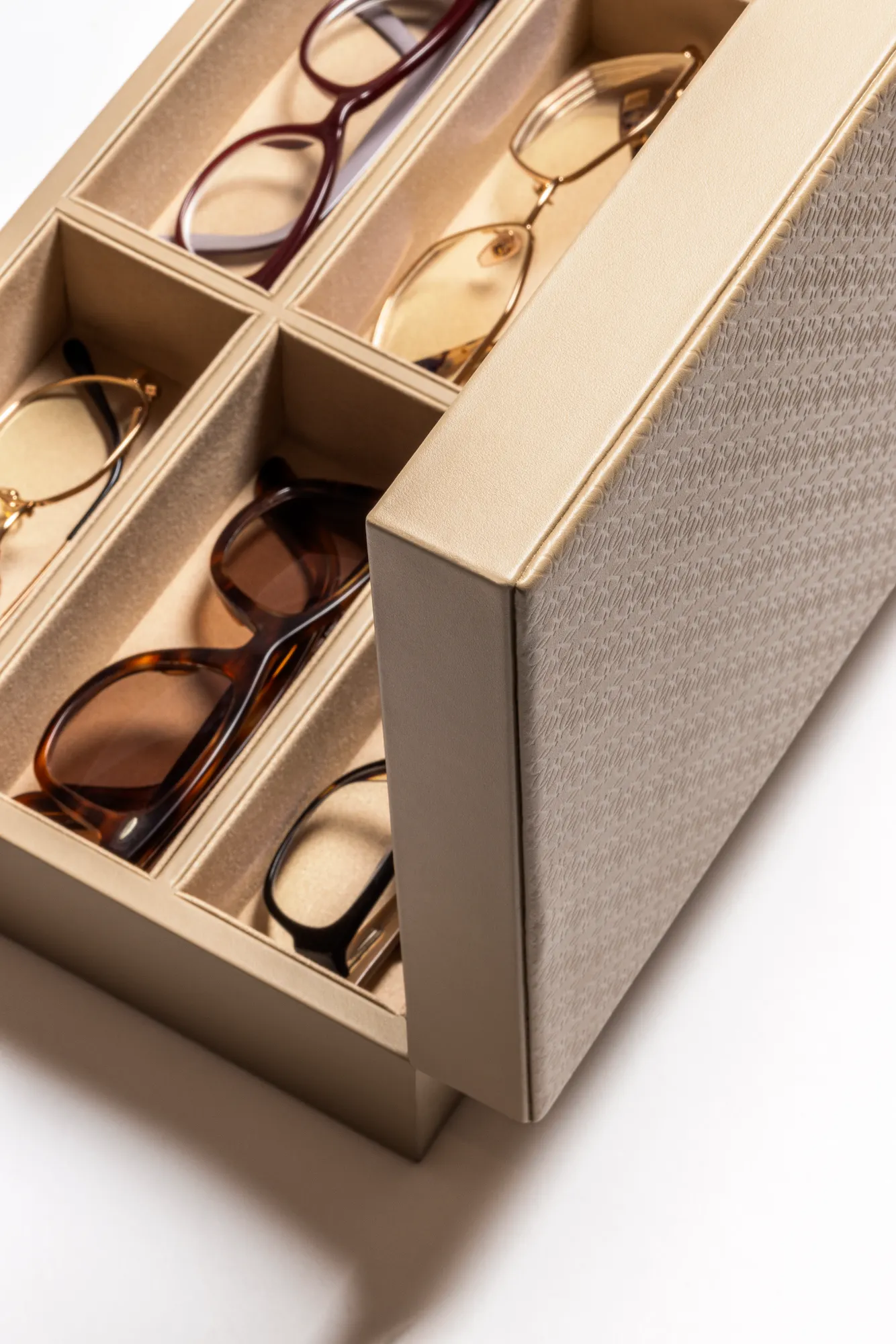 Leather glasses box with six spaces, suede lining and hinged leather lid featuring the ELIE SAAB Monogram pattern.