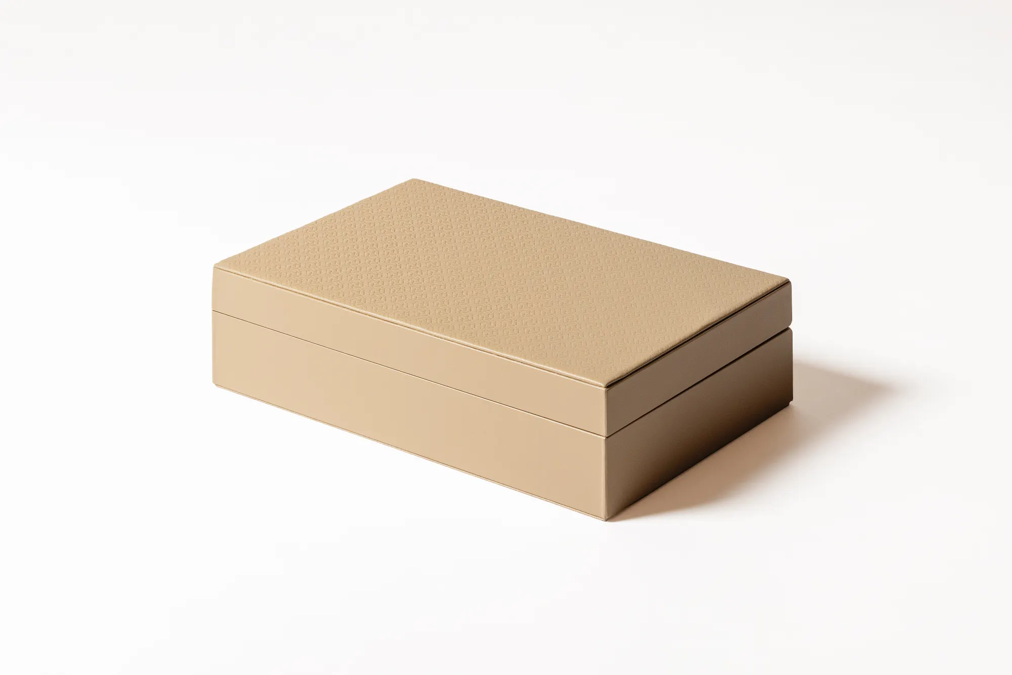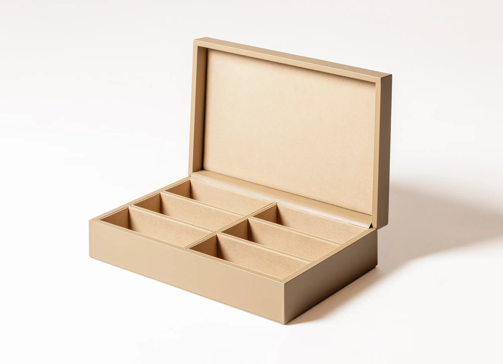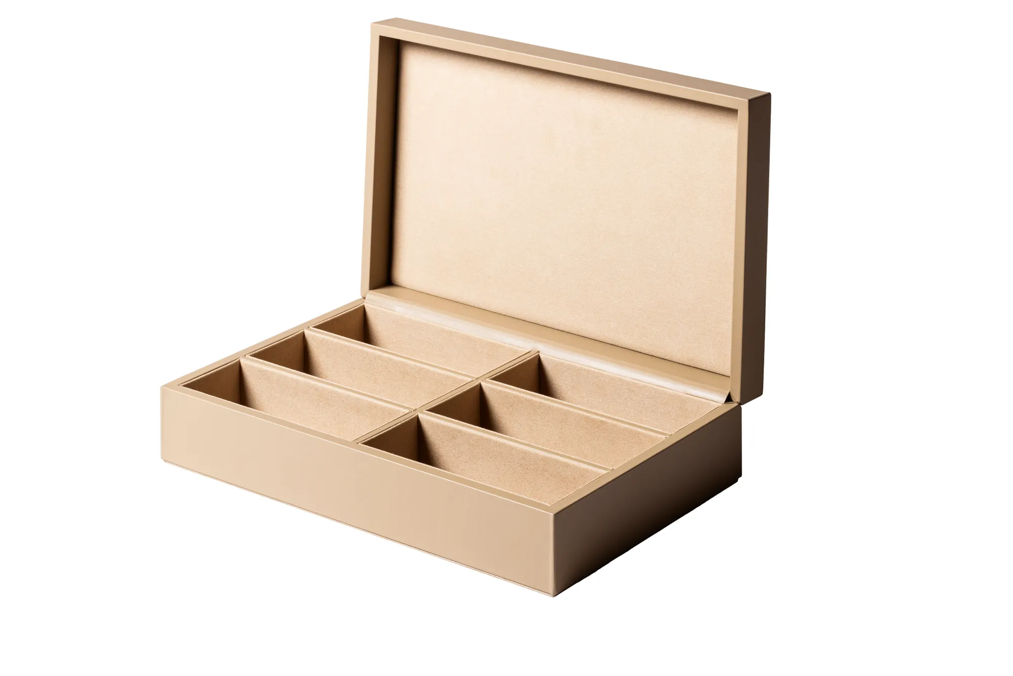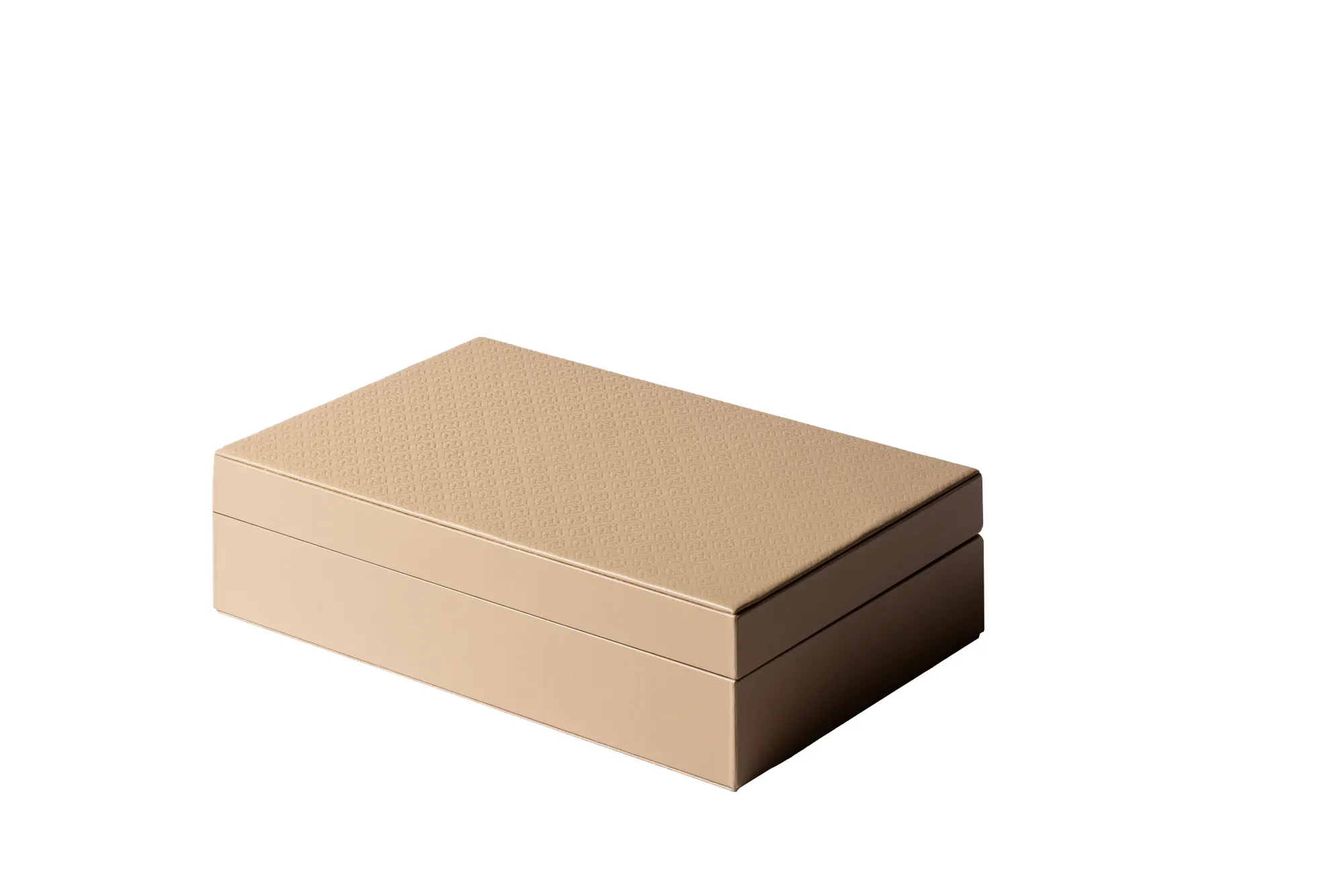 Leather glasses box with six spaces, suede lining and hinged leather lid featuring the ELIE SAAB Monogram pattern.