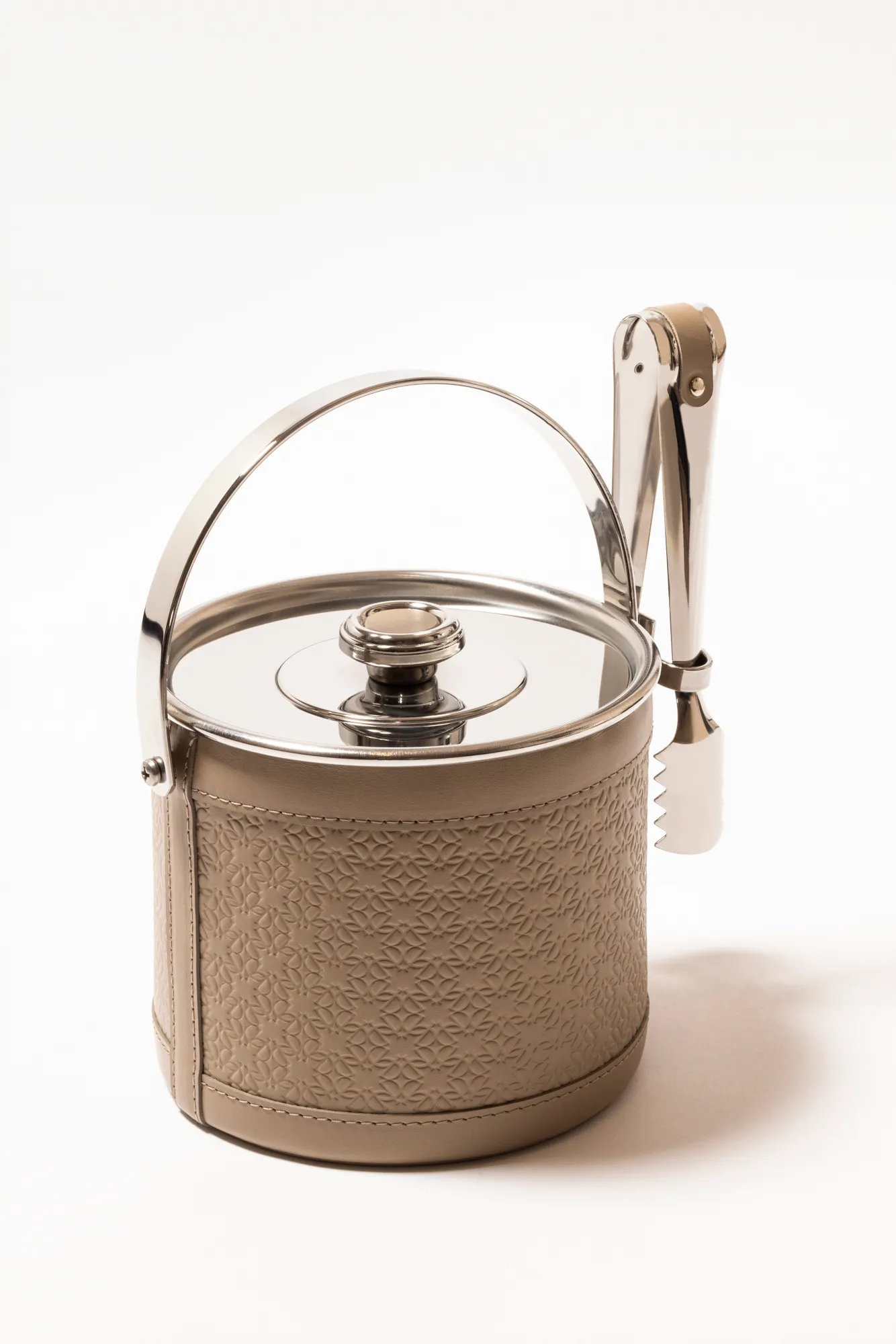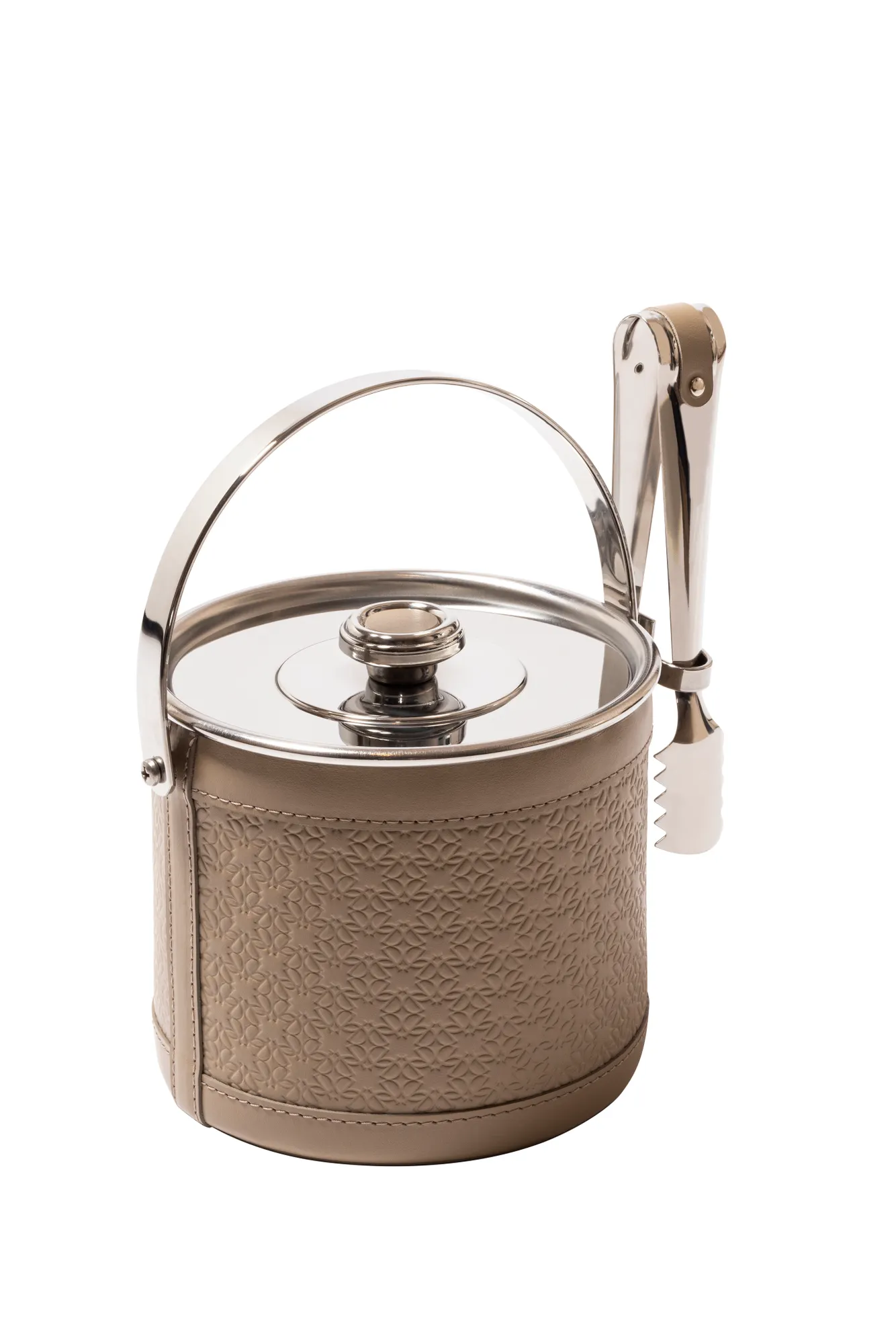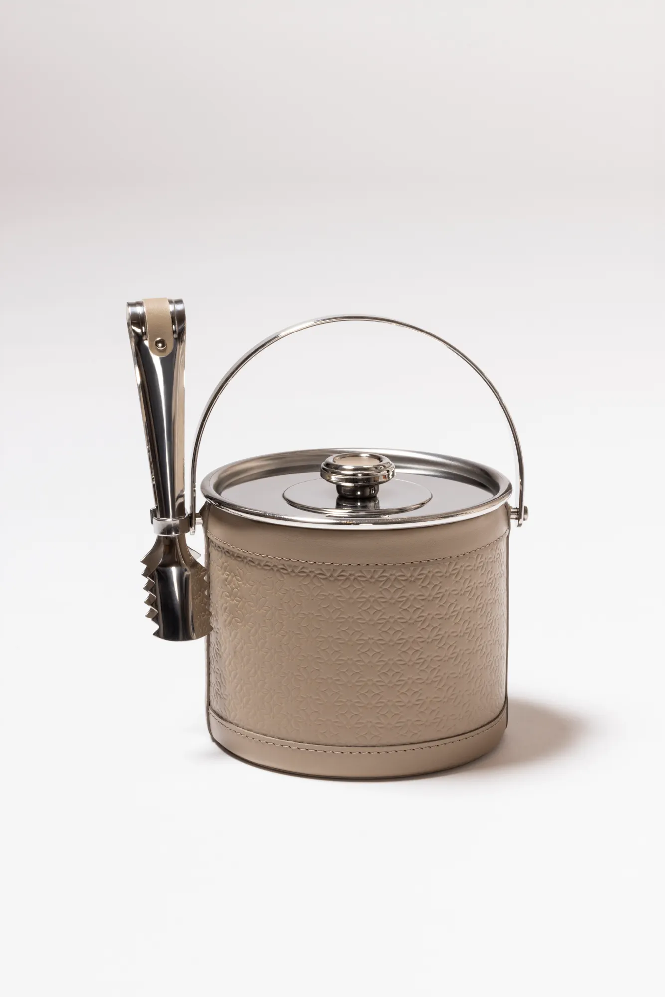 Stainless steel ice bucket covered with leather featuring the ELIE SAAB Monogram pattern on two sides.