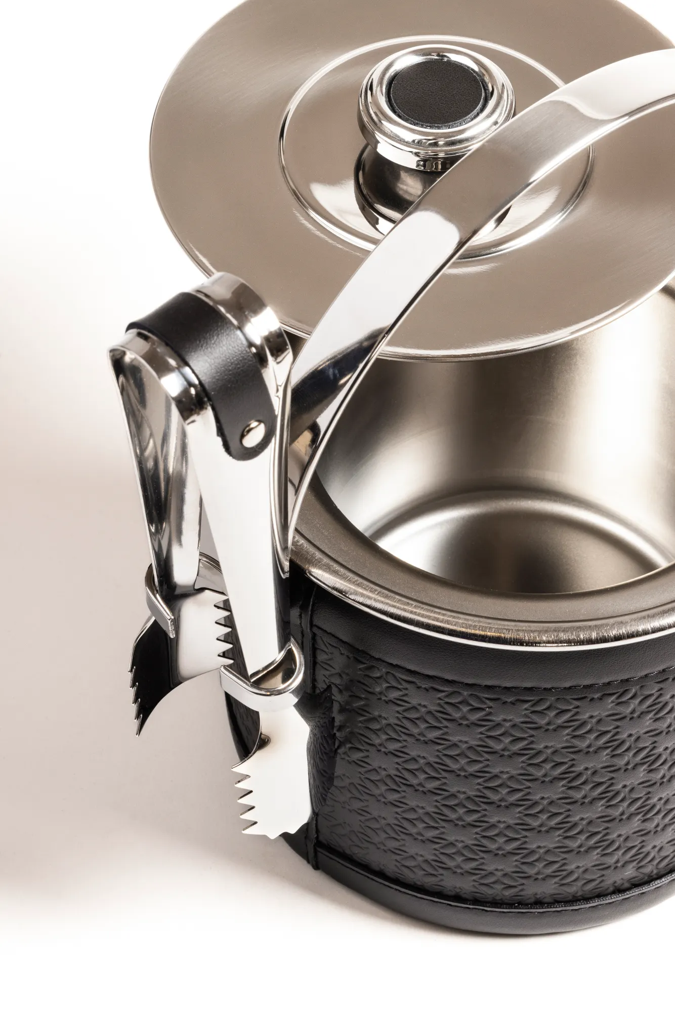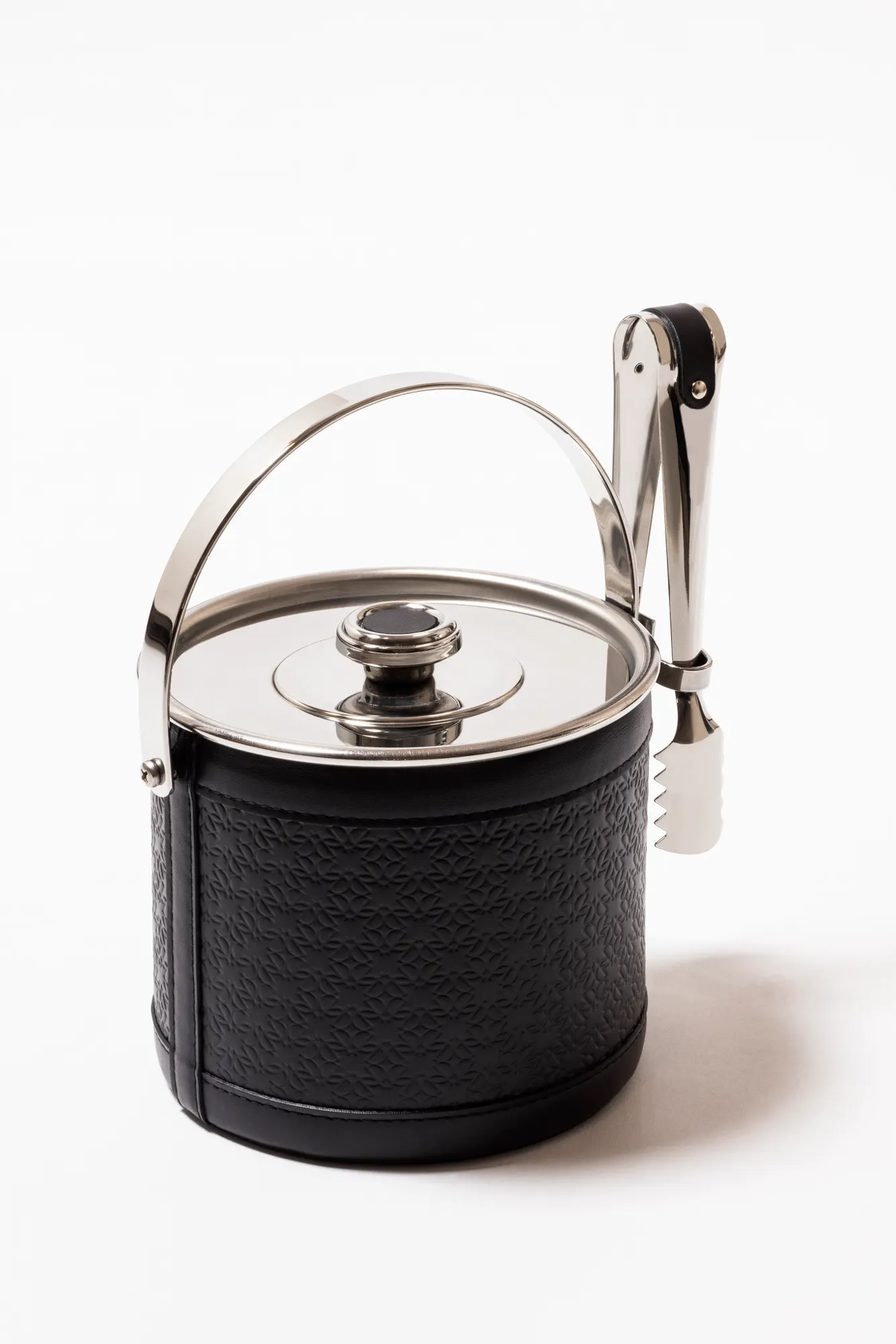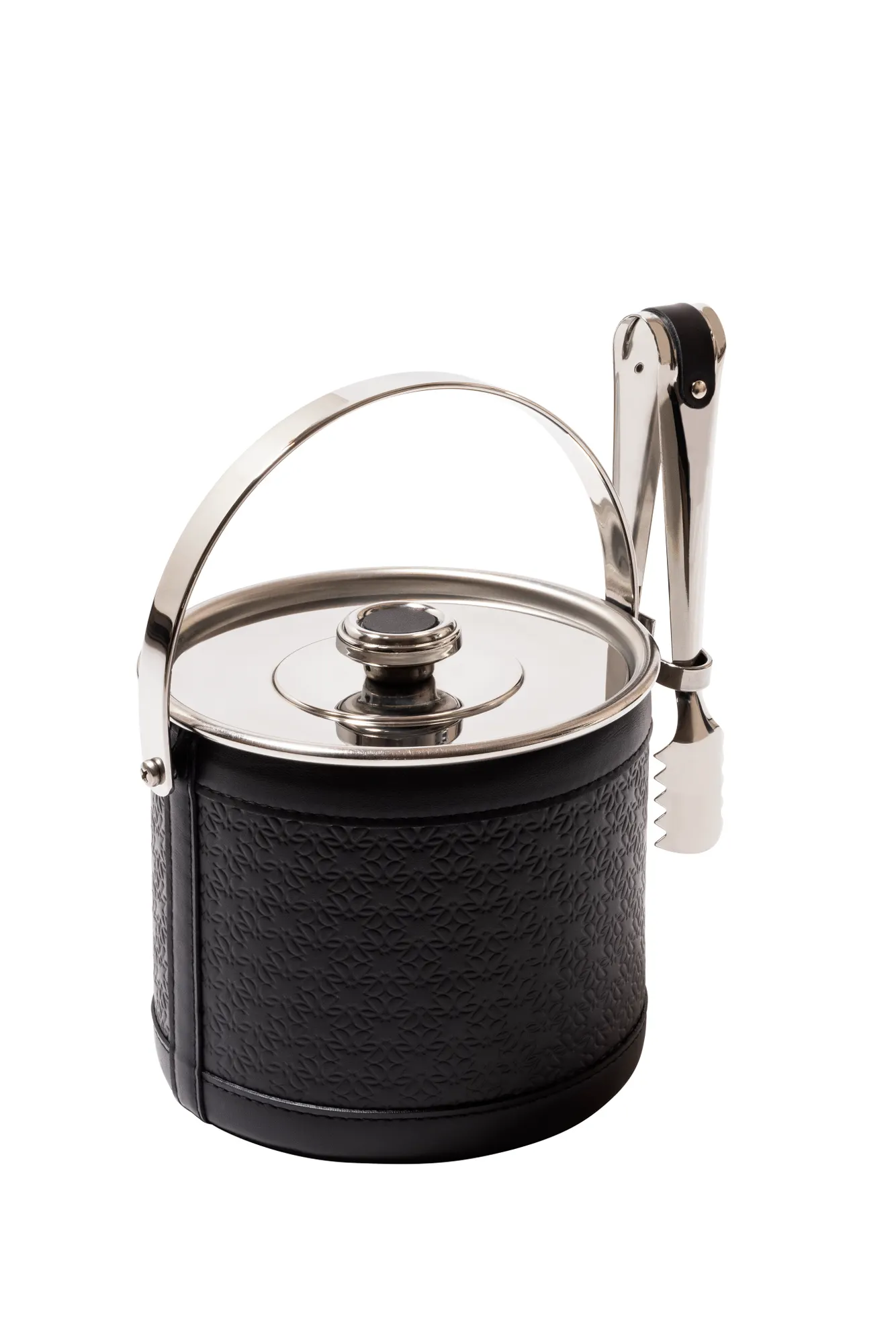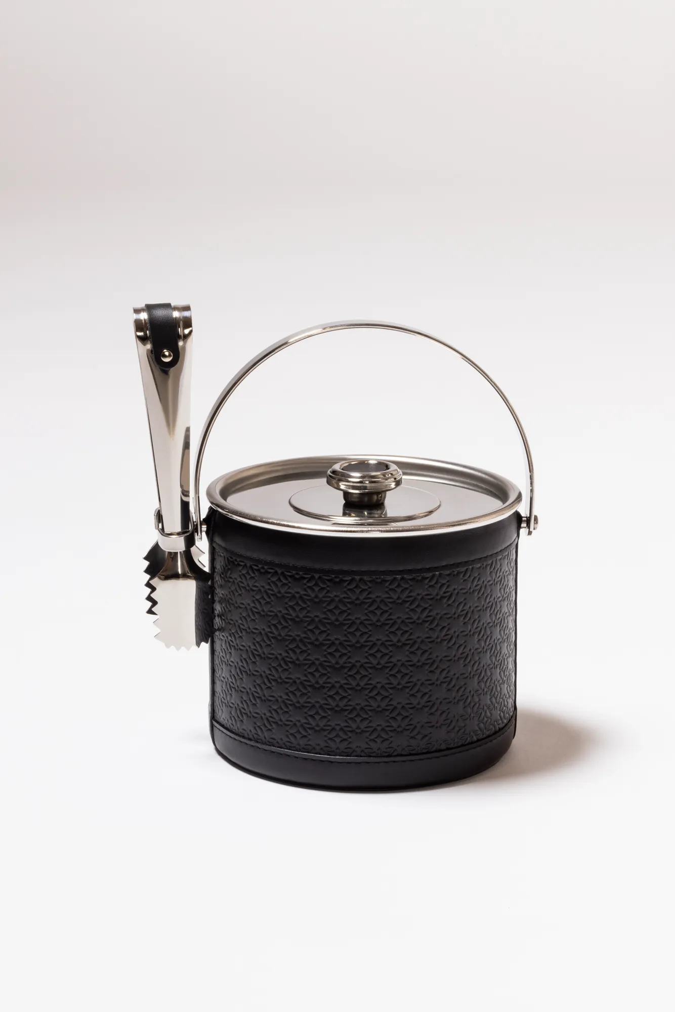 Stainless steel ice bucket covered with leather featuring the ELIE SAAB Monogram pattern on two sides.