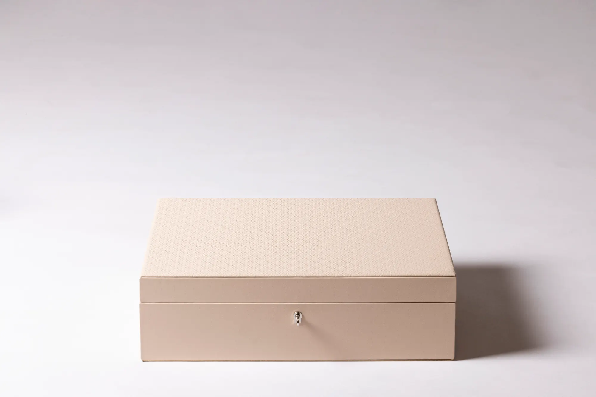 Leather glasses box with six spaces, suede lining and hinged leather lid featuring the ELIE SAAB Monogram pattern.