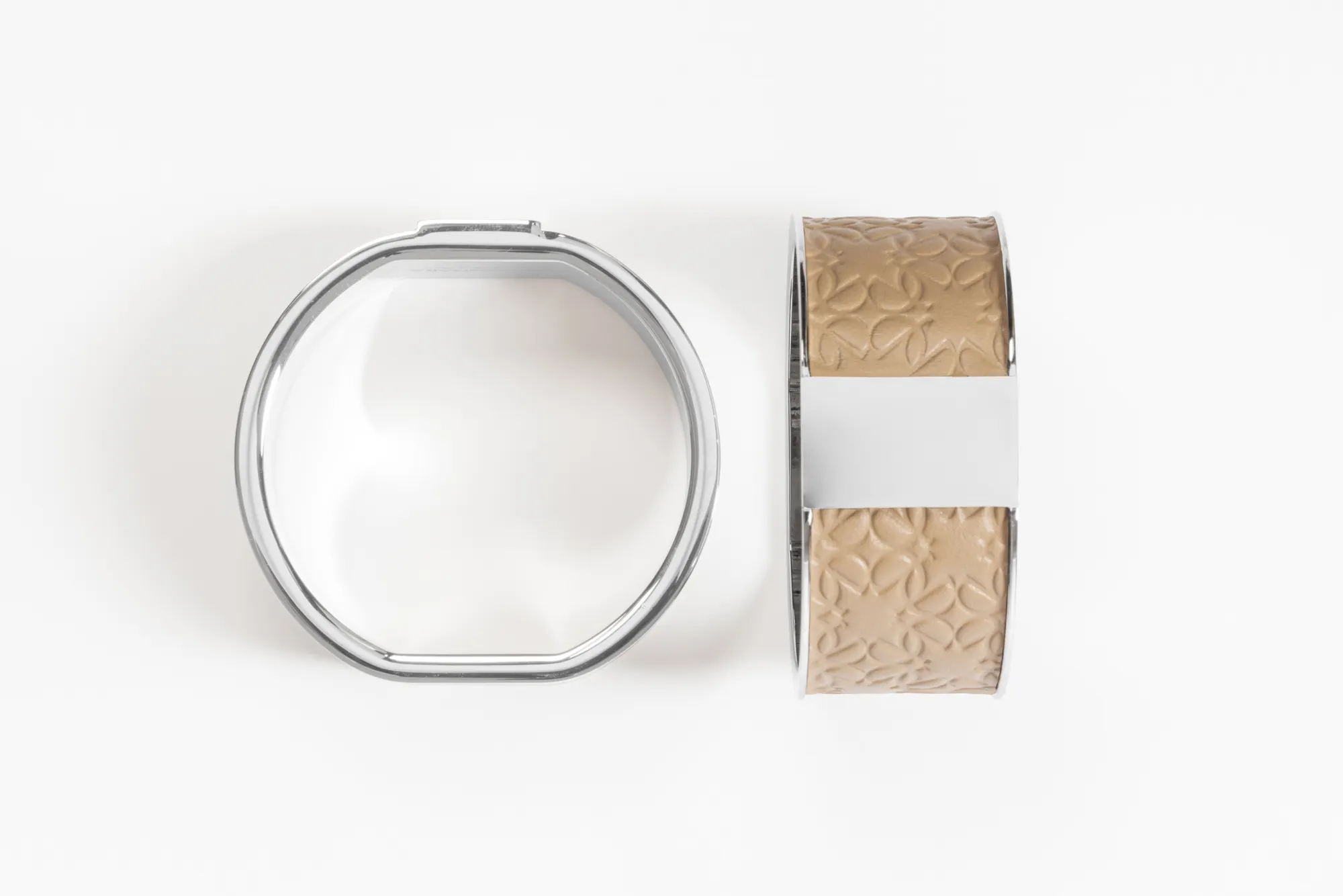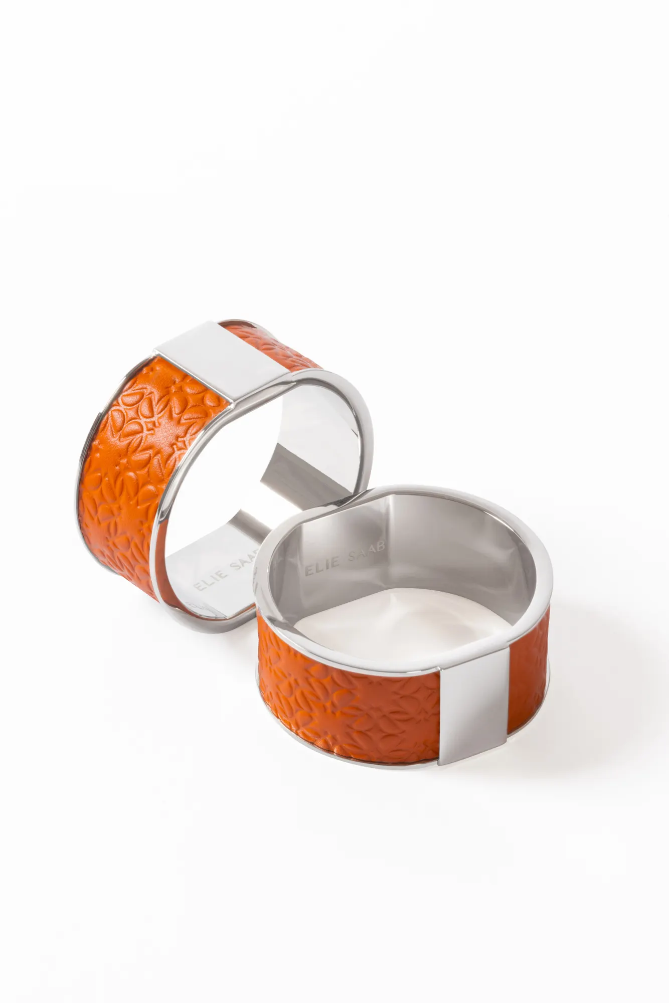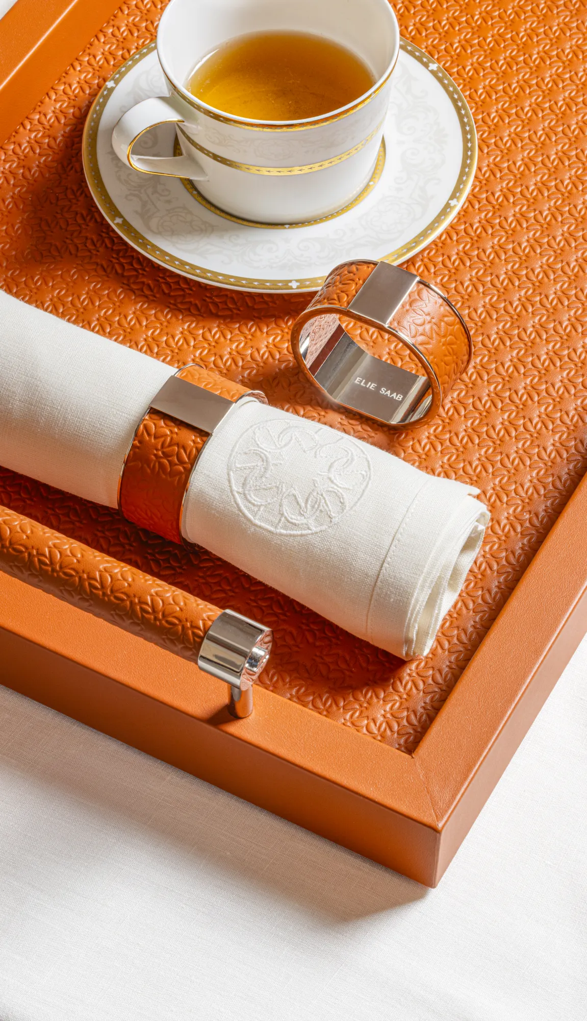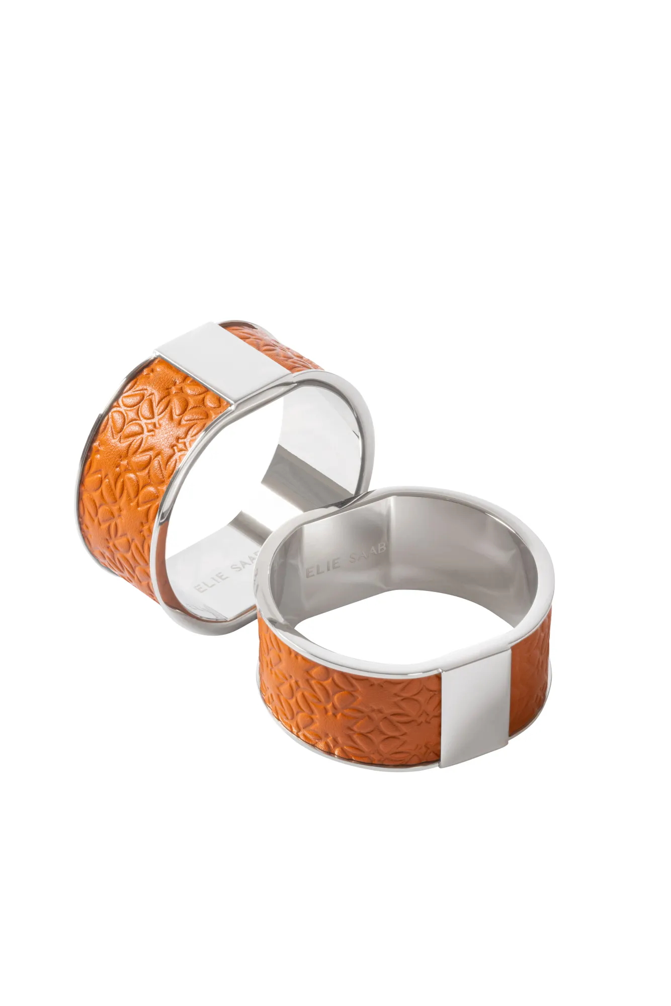Set of 2 napkin rings made of polished palladium and padded leather featuring the ELIE SAAB Monogram pattern.