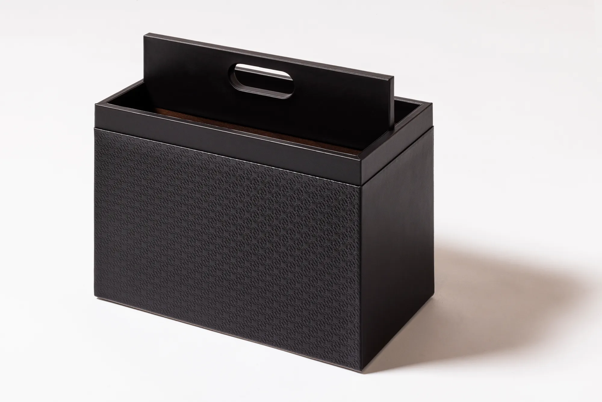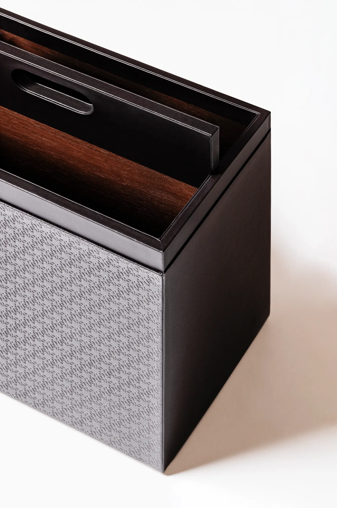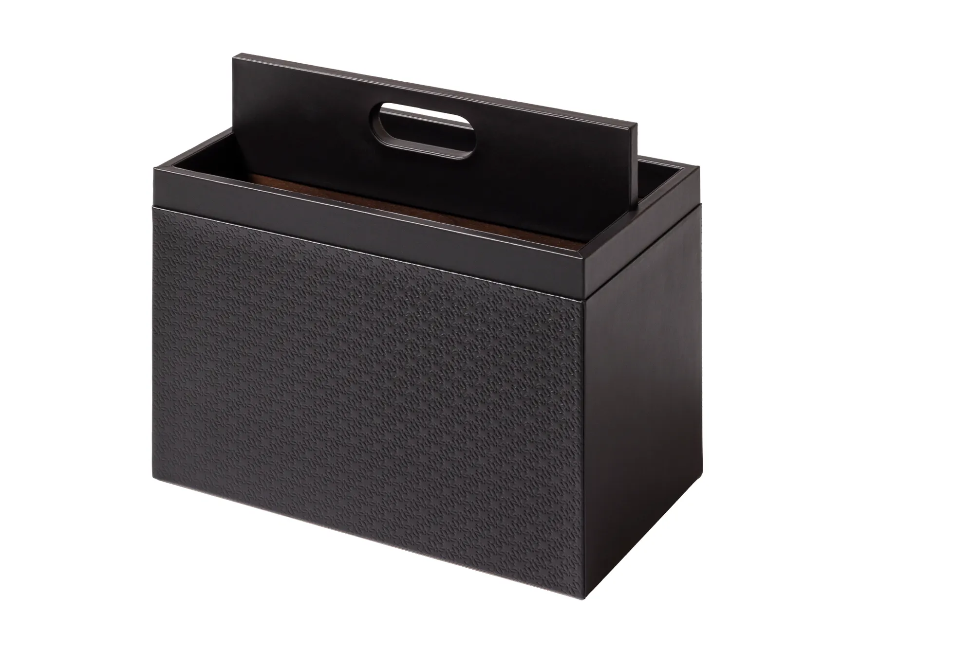 Leather magazine holder featuring the ELIE SAAB Monogram pattern on two sides, lining in varnished wood. It features a central divider with handle.