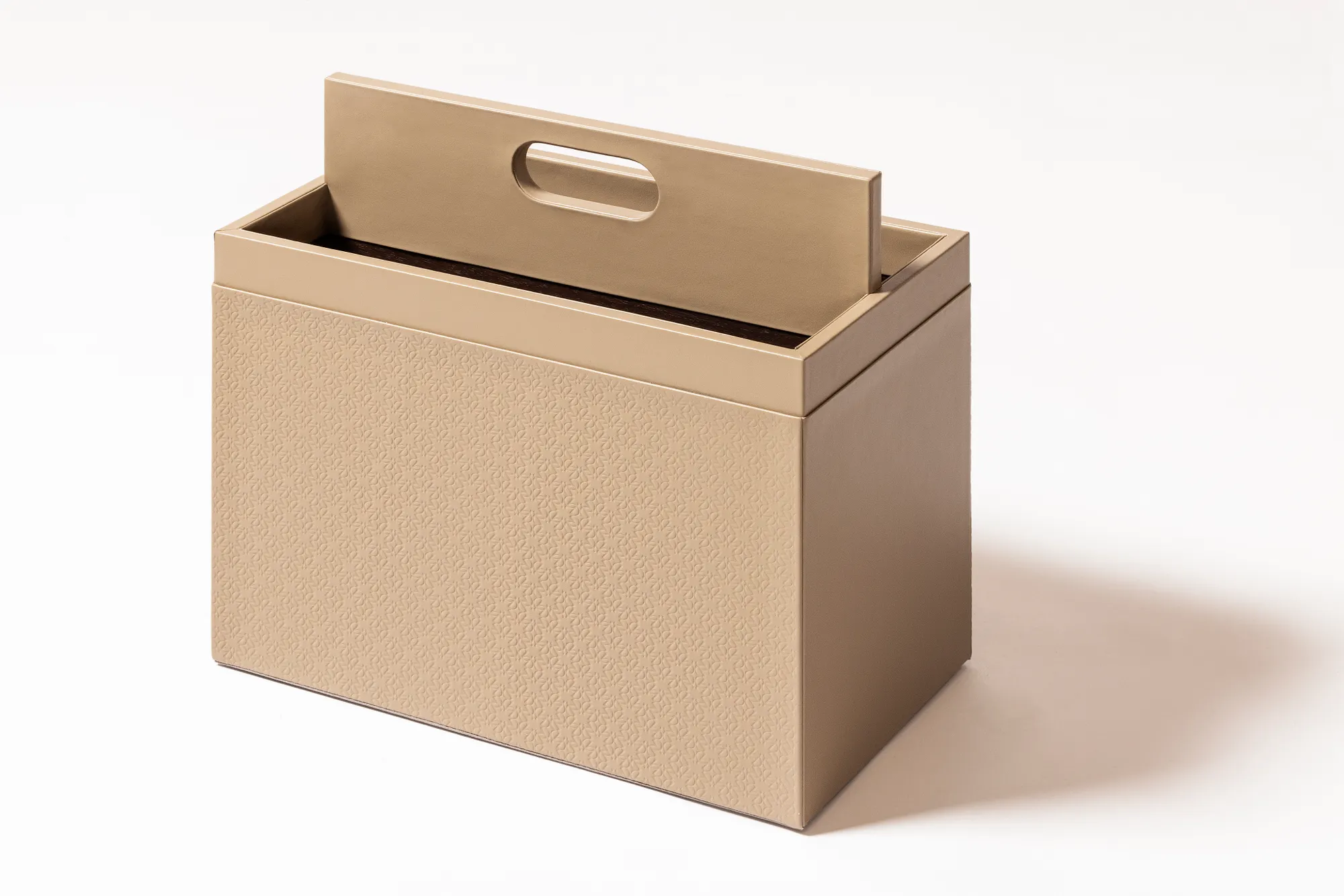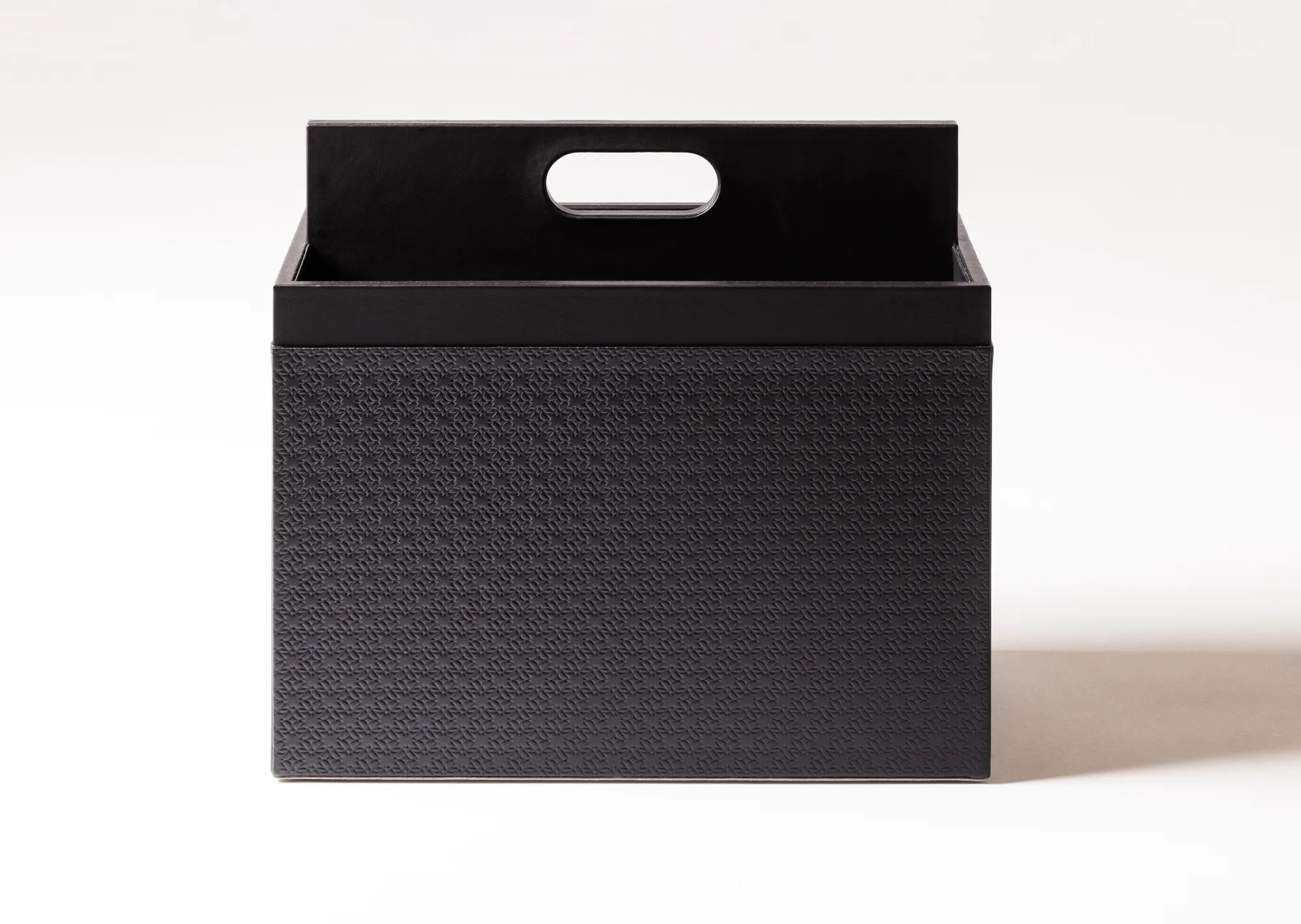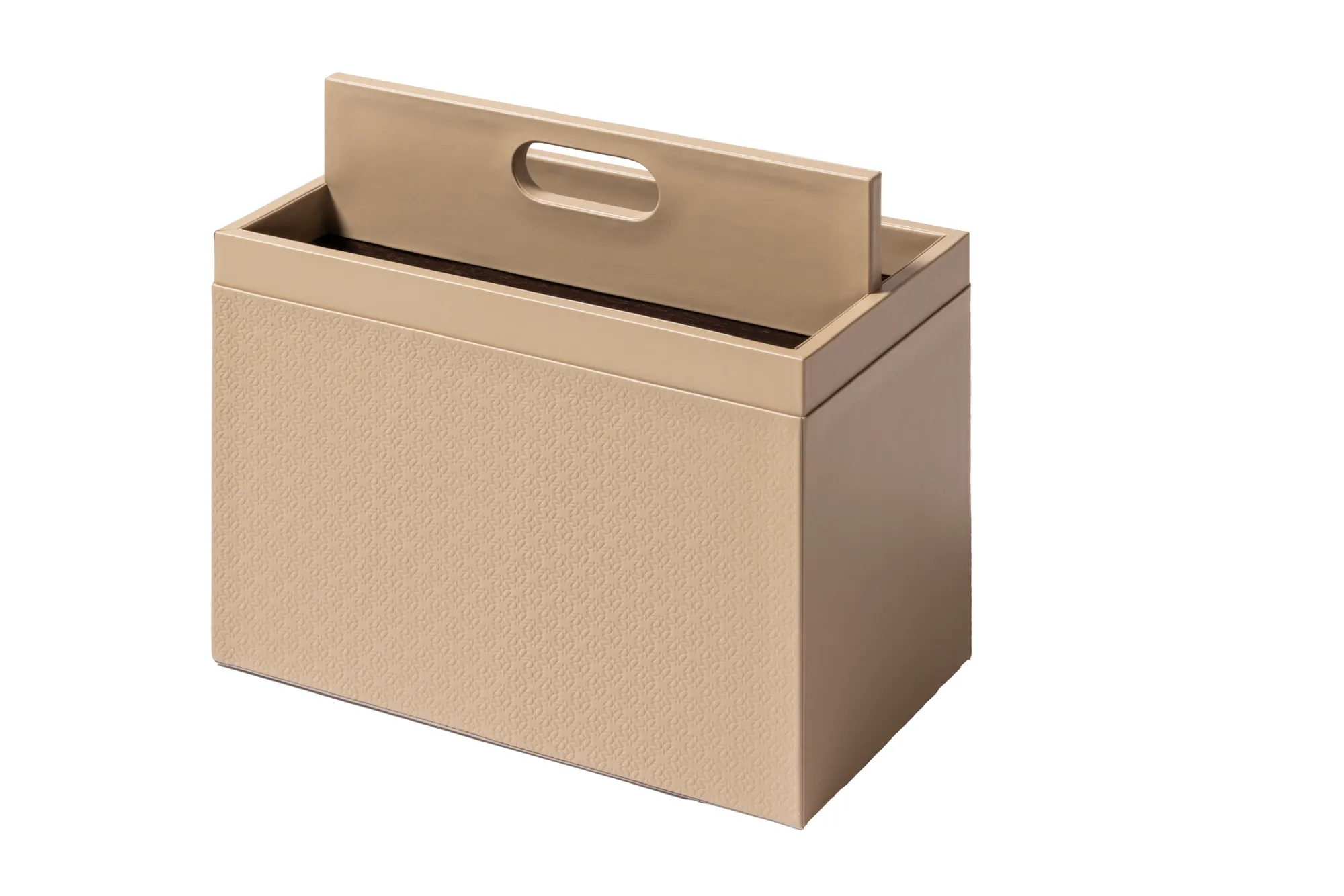Leather magazine holder featuring the ELIE SAAB Monogram pattern on two sides, lining in varnished wood. It features a central divider with handle.