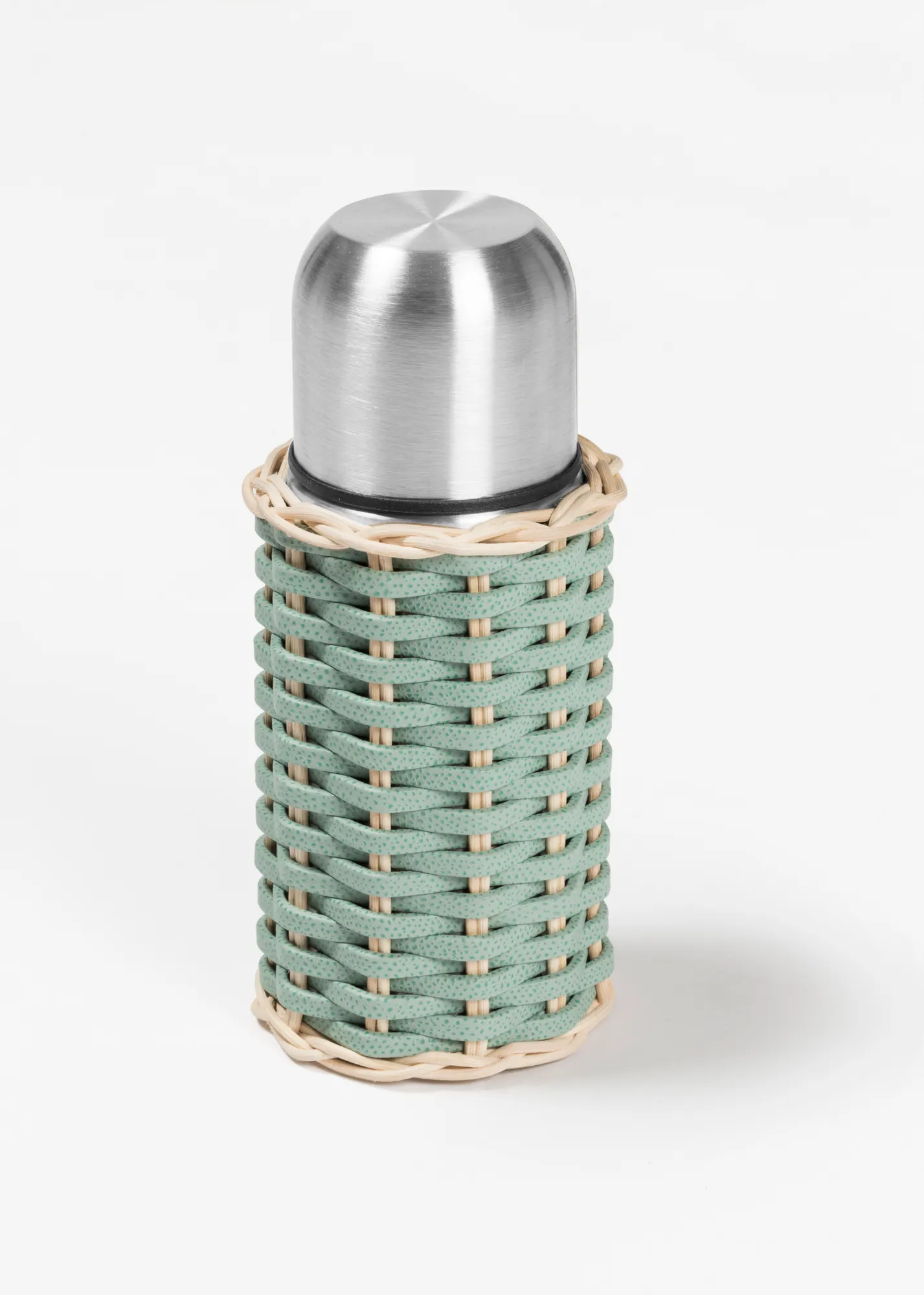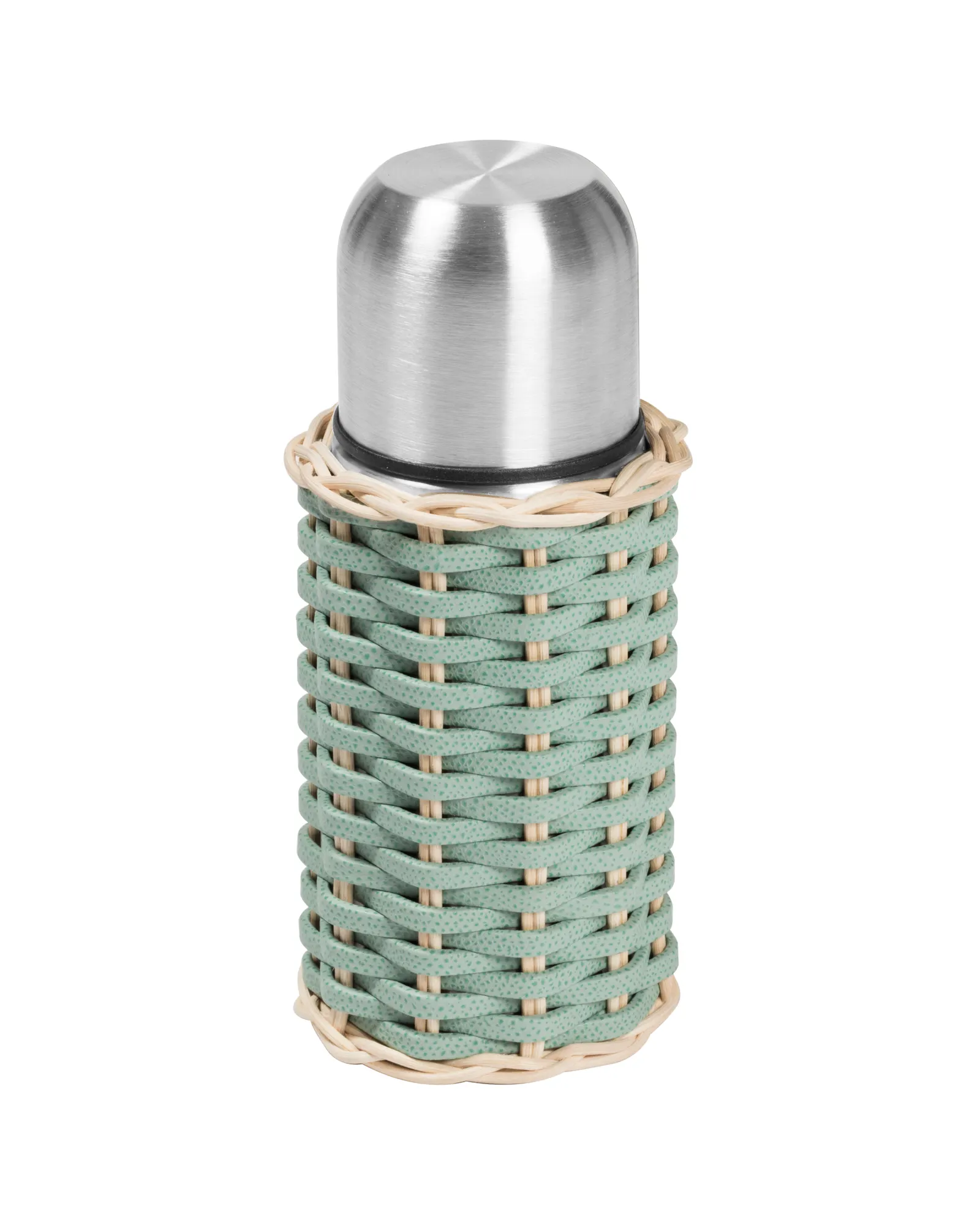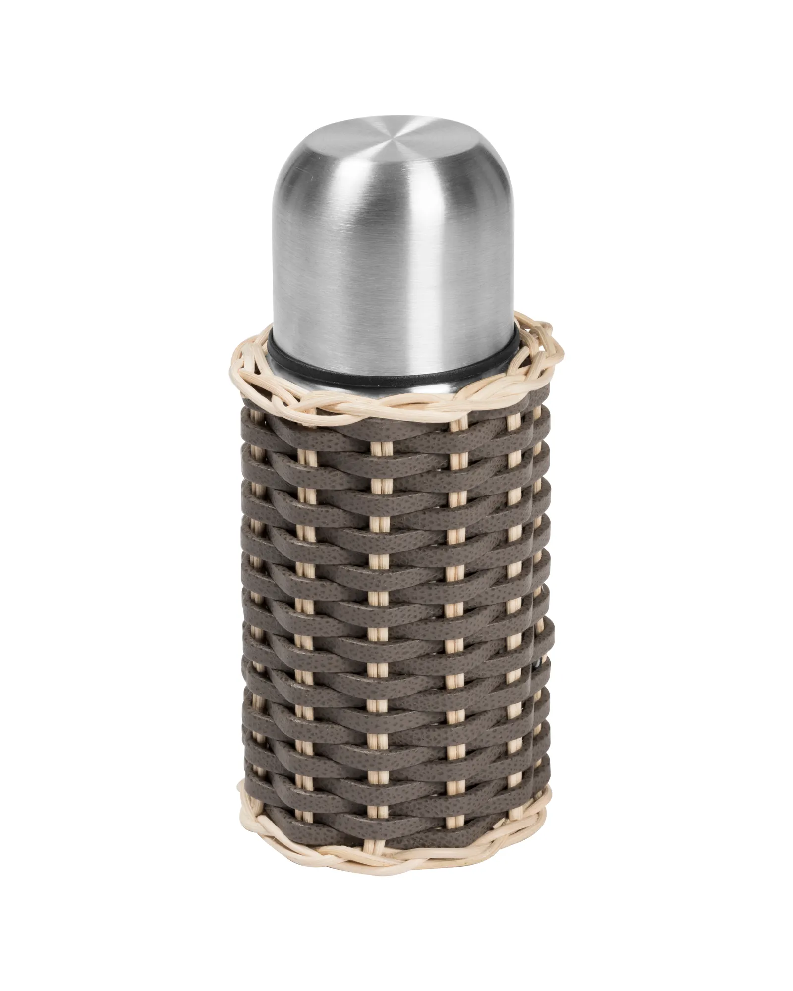 Vacuum flask partially willow covered covered in woven leather and rattan with a stainless steel double walled body. Features a wide opening, quickstop system for easy pouring and removable drinking mug.