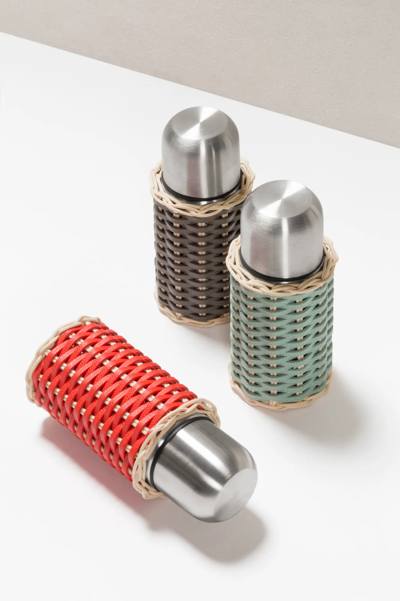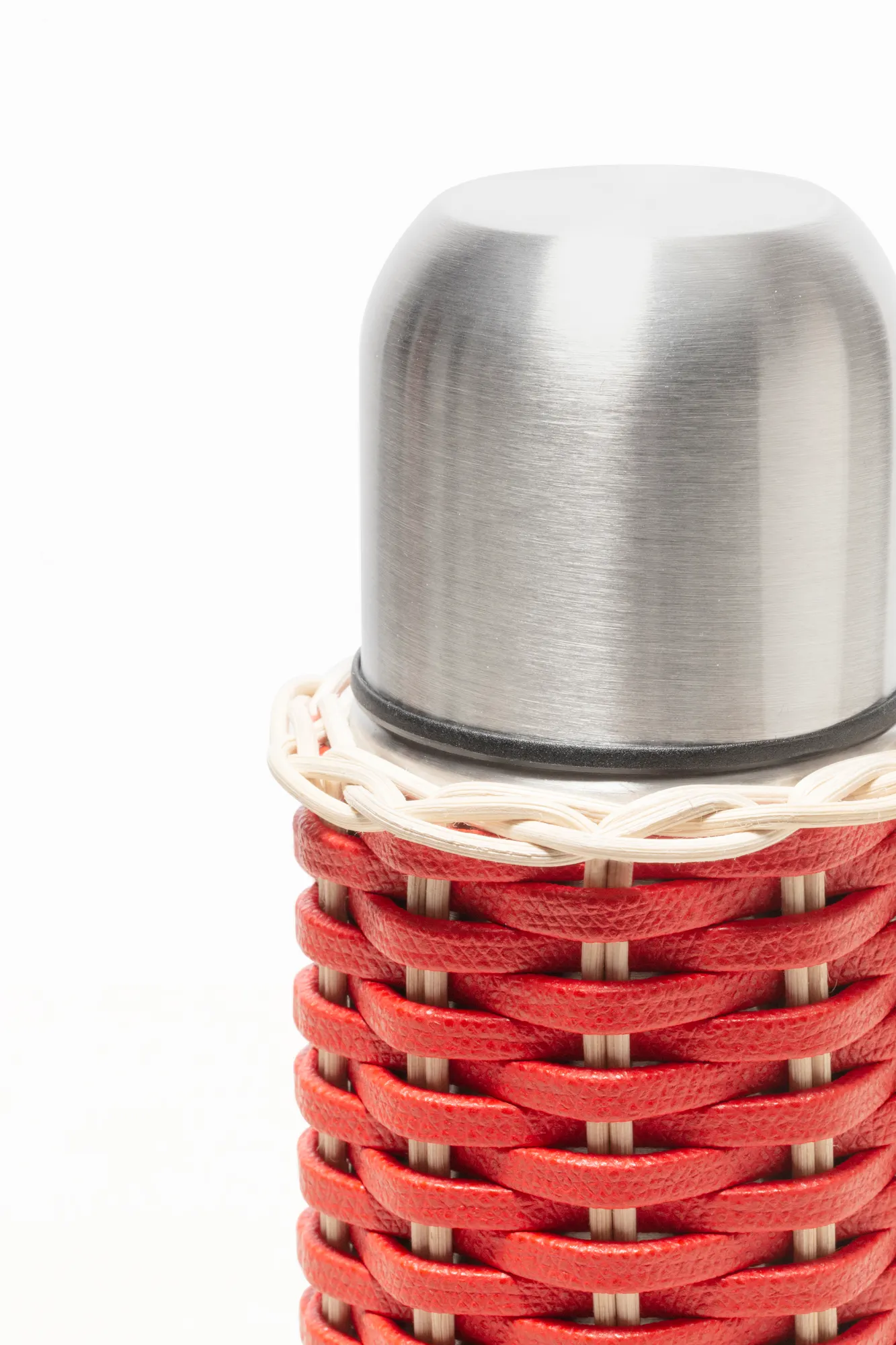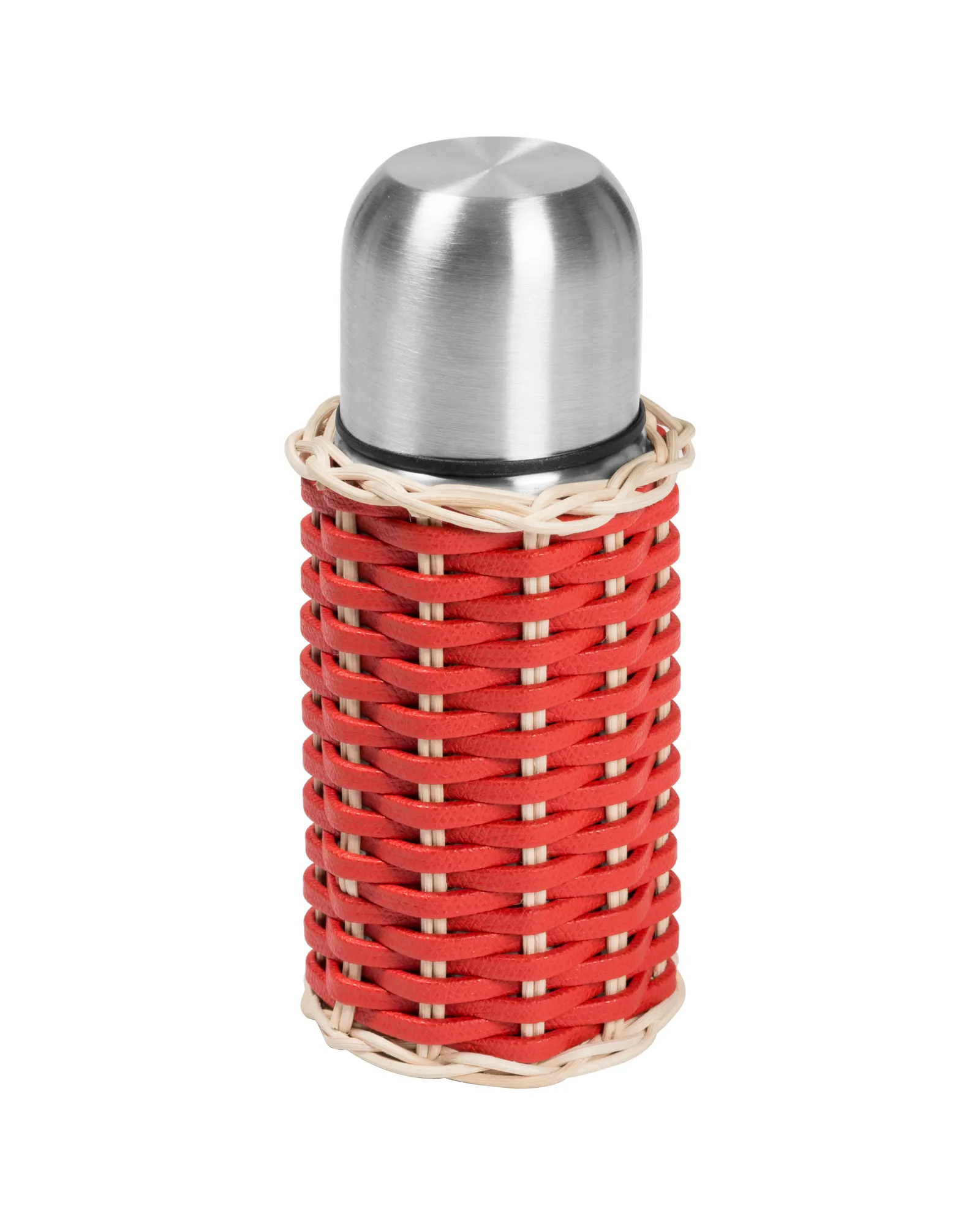 Vacuum flask partially willow covered covered in woven leather and rattan with a stainless steel double walled body. Features a wide opening, quickstop system for easy pouring and removable drinking mug.