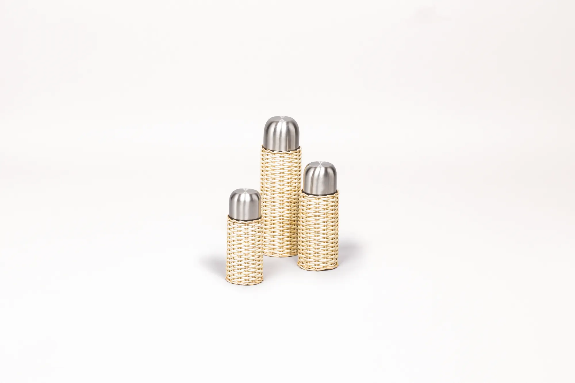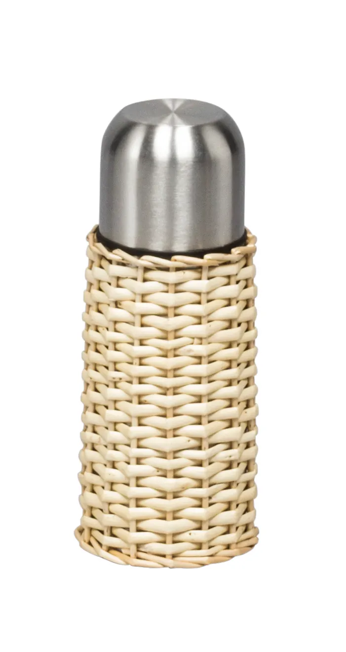 Partially rattan covered vacuum flask with a stainless steel double walled body. Features a wide opening, quickstop system for easy pouring and removable drinking mug.
