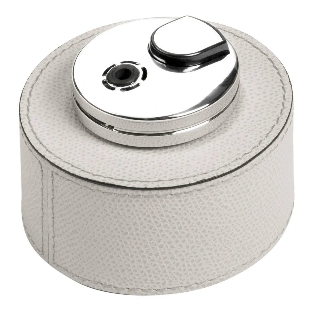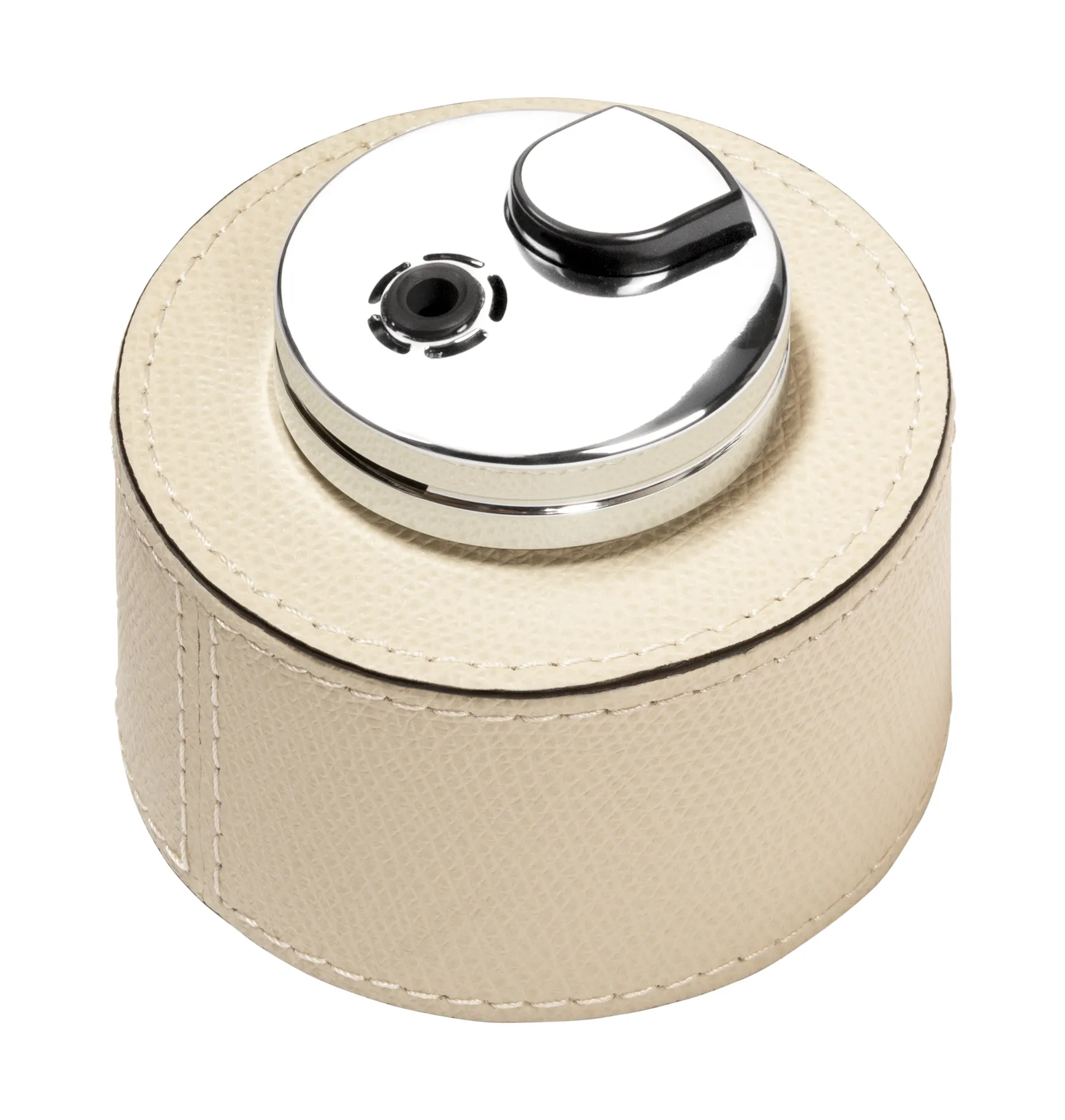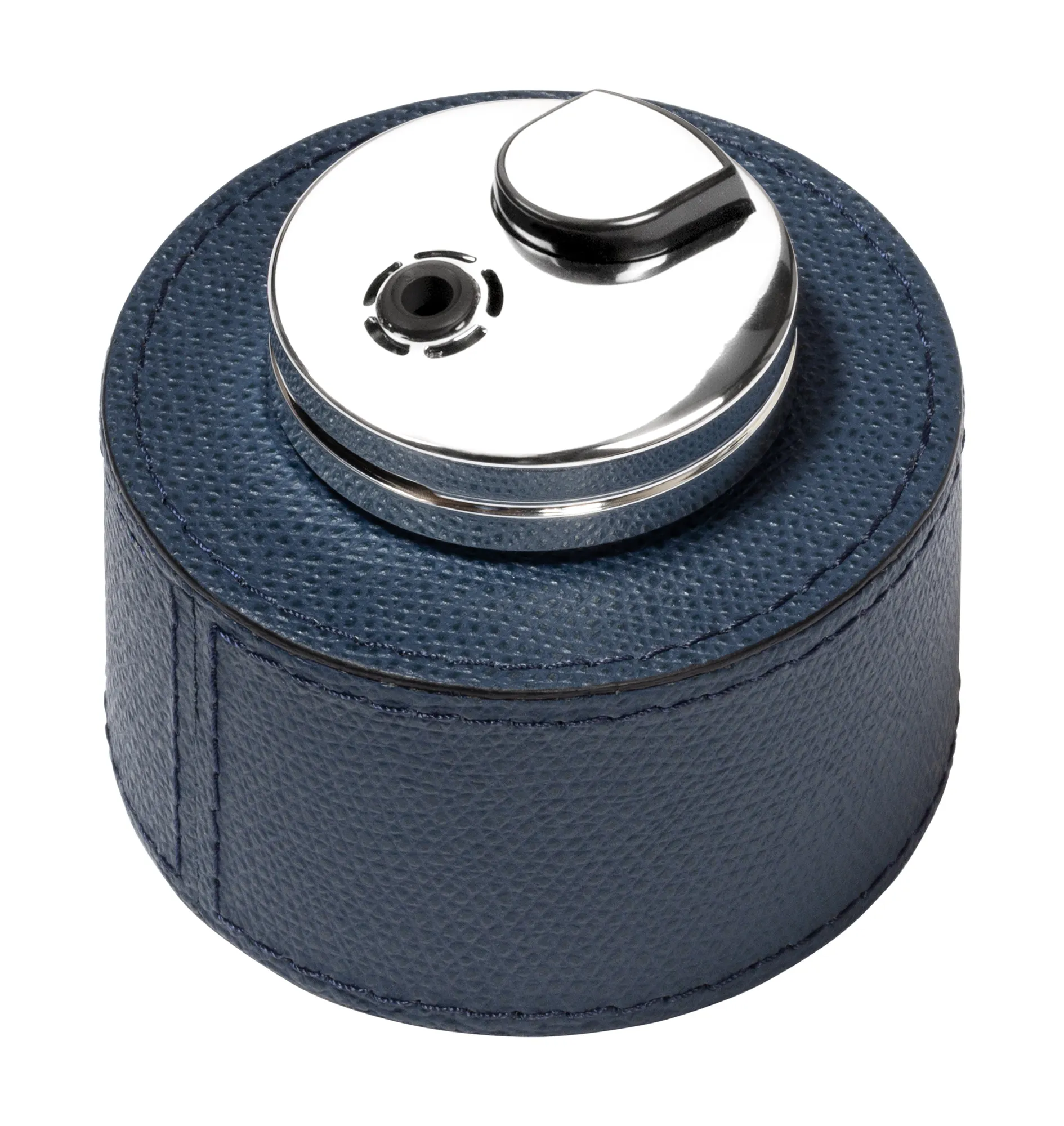 Leather covered wood structure. Refillable metal chrome lighter with piezo igniter.